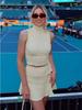 Traje de Punto de Lana para Mujer, Estilo Europeo y Americano Transfronterizo, de Cuello Alto, Manga Corta, que Muestra el Ombligo, a Rayas, Ajustado