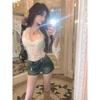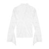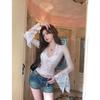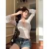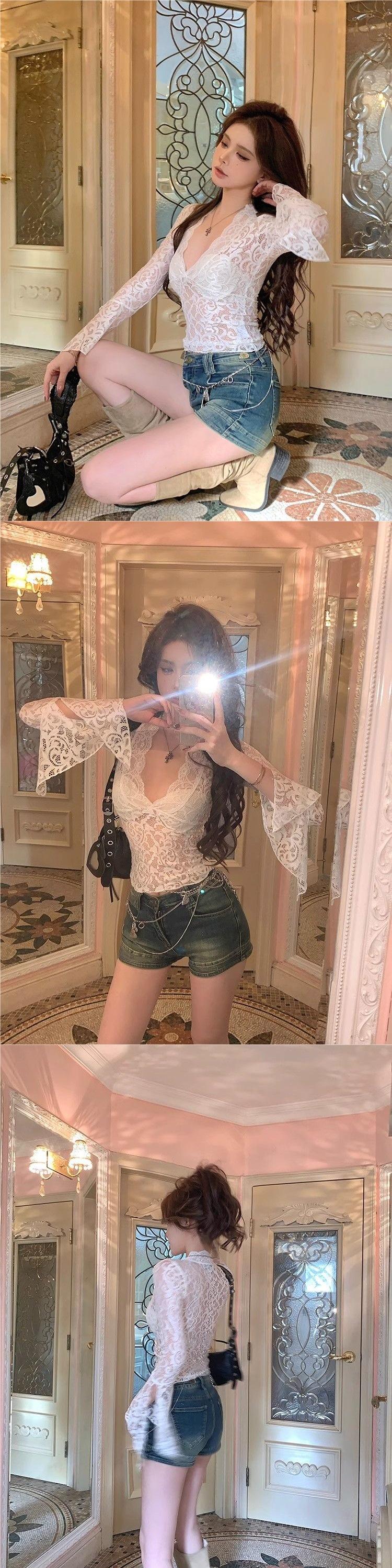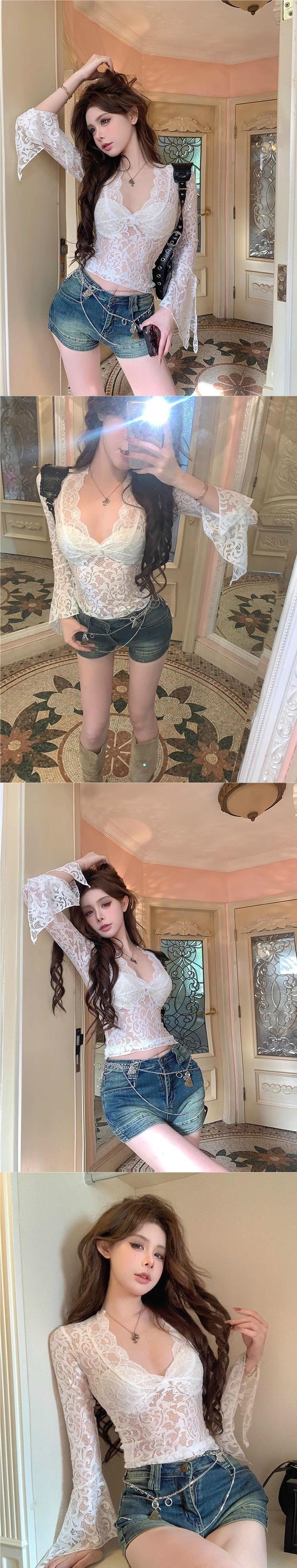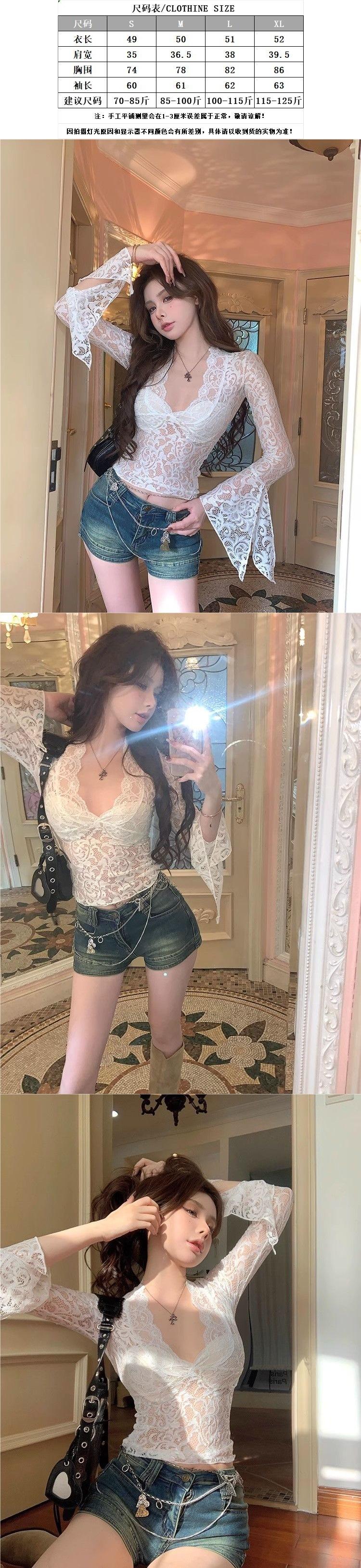Blusa de Encaje de Manga Larga con Cuello en V Calada para Mujer Principios de Otoño Deseo Puro Sexy Ajustada Capa Interior Camiseta Base Top
