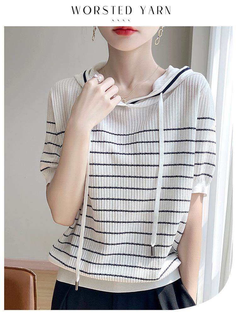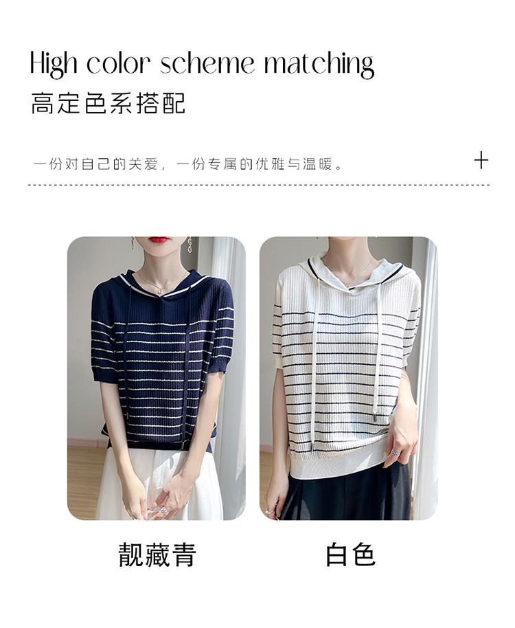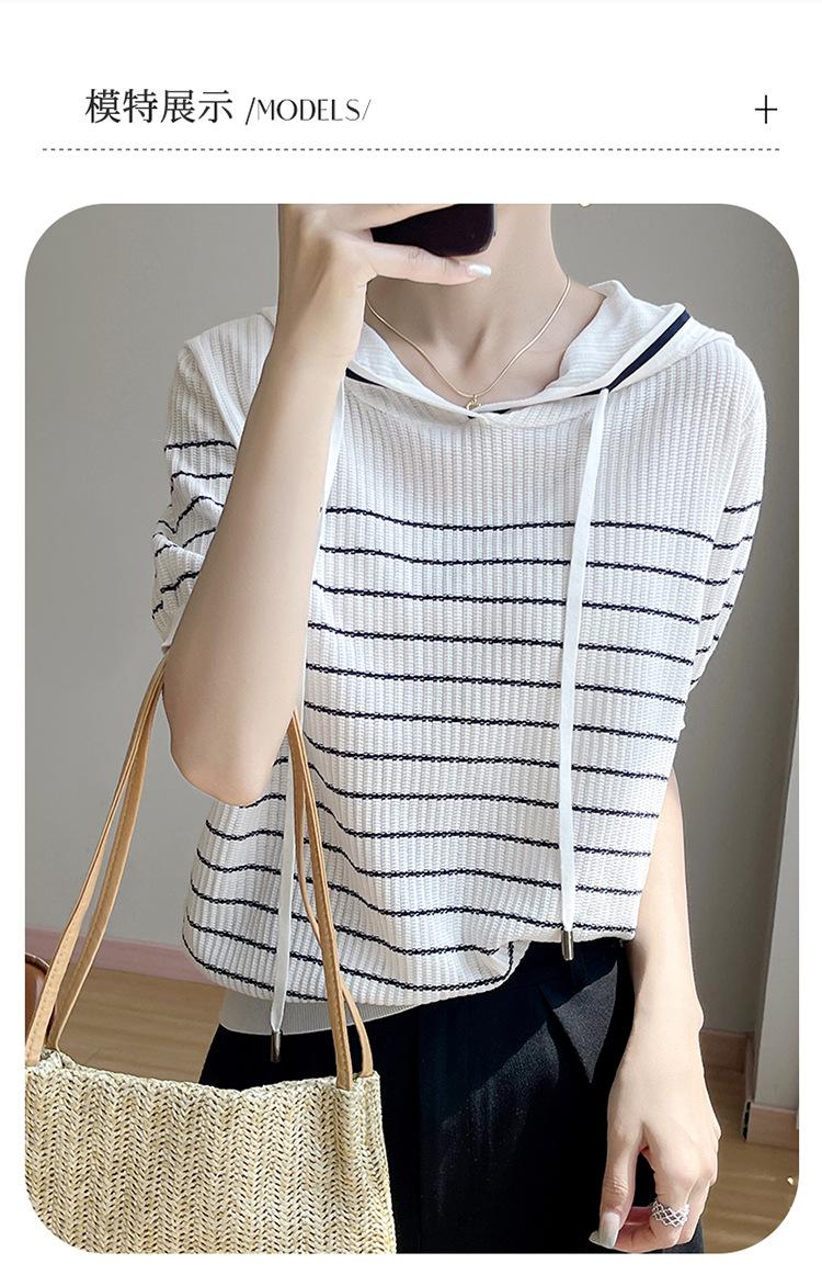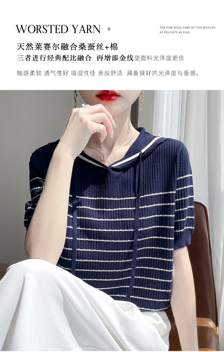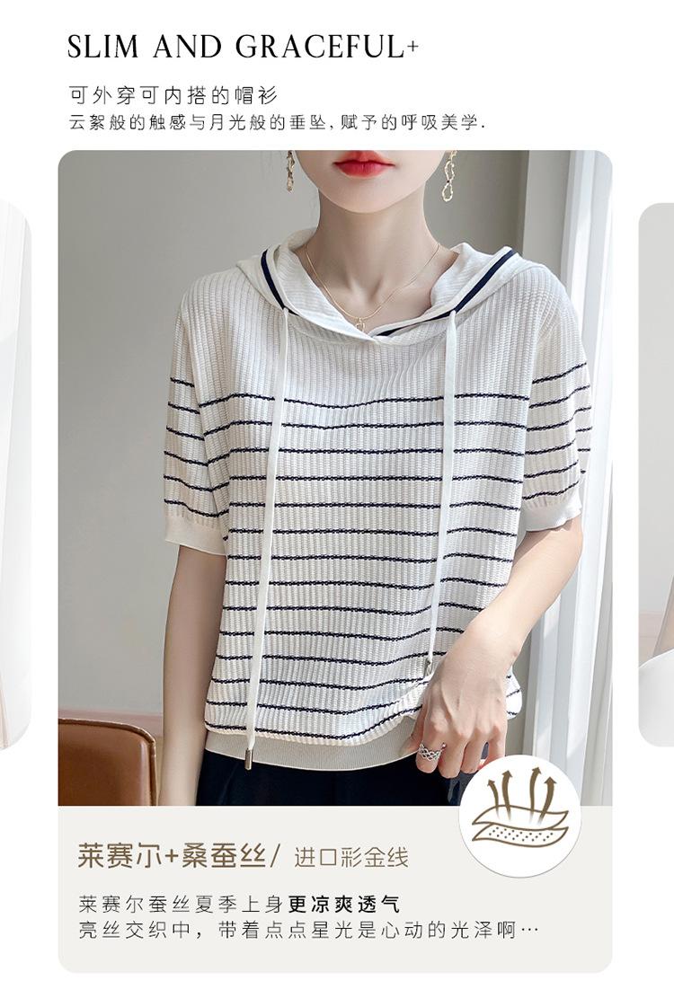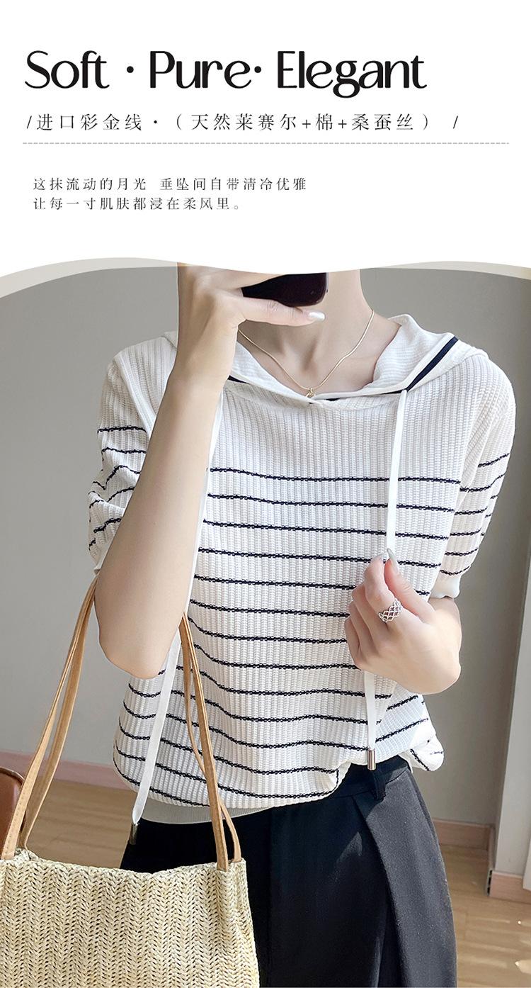 2025 Verano Nuevo Algodón Tencel Tejido de Punto con Capucha Manga Corta para Mujer Rayas Bloque de Color Suéter Camiseta Básica