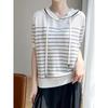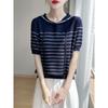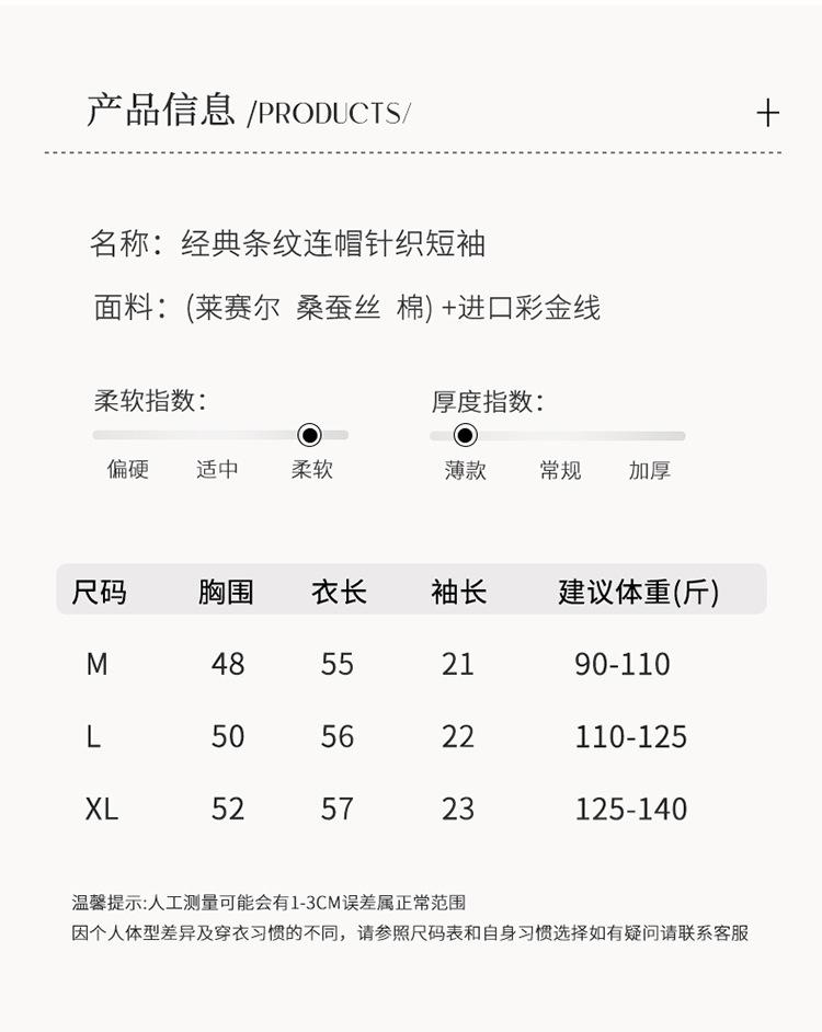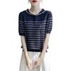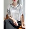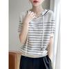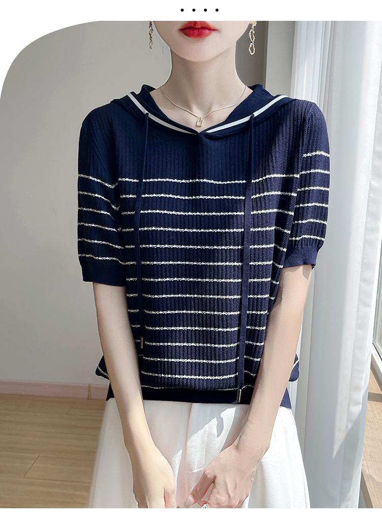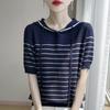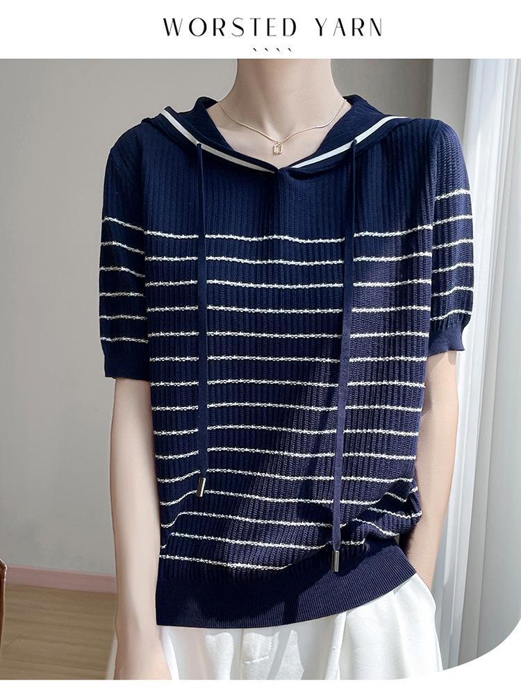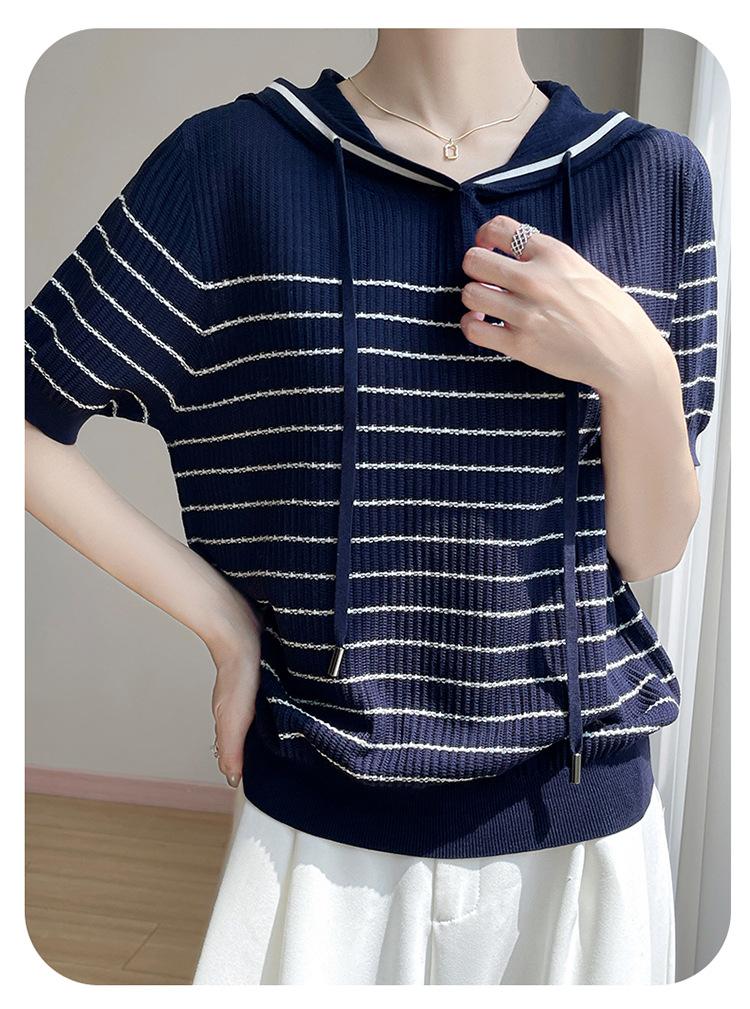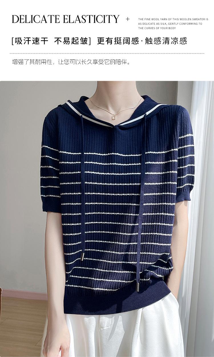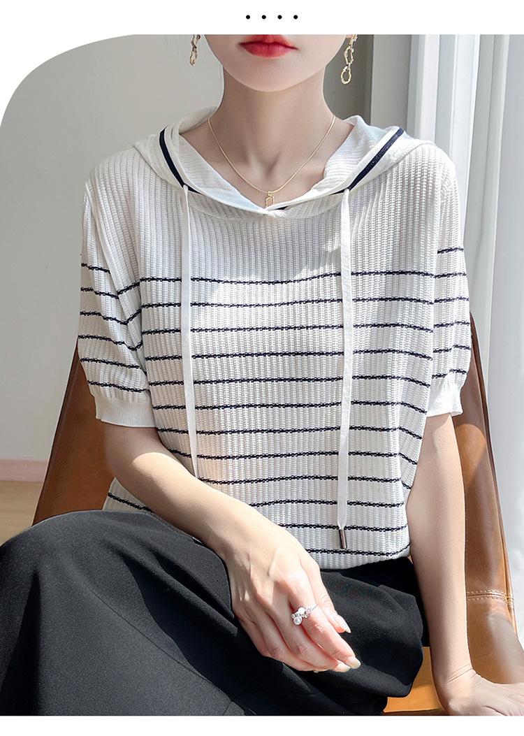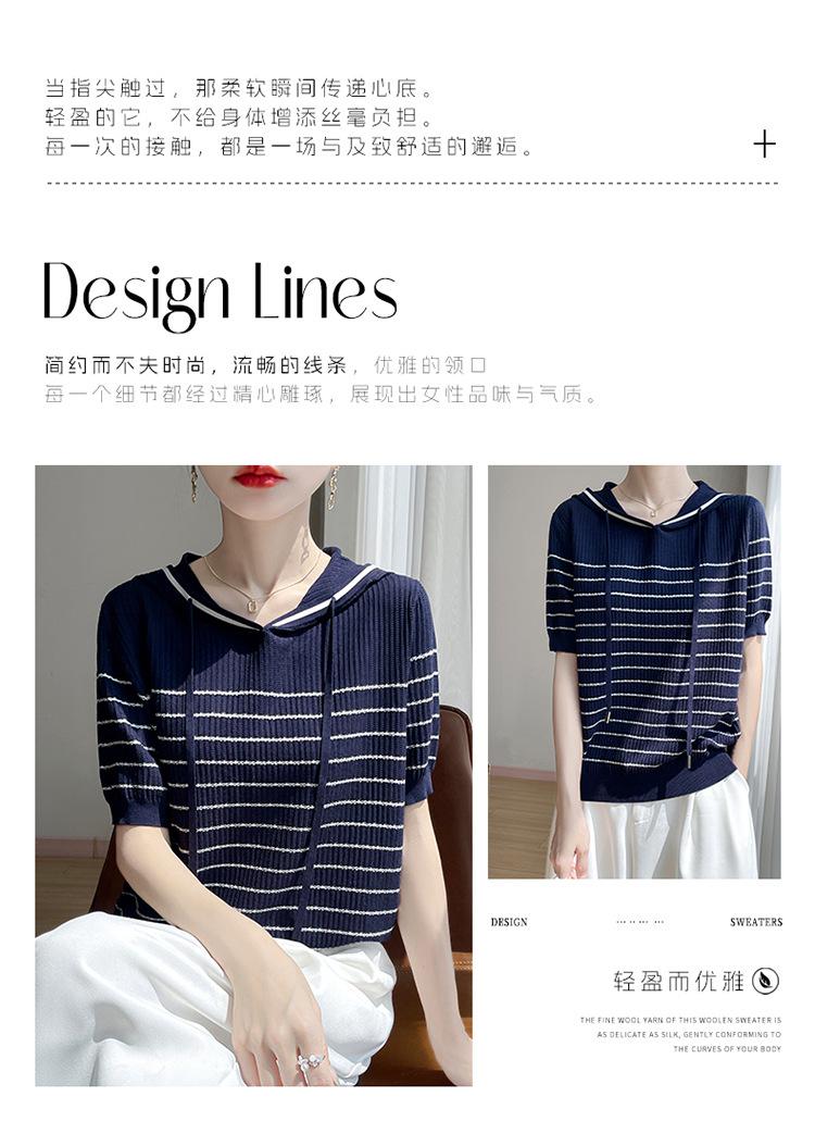 2025 Verano Nuevo Algodón Tencel Tejido de Punto con Capucha Manga Corta para Mujer Rayas Bloque de Color Suéter Camiseta Básica