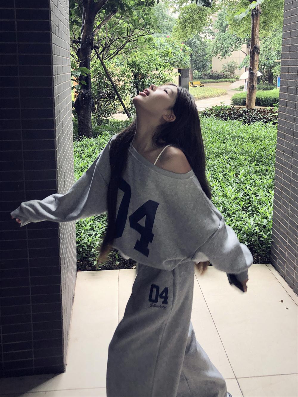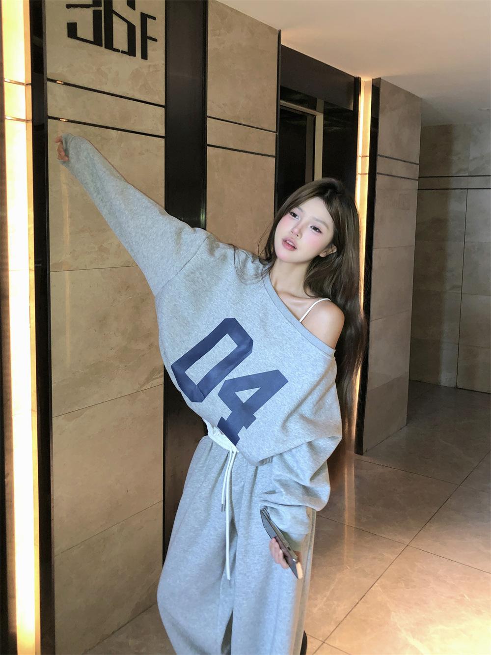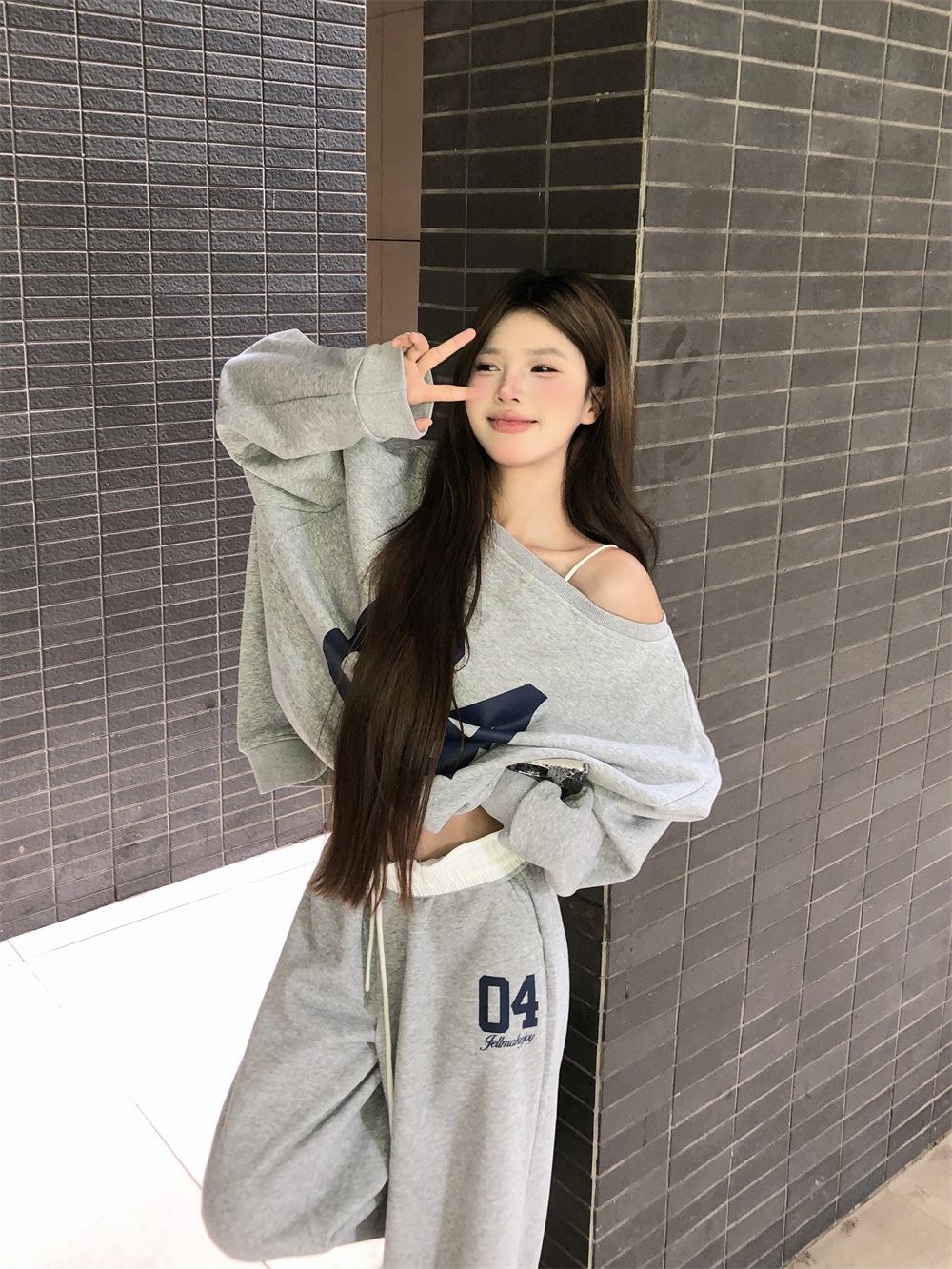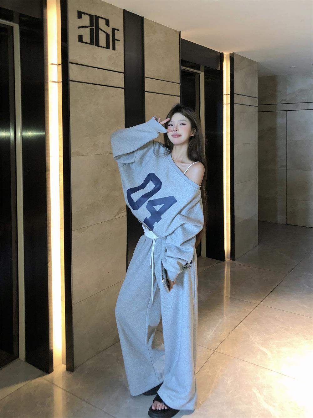 Sudadera de Punto Retro Gris de un Hombro y Manga Larga para Mujer, Conjunto de Otoño de Estilo Relajado, Pantalones Casuales de Pierna Ancha, Conjunto de Dos Piezas