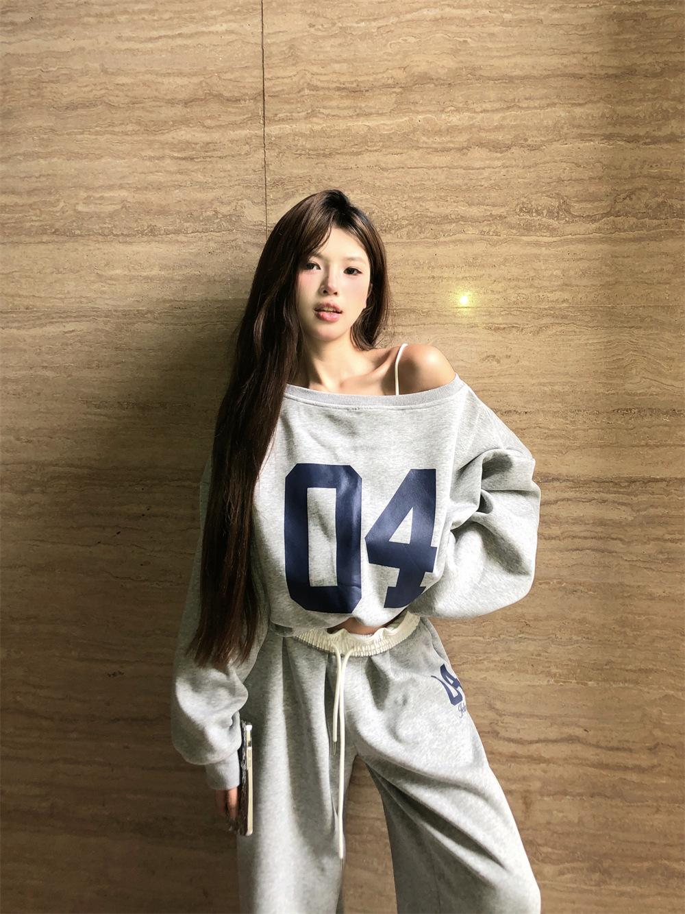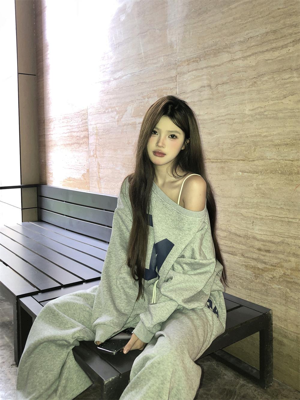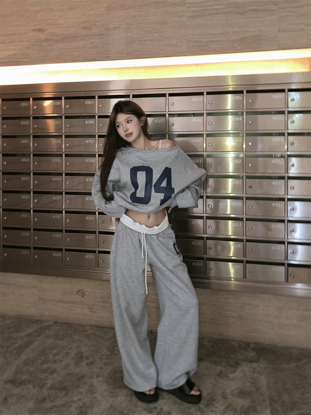Sudadera de Punto Retro Gris de un Hombro y Manga Larga para Mujer, Conjunto de Otoño de Estilo Relajado, Pantalones Casuales de Pierna Ancha, Conjunto de Dos Piezas