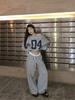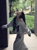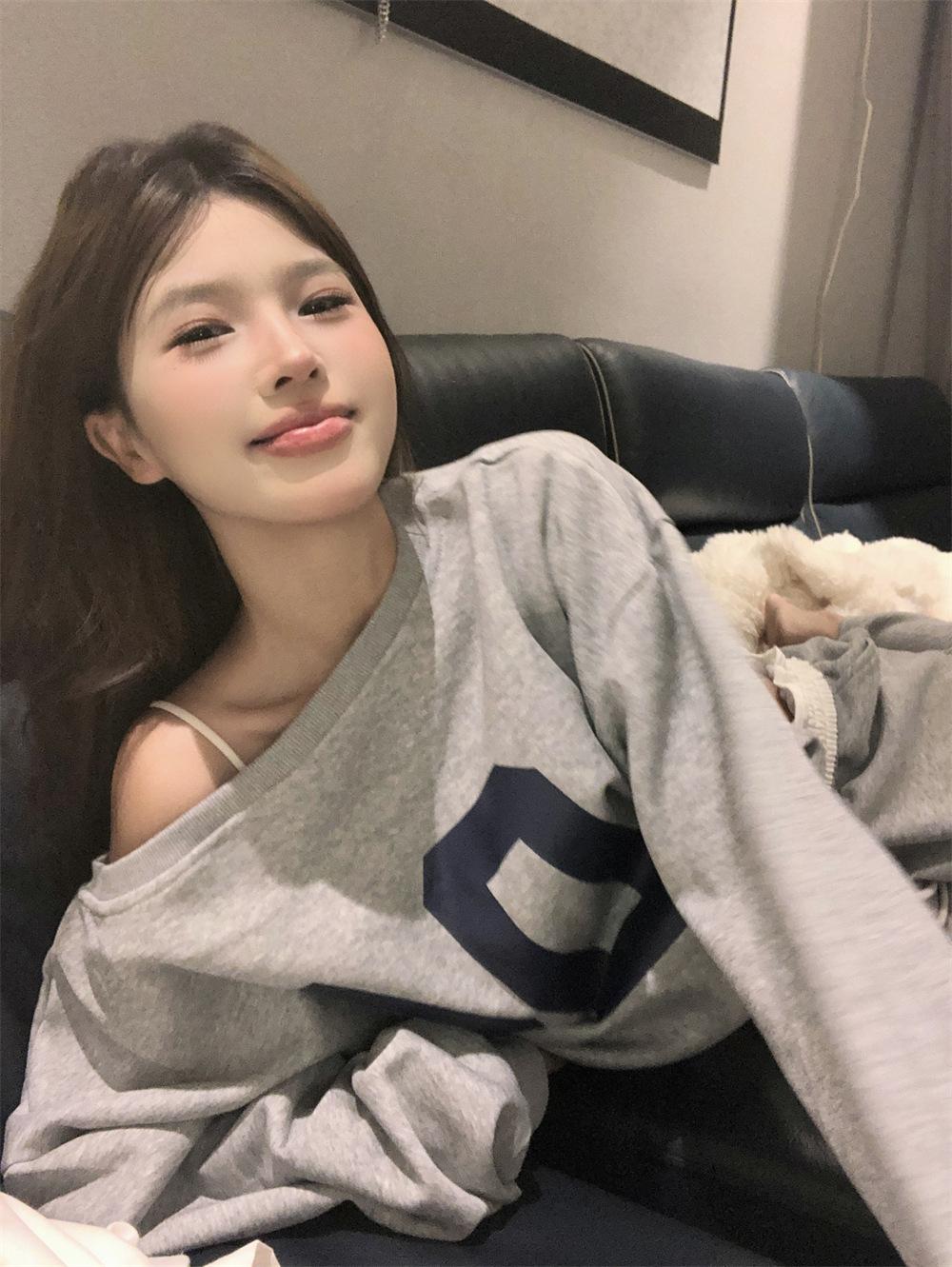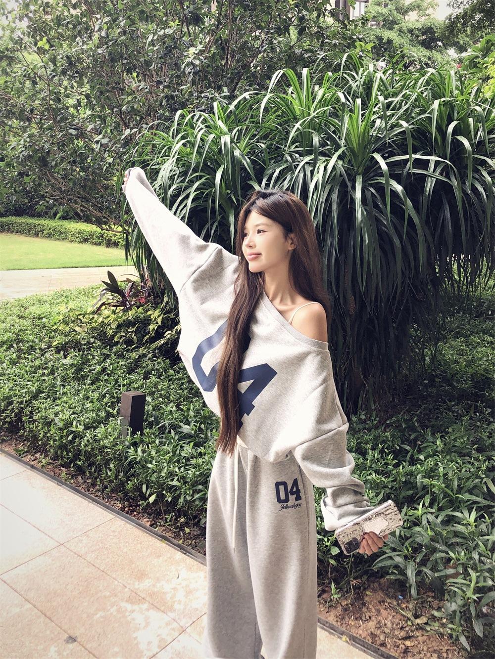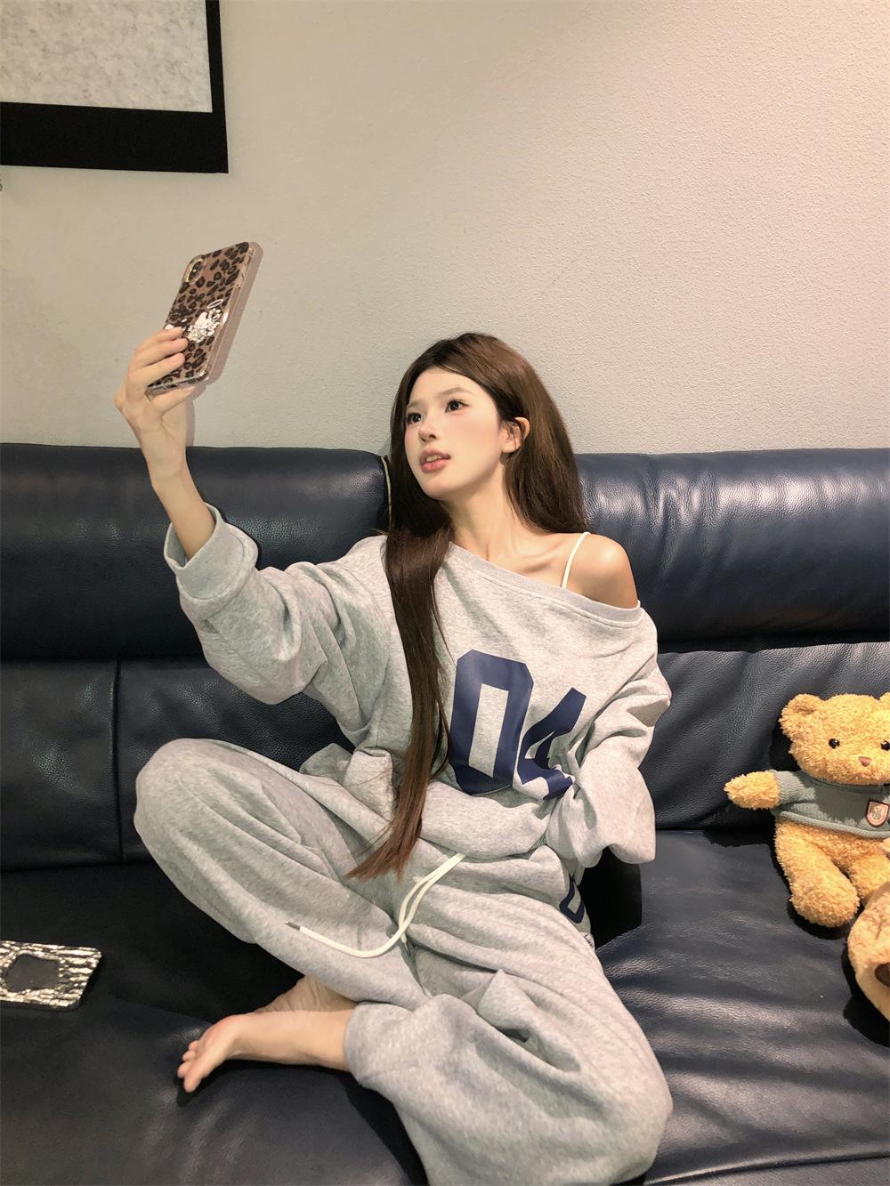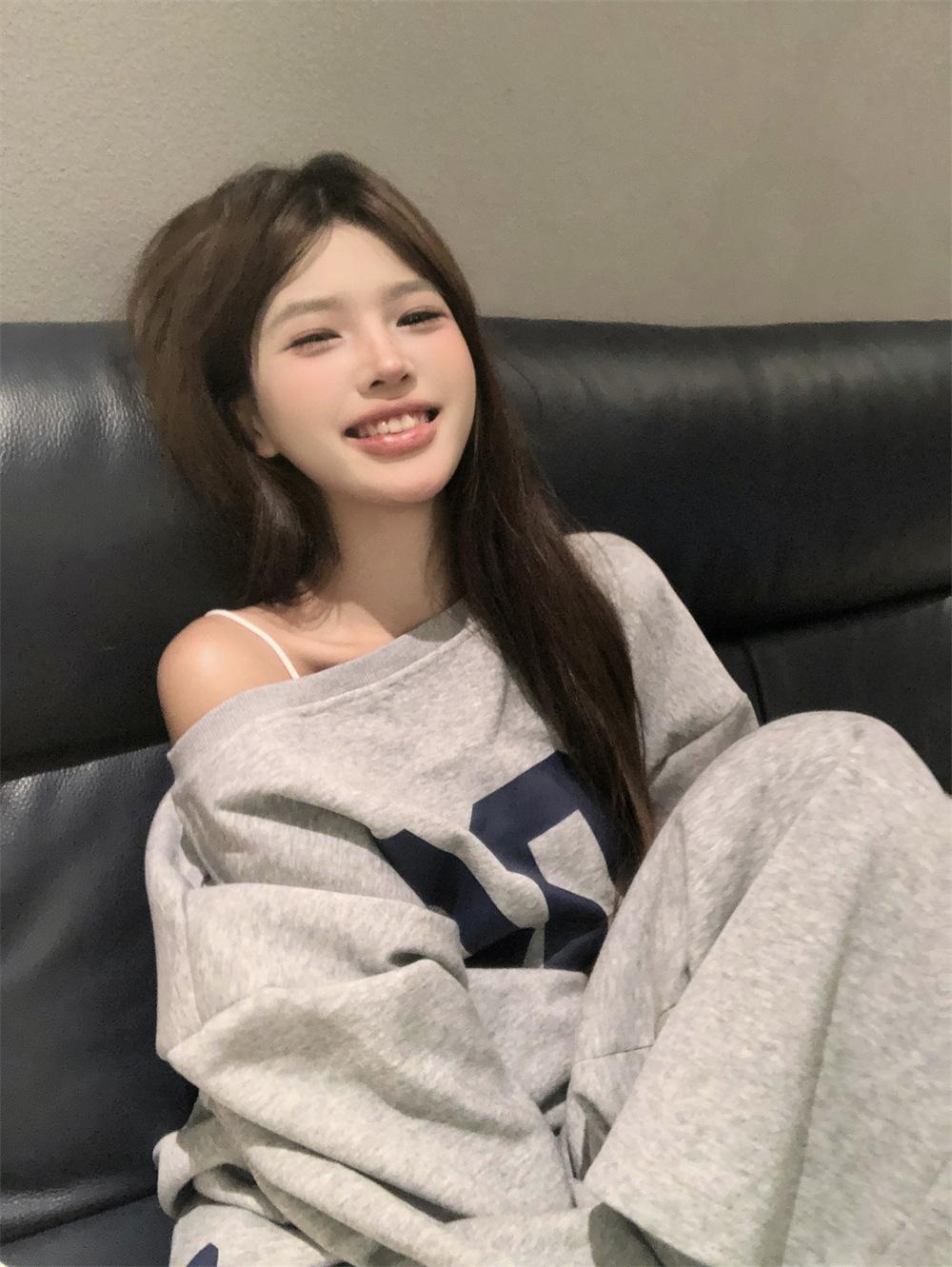 Sudadera de Punto Retro Gris de un Hombro y Manga Larga para Mujer, Conjunto de Otoño de Estilo Relajado, Pantalones Casuales de Pierna Ancha, Conjunto de Dos Piezas