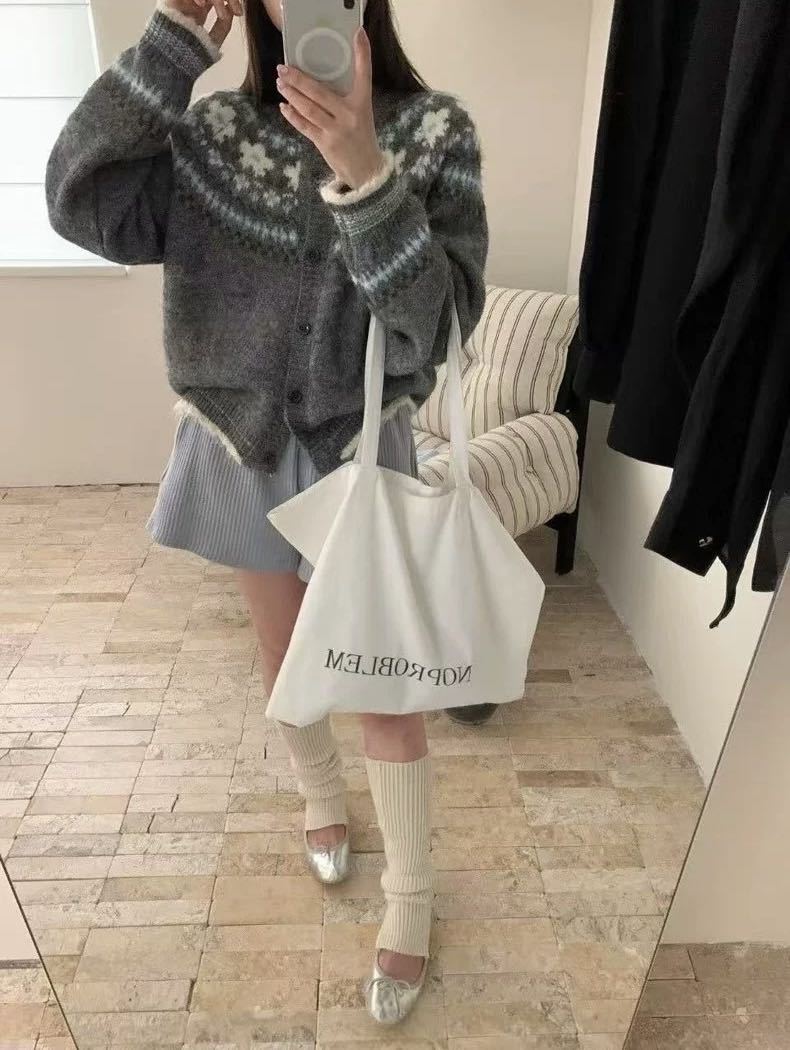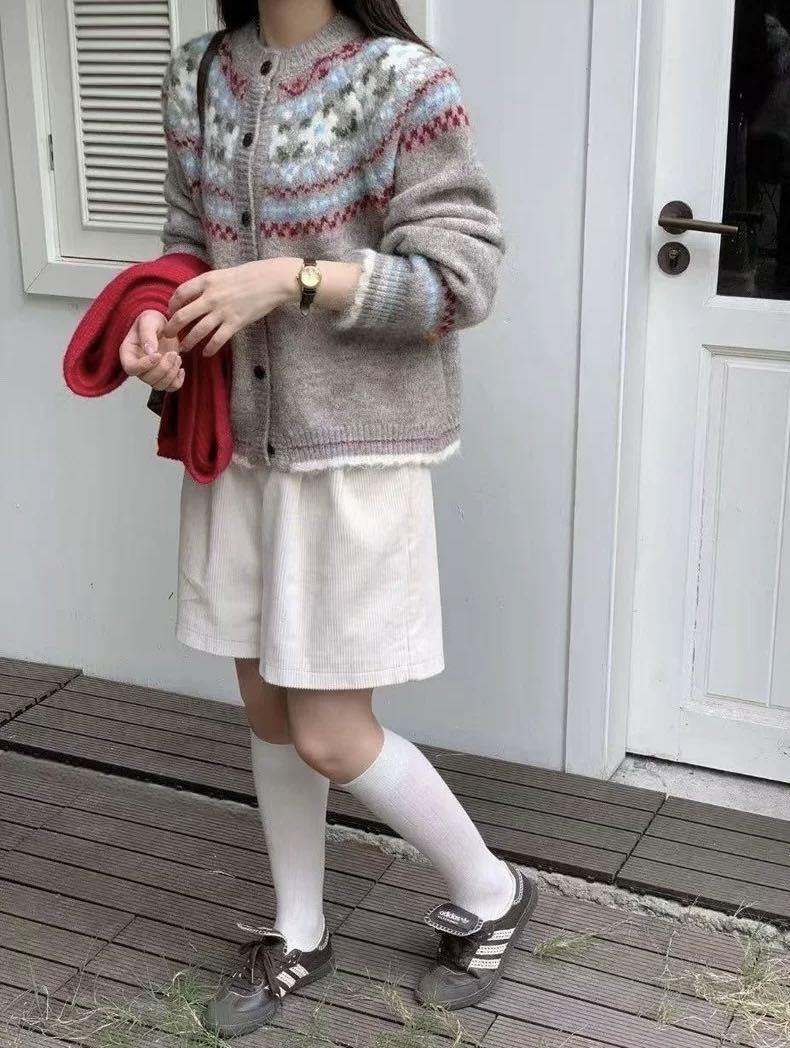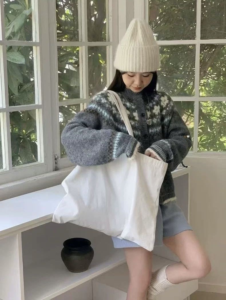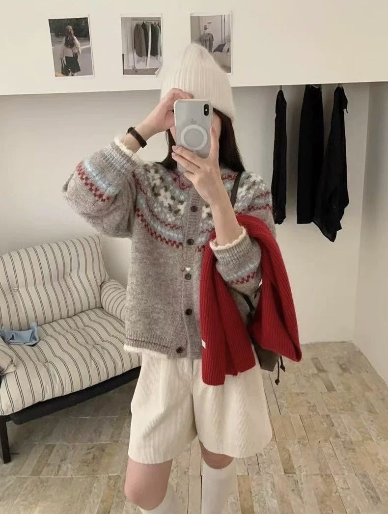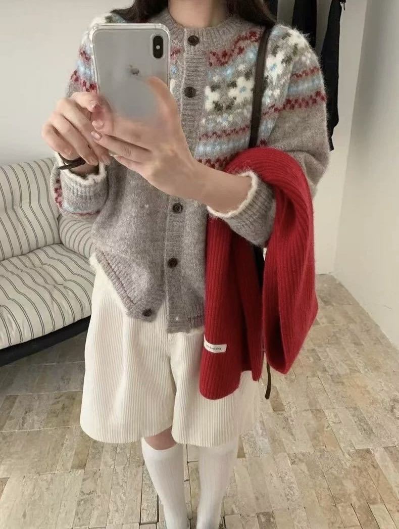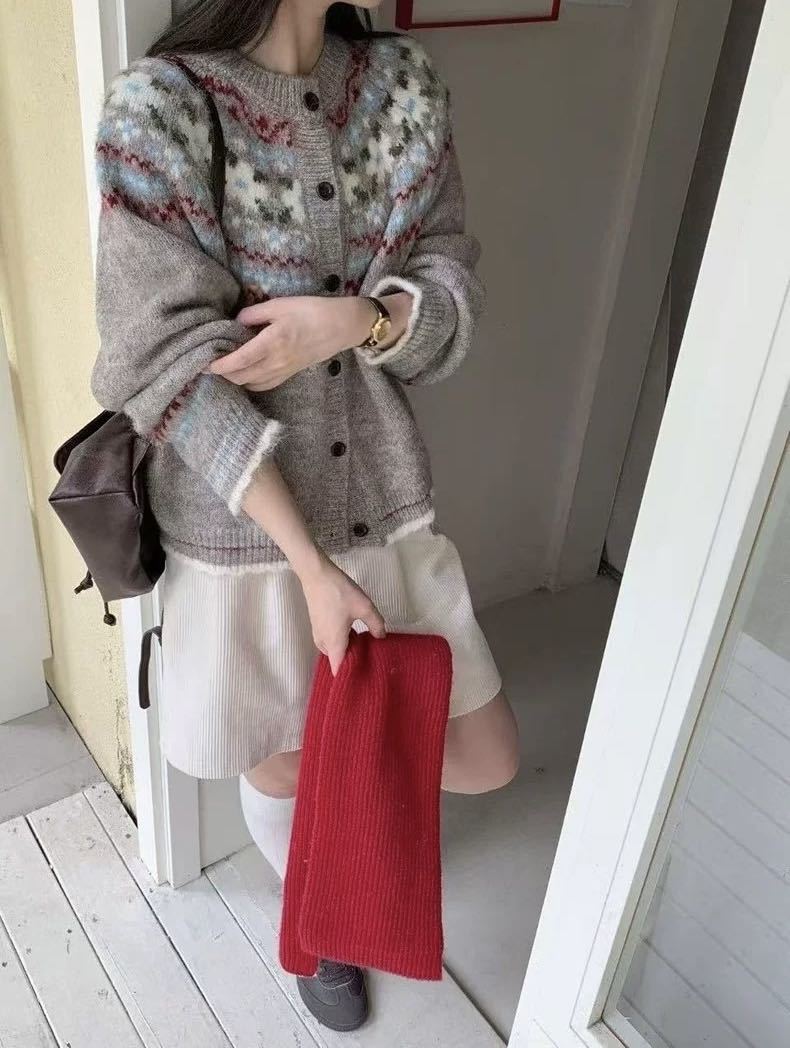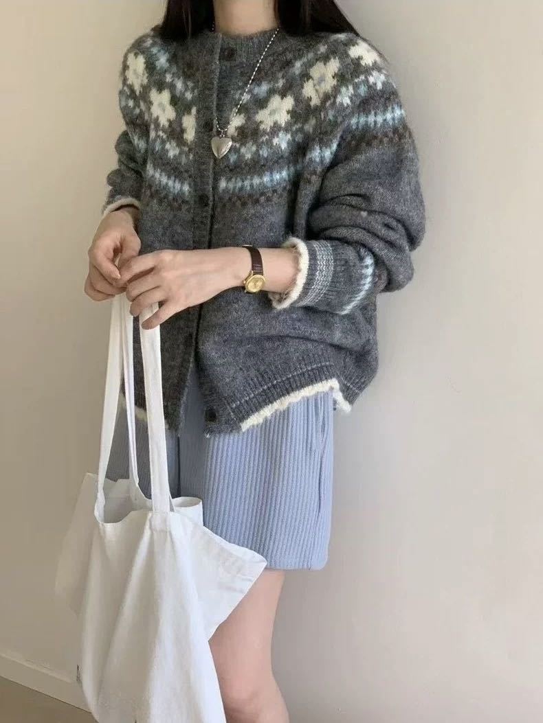 Suéter Cárdigan de Flores Fair Isle de Gama Alta para Mujer Otoño Invierno Cuello Redondo Holgado Casual Suave Tejido Jacquard Abrigo