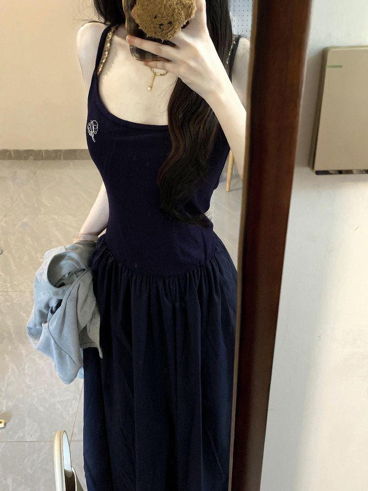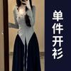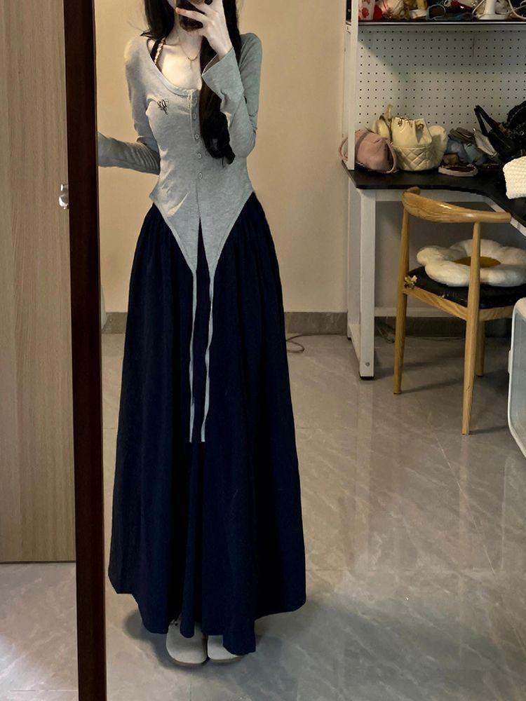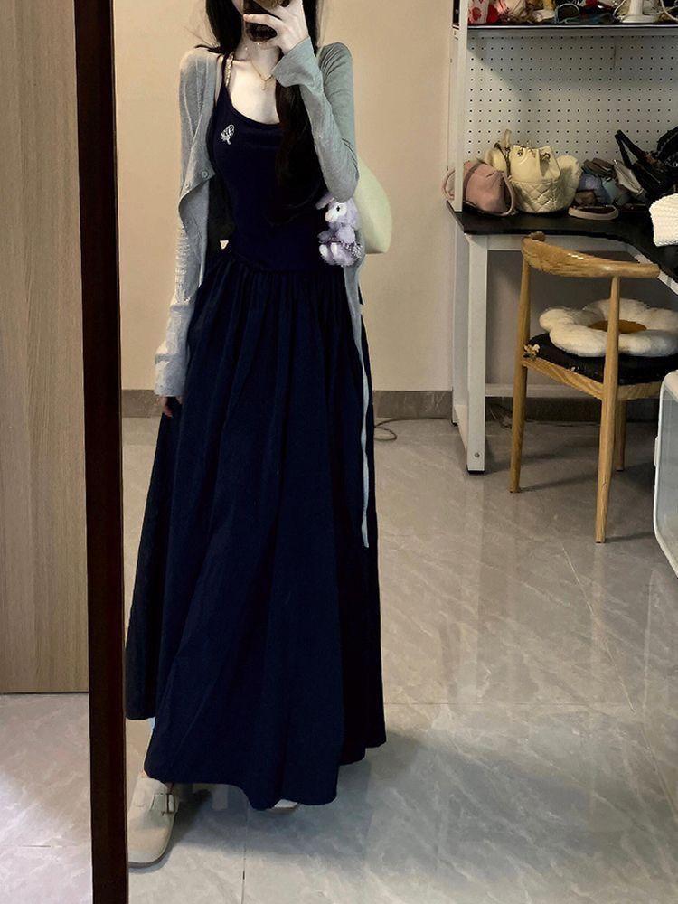 Grey Cardigan + Navy Blue Dress [Two-Piece Set], Navy blue dress【single piece】, Gray cardigan [single piece]