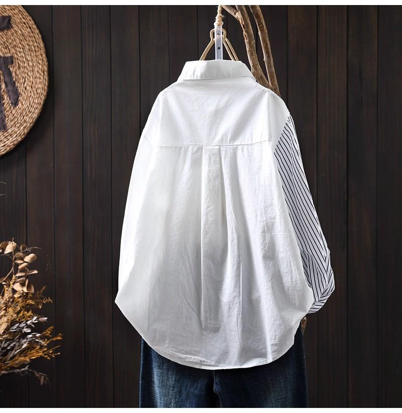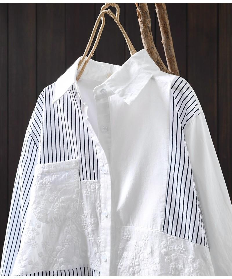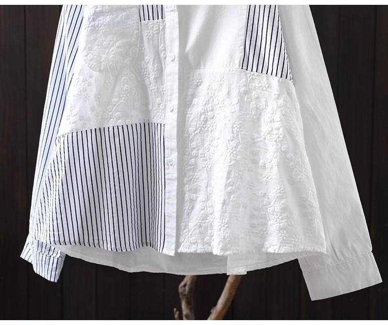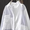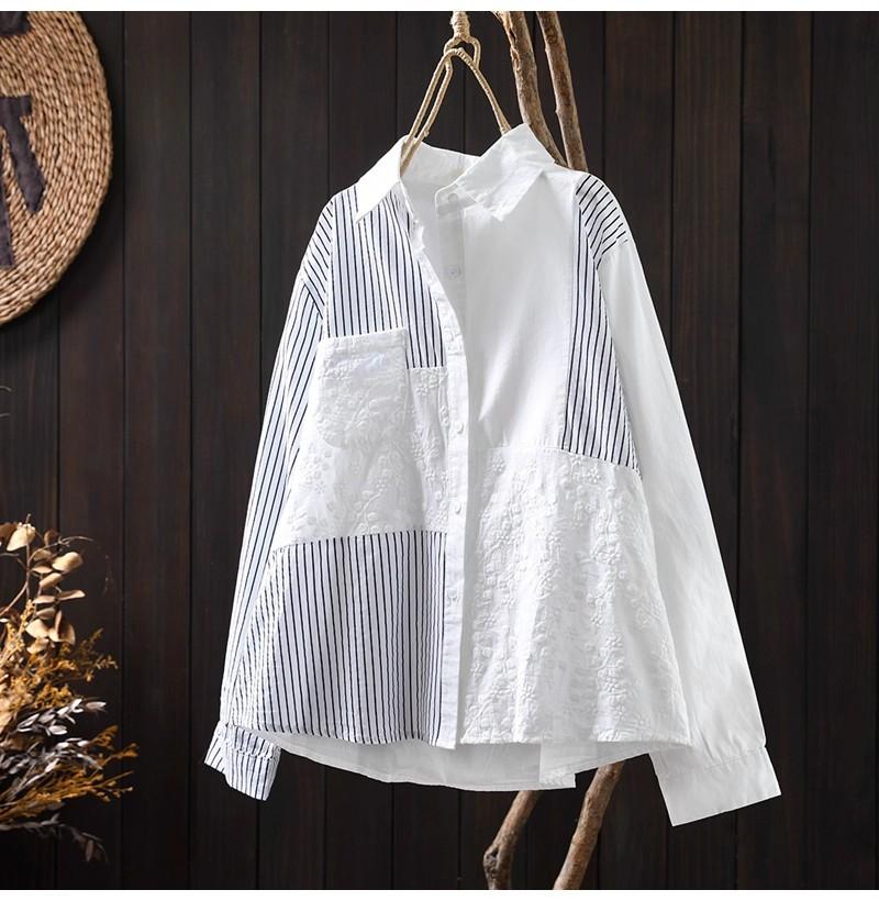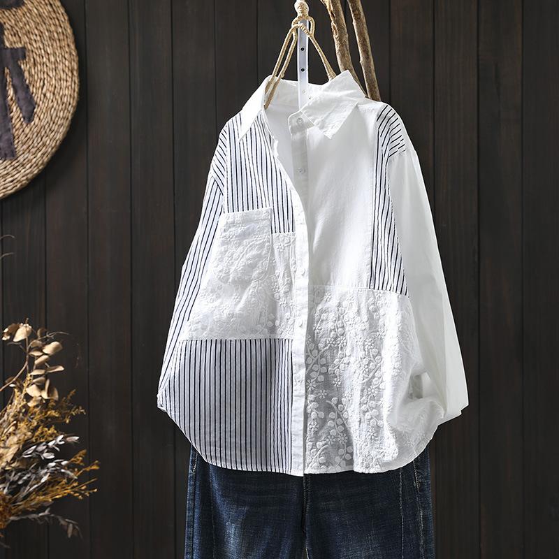 Camisa Rayada de Algodón Lino Jacquard Bordado Top de Mujer Manga Larga Holgada 2025 Nuevo Otoño Temperamento Reductor de Edad Camisa Blanca