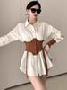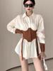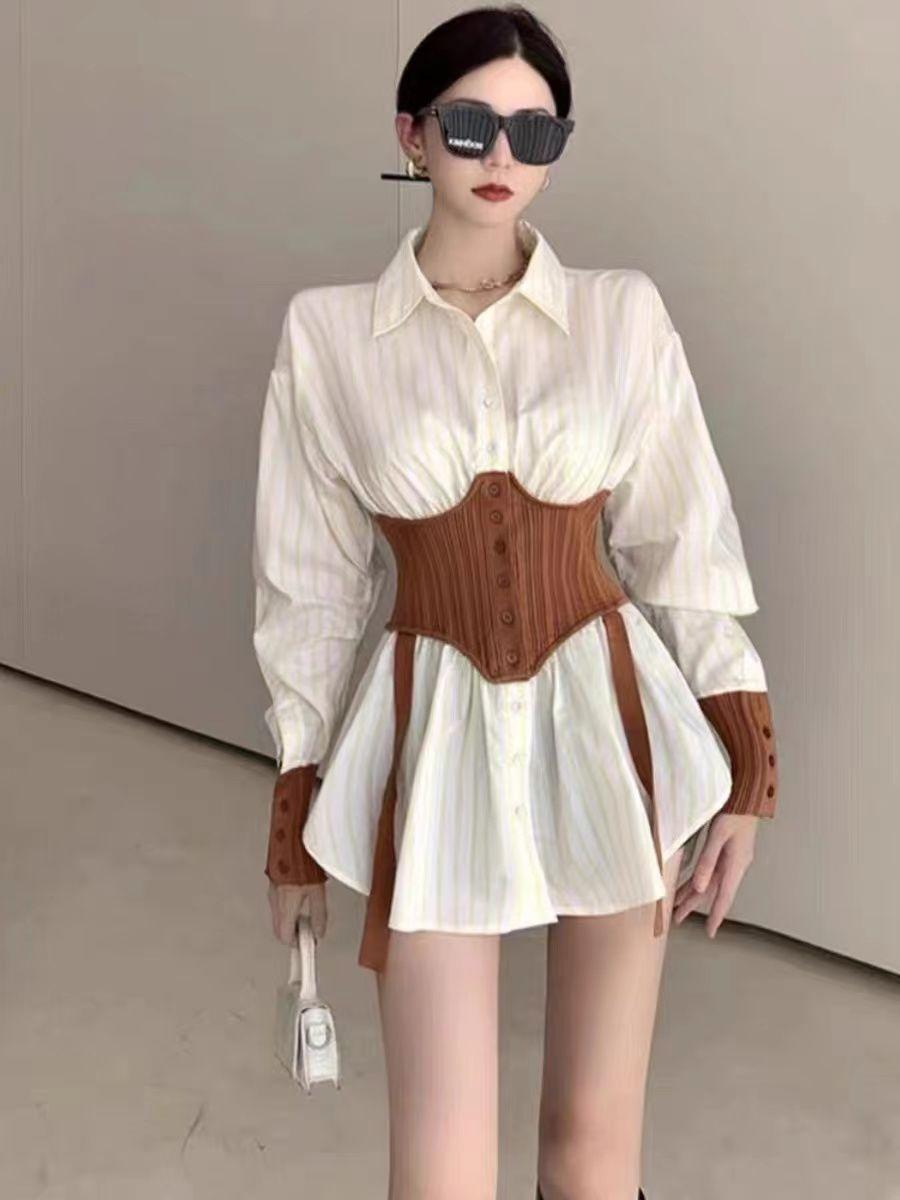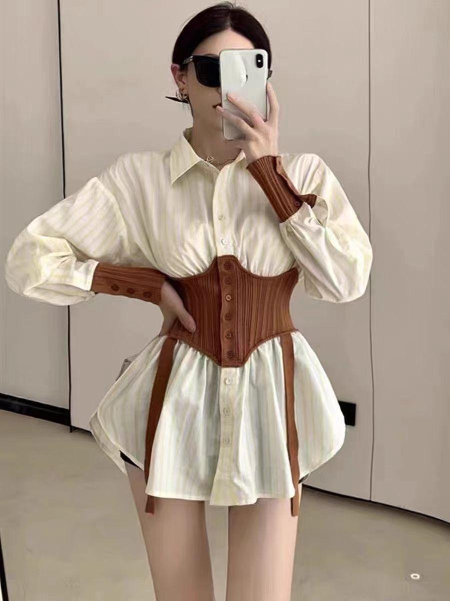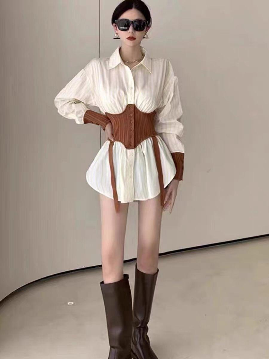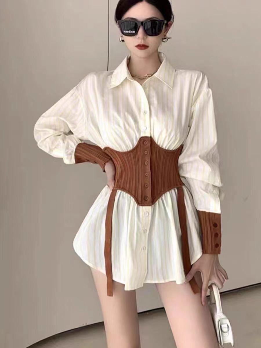 Shanlidaidi Talla Grande Camisa Francesa Falsa de Dos Piezas Define Cintura para Mujer Primavera y Otoño Sentido del Diseño Americano Nicho Top Temperamento Medio