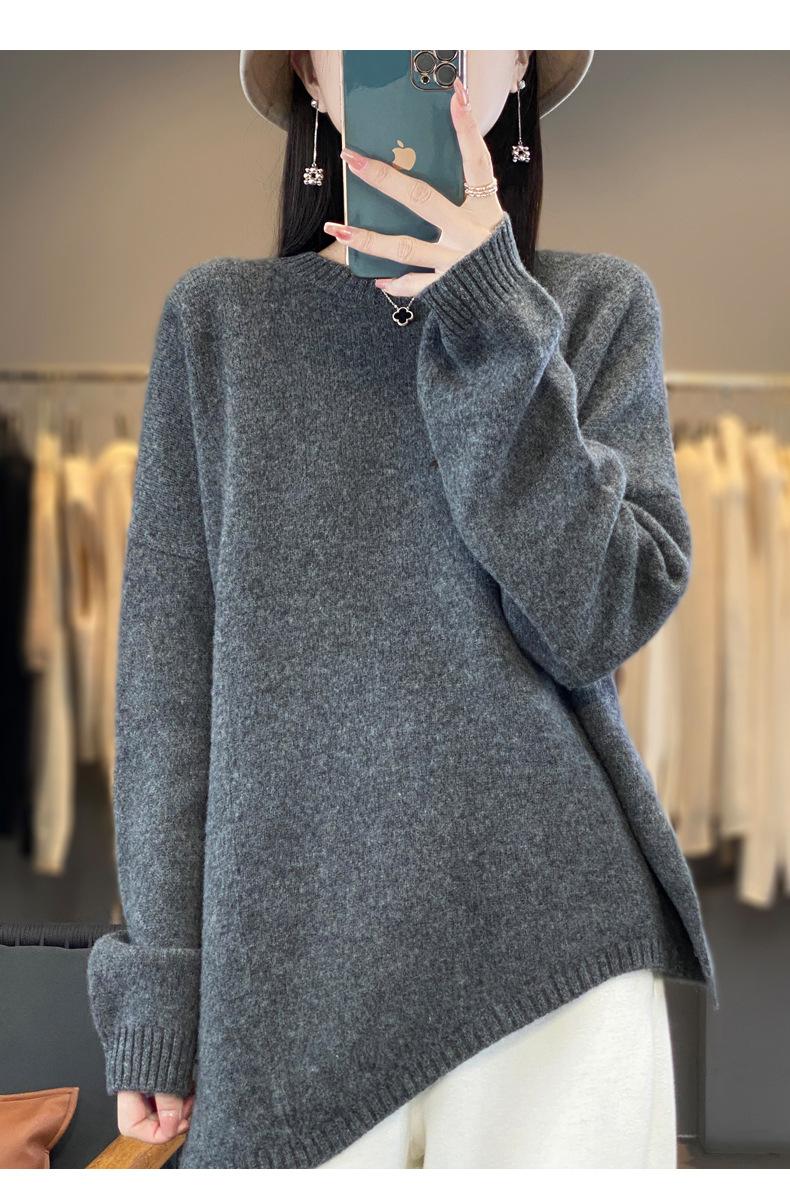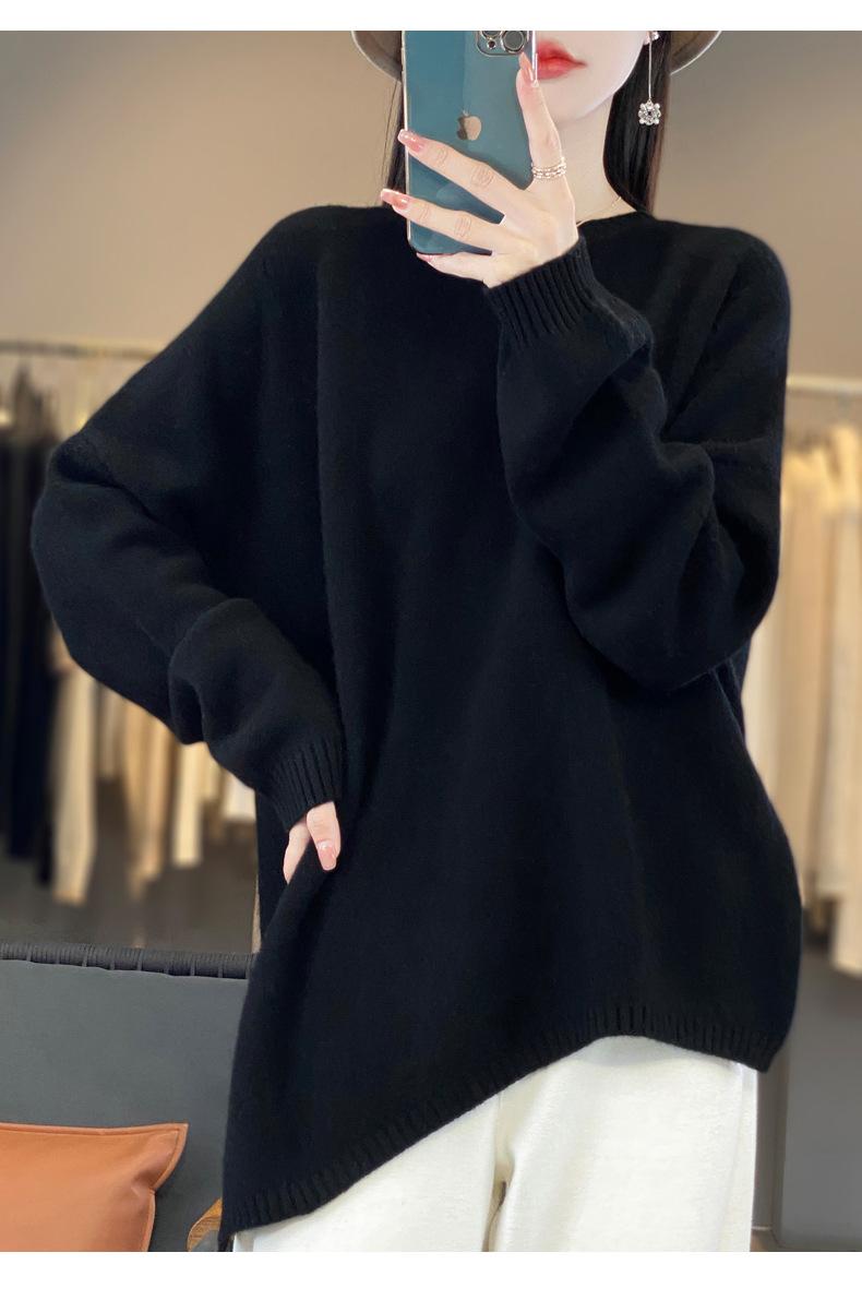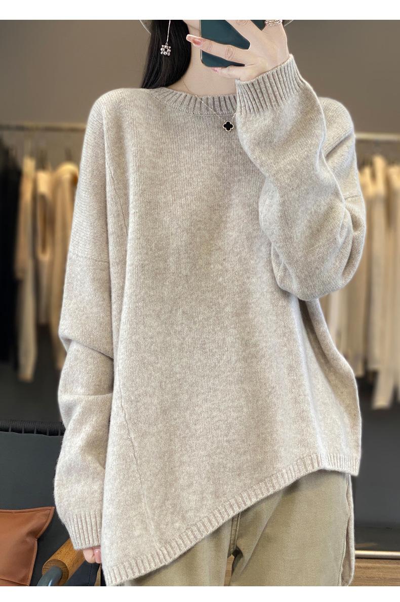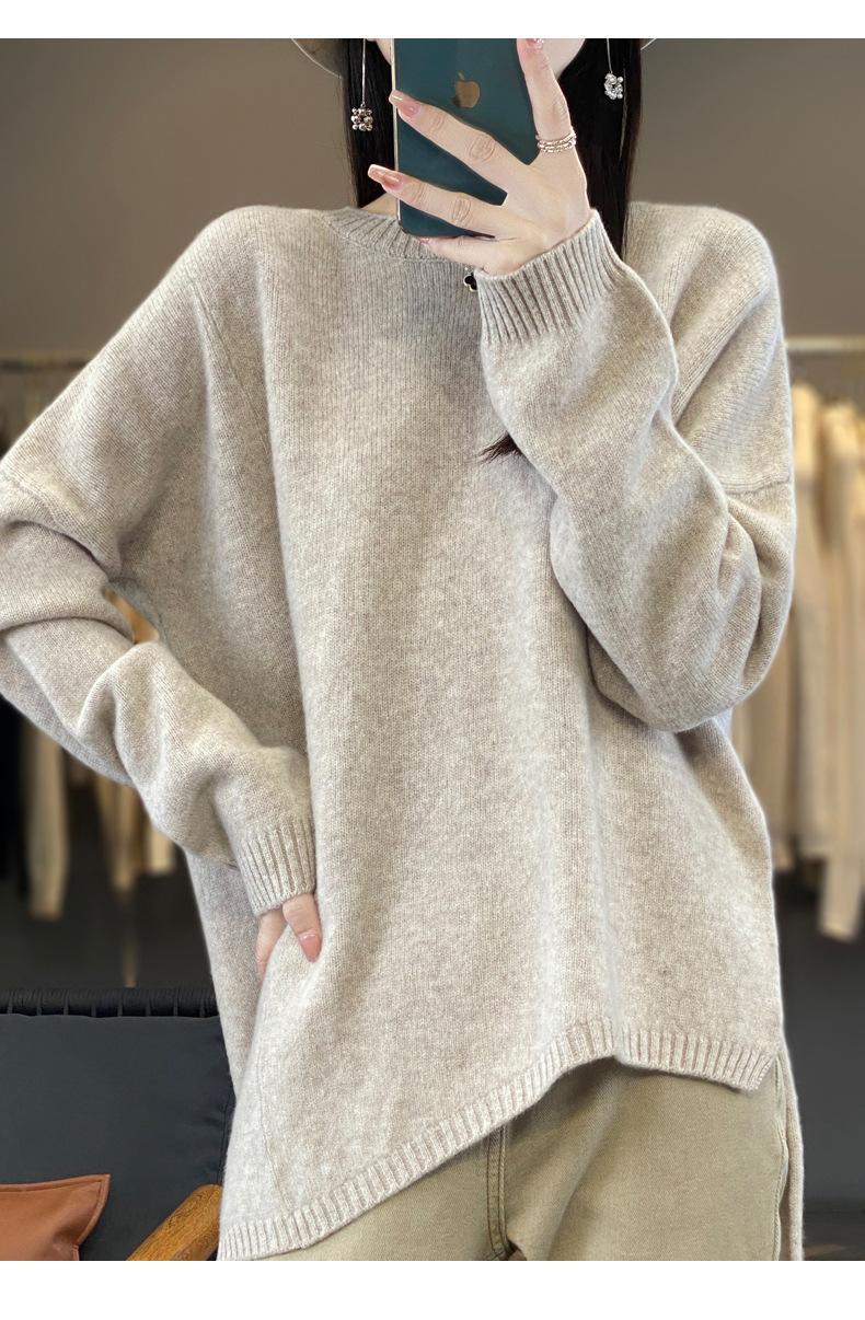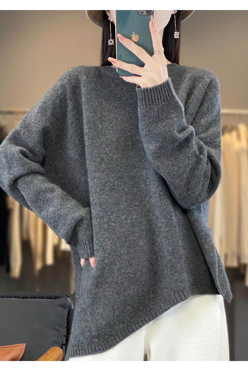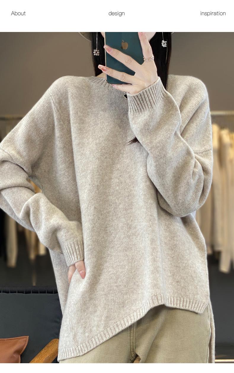 Suéter de Lana 100% Pura para Mujer Cuello Redondo Manga Larga Irregular Tejido Jersey Holgado Estilo Lazy Abertura Suéter de Cachemira Base