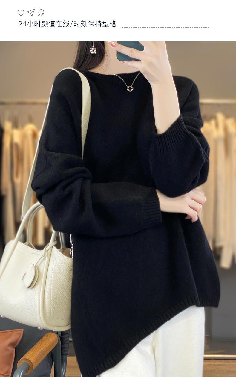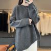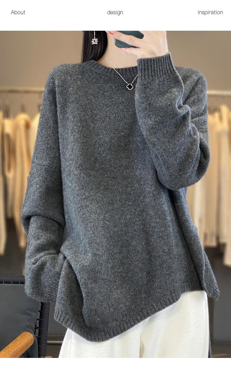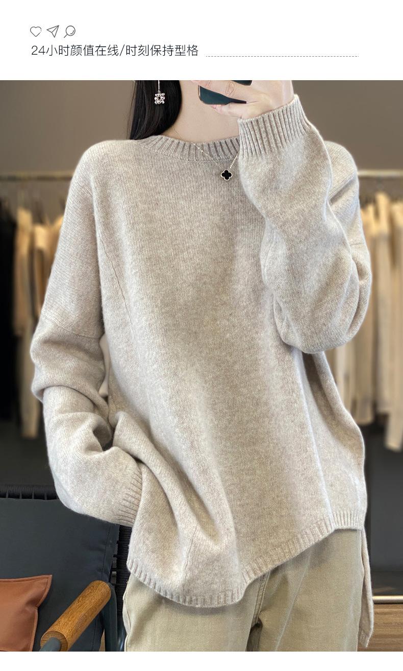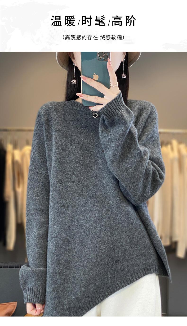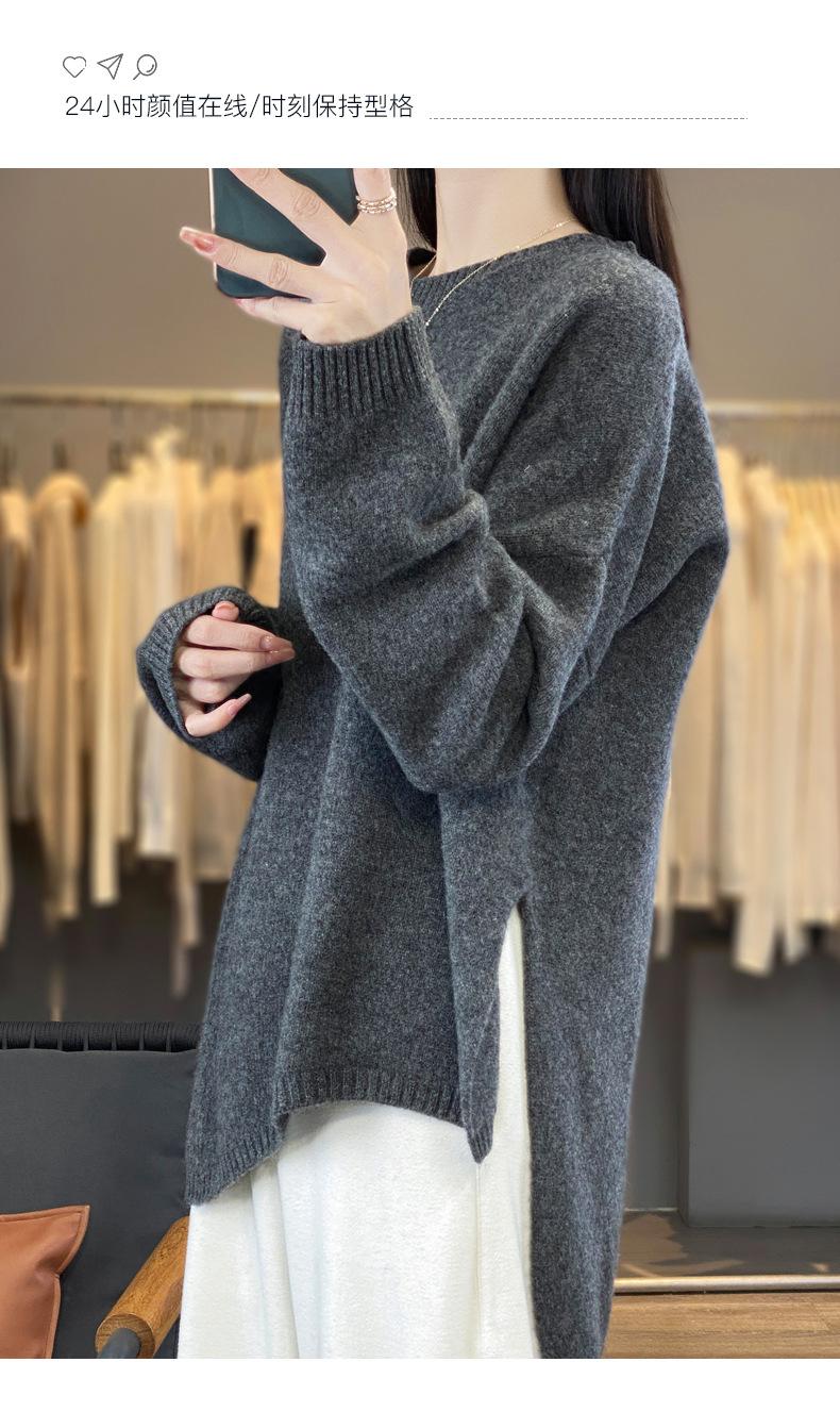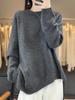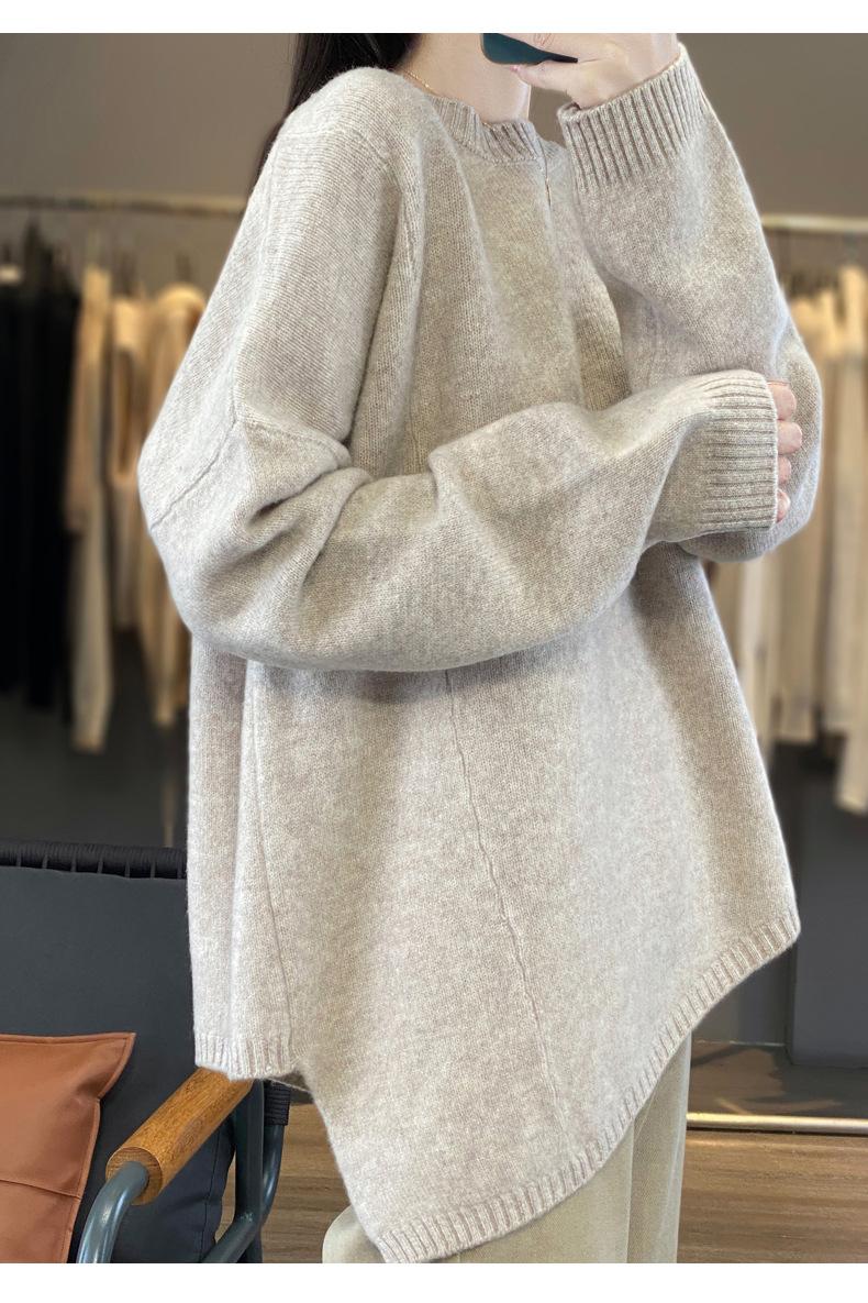 Suéter de Lana 100% Pura para Mujer Cuello Redondo Manga Larga Irregular Tejido Jersey Holgado Estilo Lazy Abertura Suéter de Cachemira Base