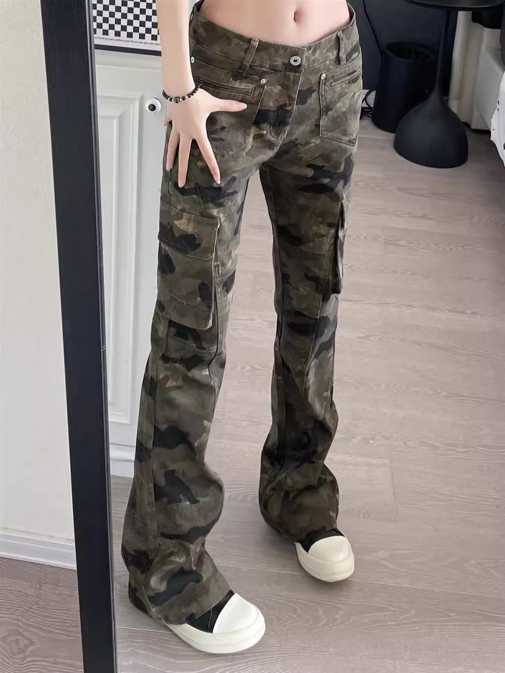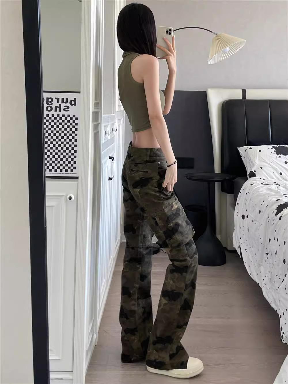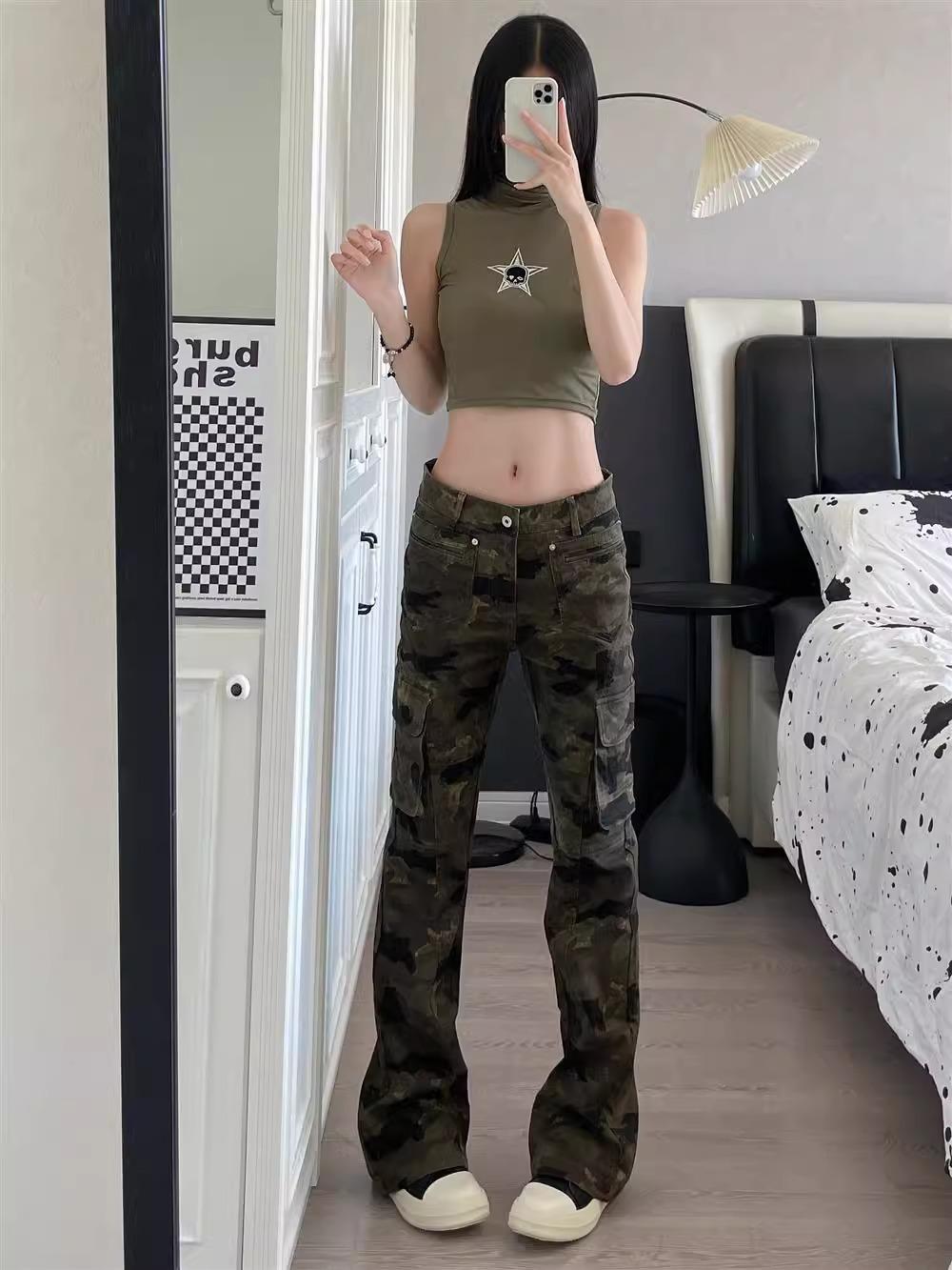 Jeans Acampanados Slim Americanos de Calle Alta para Mujer Otoño Nuevo Ropa de Trabajo Hip Hop Camuflaje Pantalones Drapeados Pierna Recta Pantalones Largos