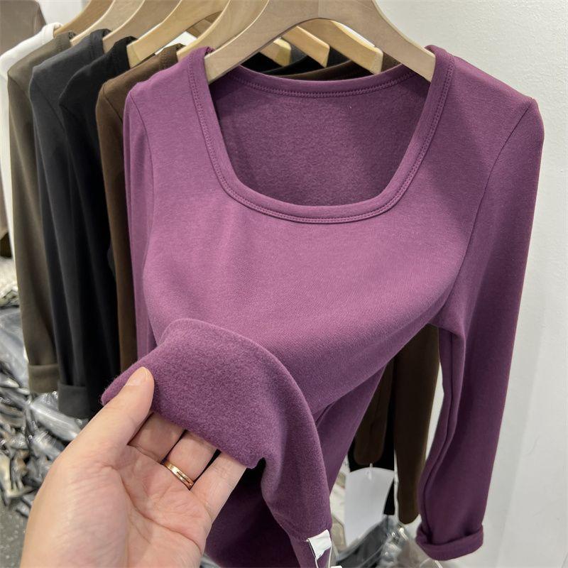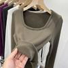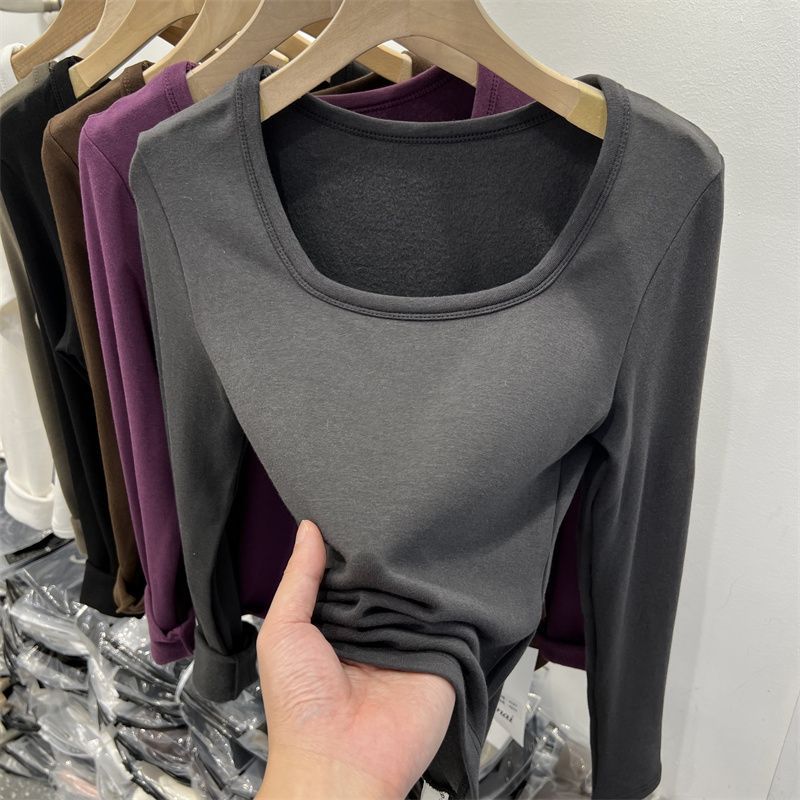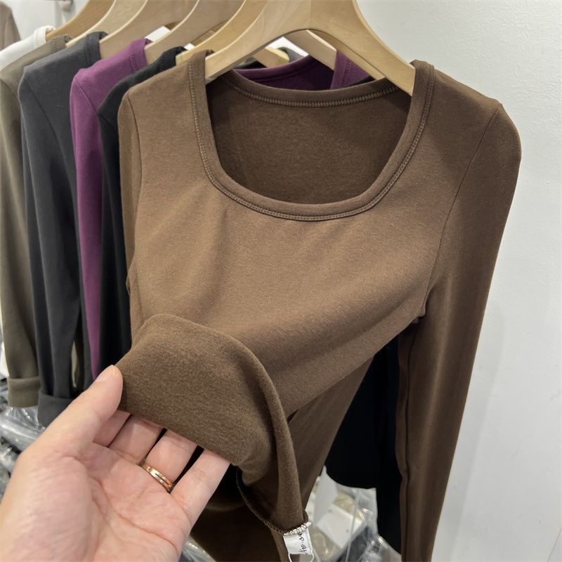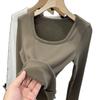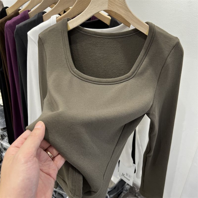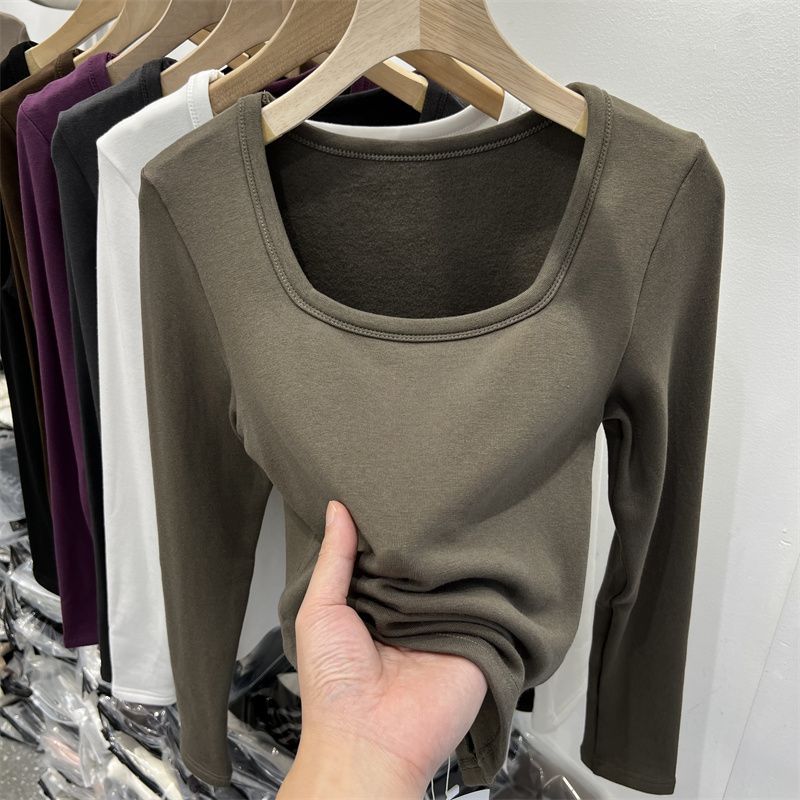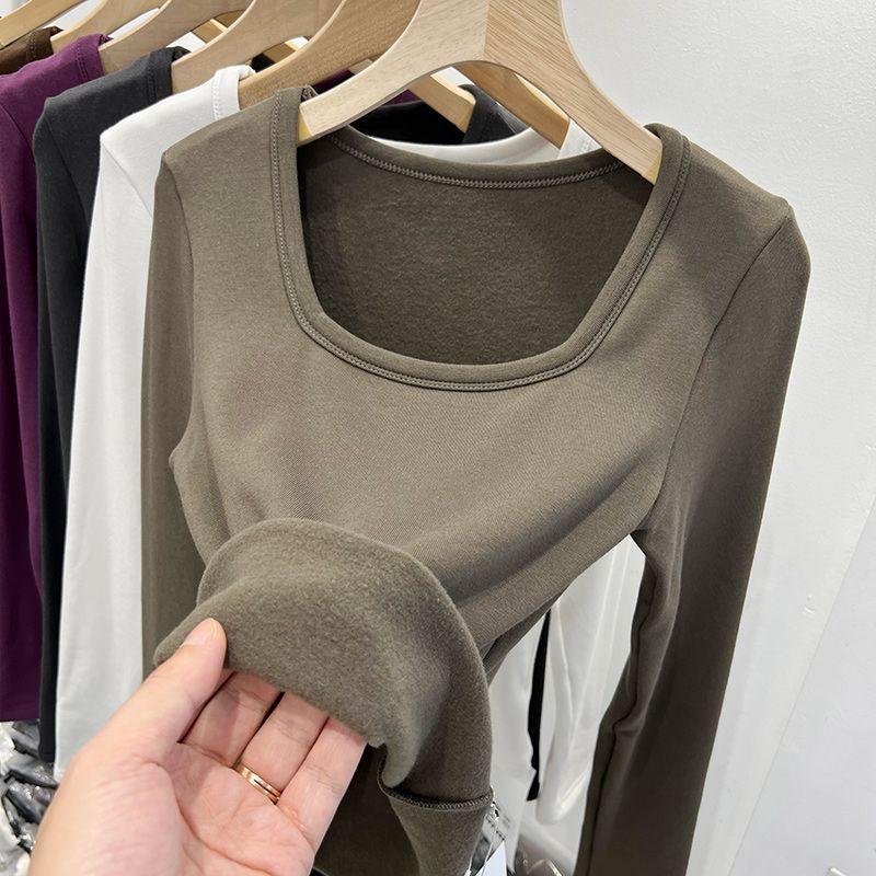 Playera de Manga Larga con Cuello Cuadrado Estilo Europeo para Mujer, Nueva Moda de Otoño e Invierno de Color Sólido con Interior de Felpa Fina, Camiseta Base Top