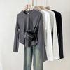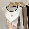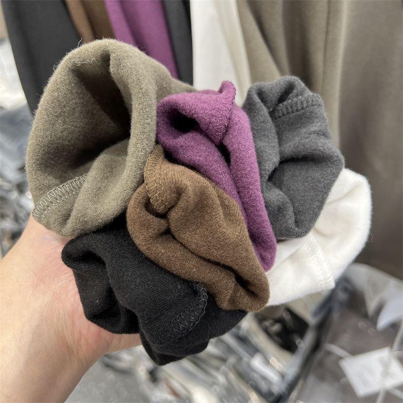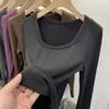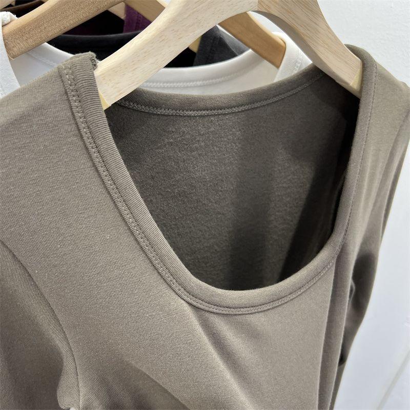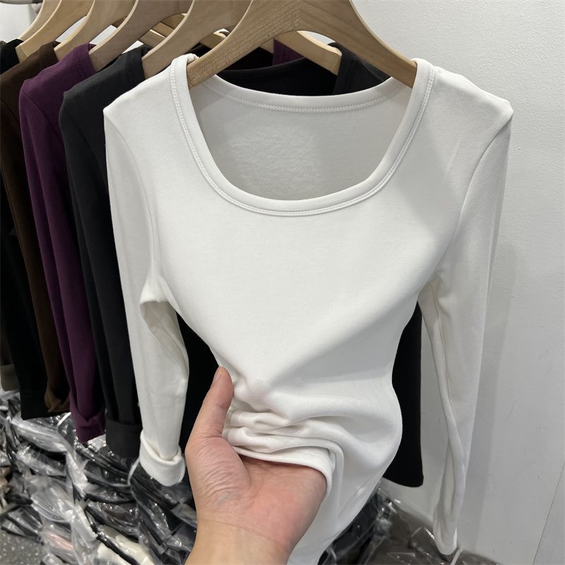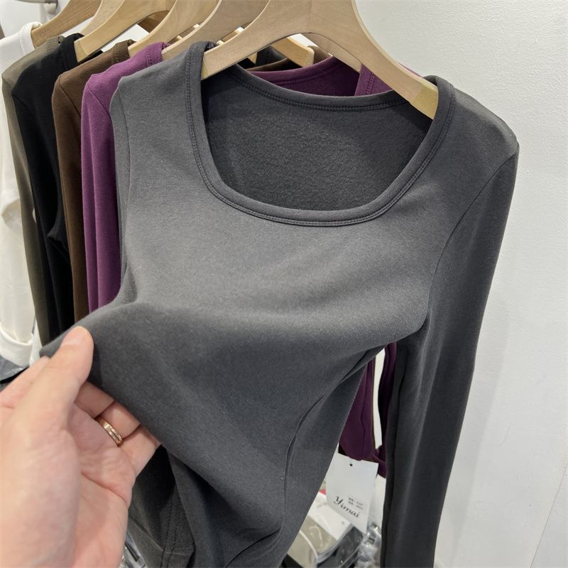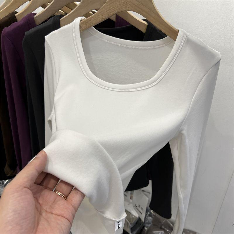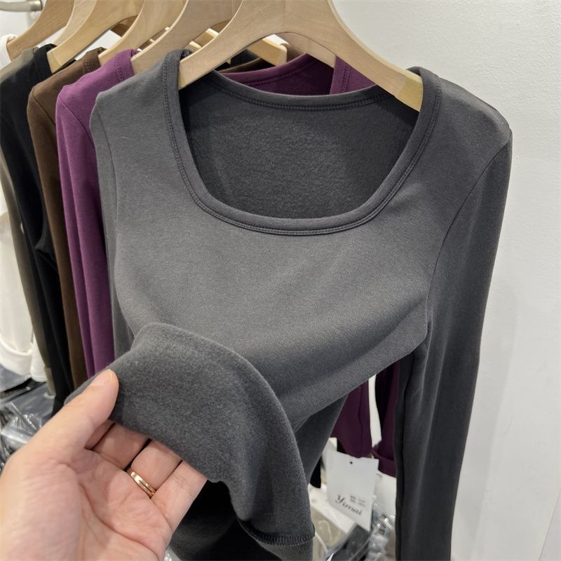 Playera de Manga Larga con Cuello Cuadrado Estilo Europeo para Mujer, Nueva Moda de Otoño e Invierno de Color Sólido con Interior de Felpa Fina, Camiseta Base Top