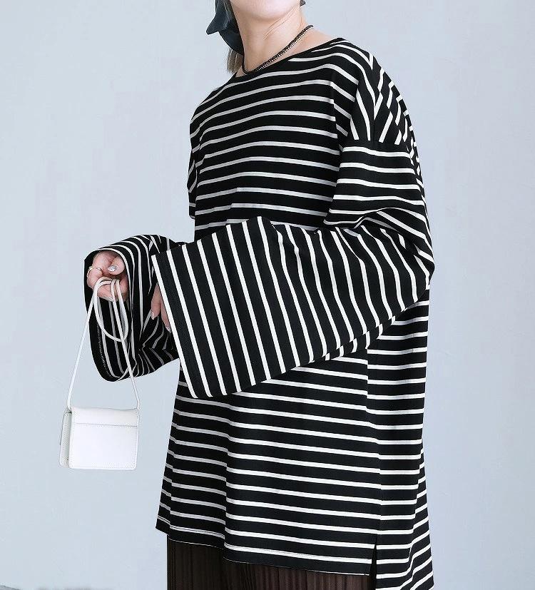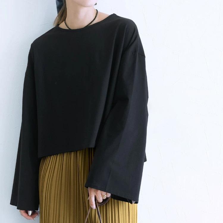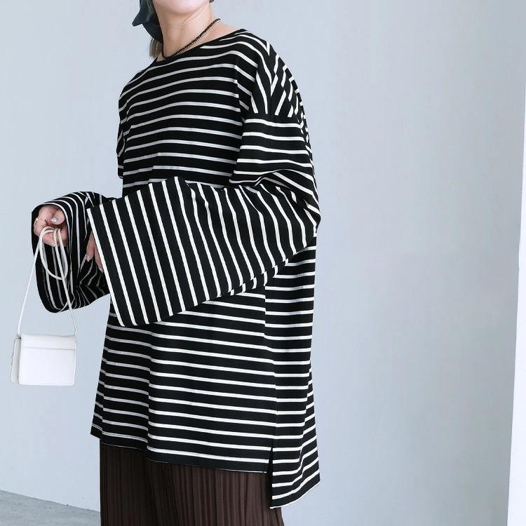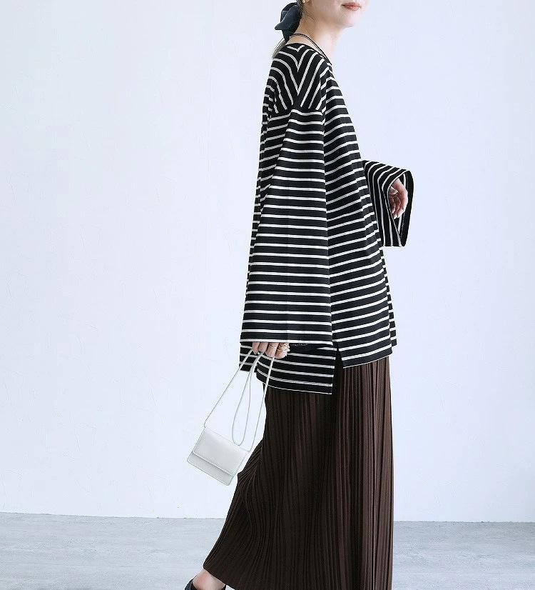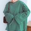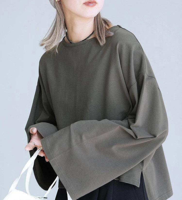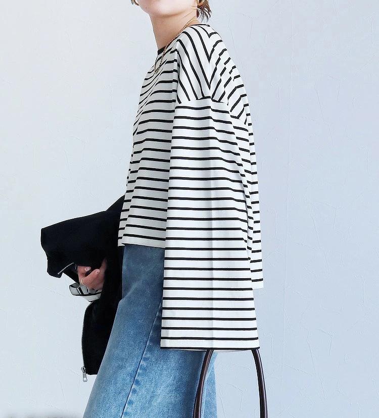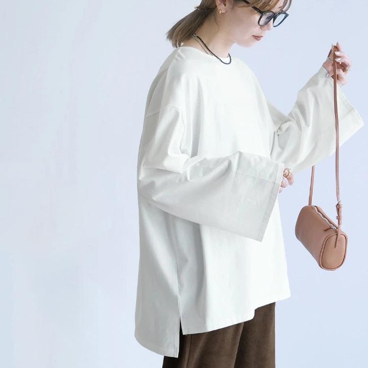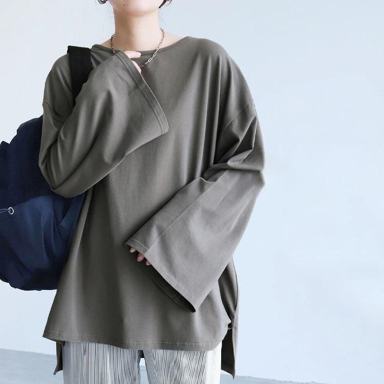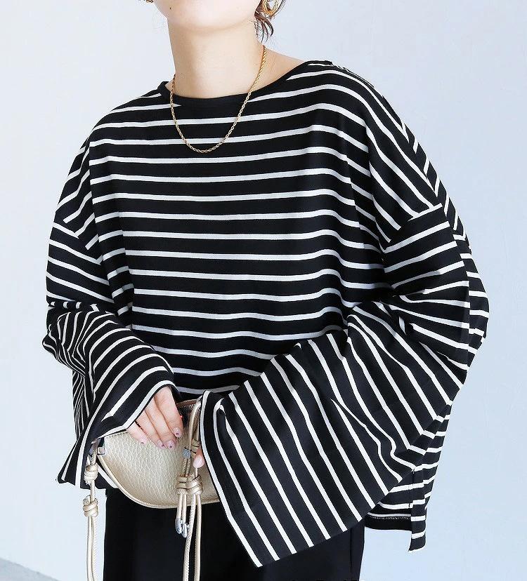 Otoño Japonés Nuevo Top de Manga Larga a Rayas de Color Sólido Suelto para Mujer Versátil Casual Manga Campana Cuello Redondo Camiseta