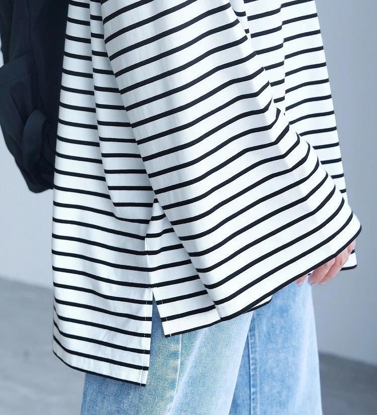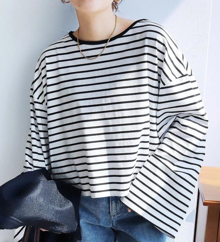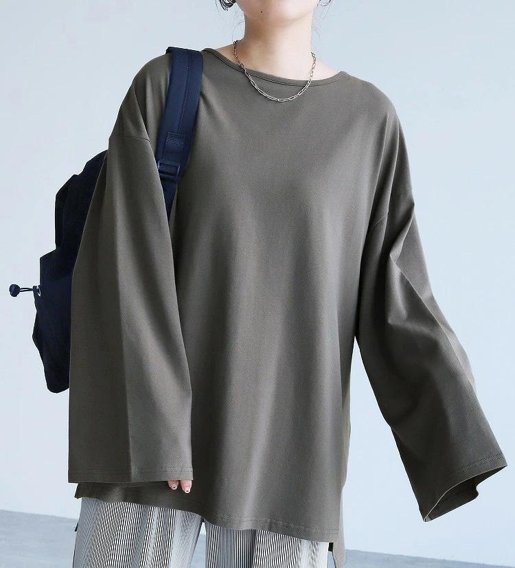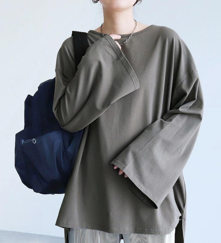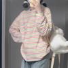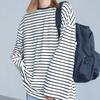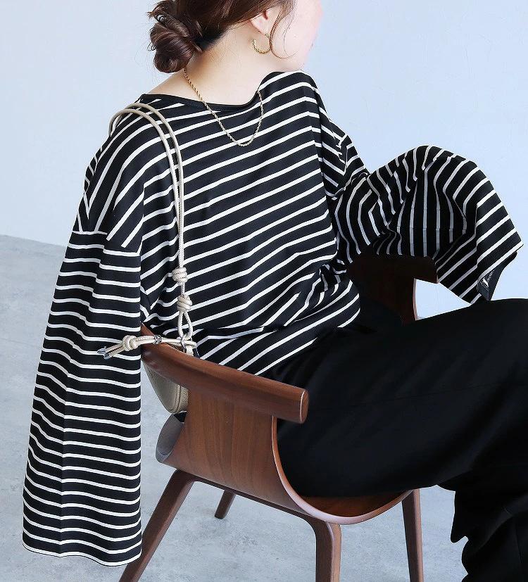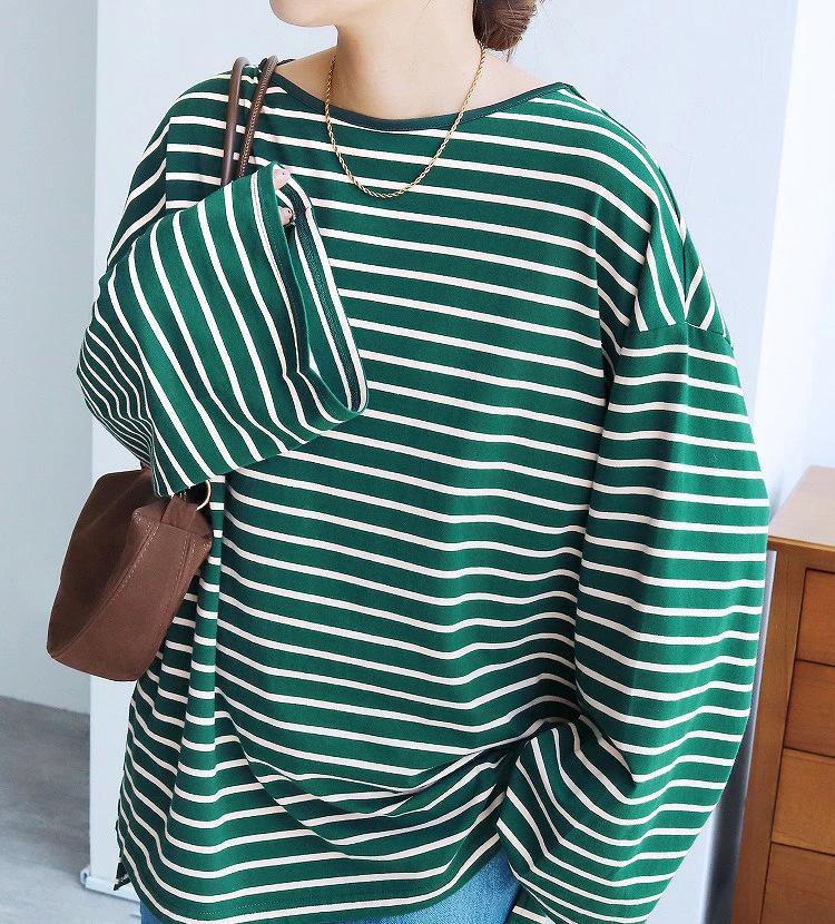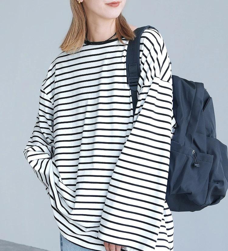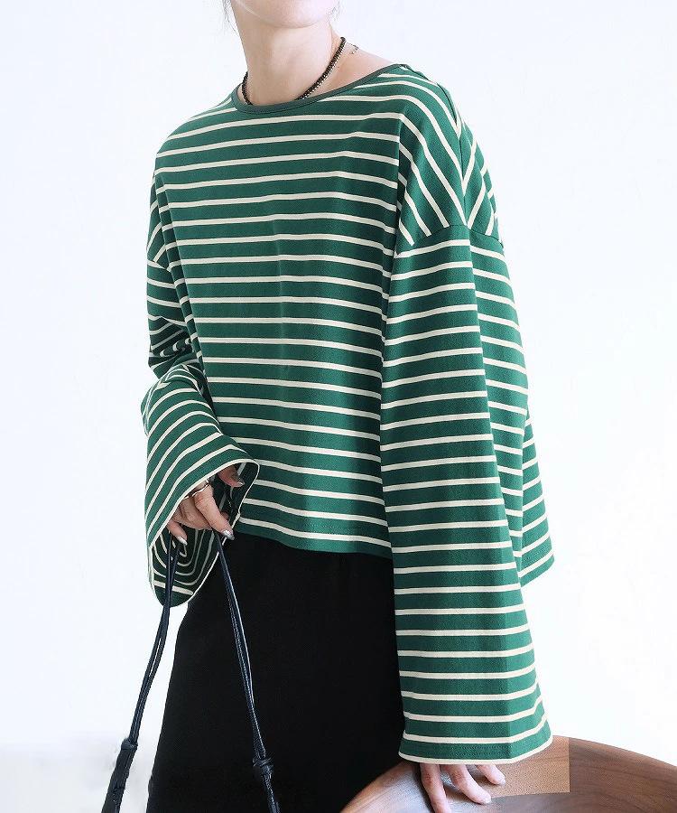 Otoño Japonés Nuevo Top de Manga Larga a Rayas de Color Sólido Suelto para Mujer Versátil Casual Manga Campana Cuello Redondo Camiseta