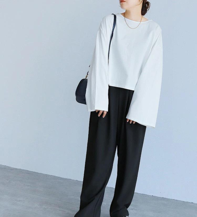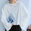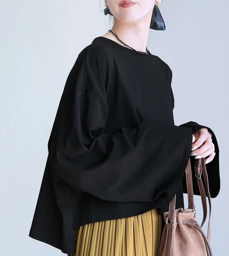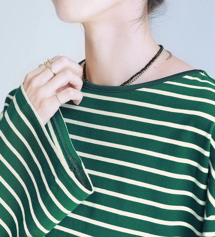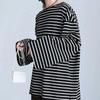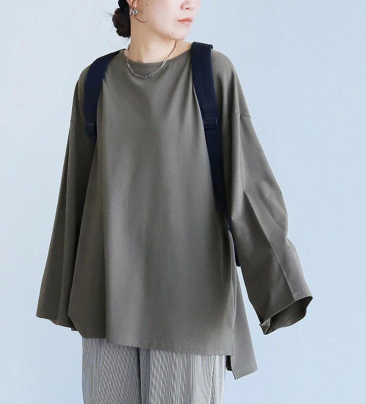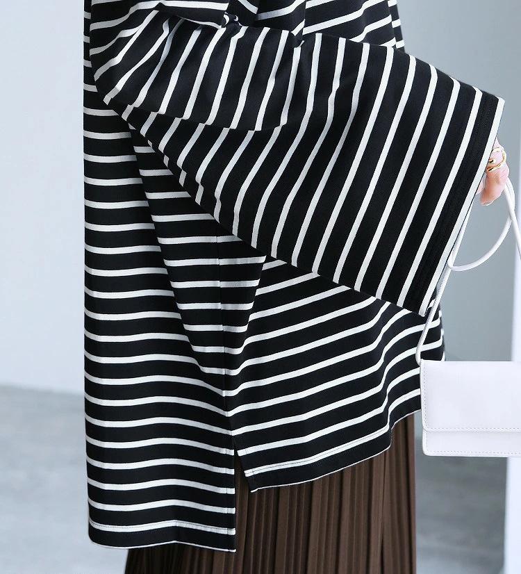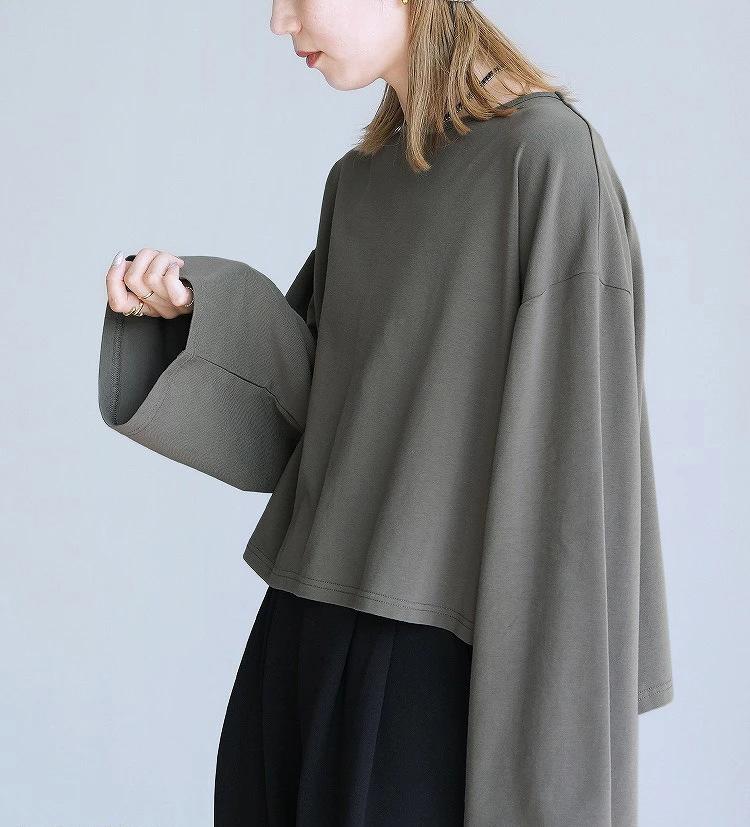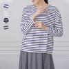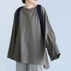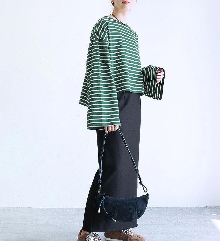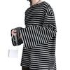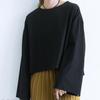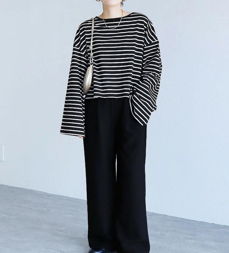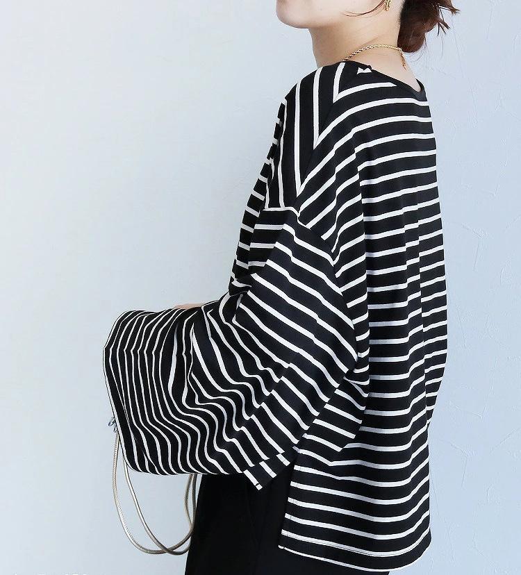 Otoño Japonés Nuevo Top de Manga Larga a Rayas de Color Sólido Suelto para Mujer Versátil Casual Manga Campana Cuello Redondo Camiseta