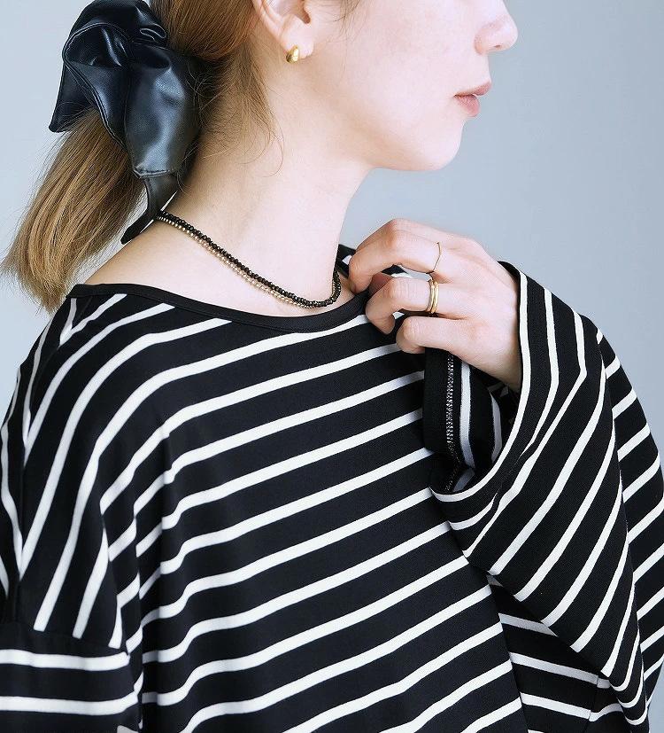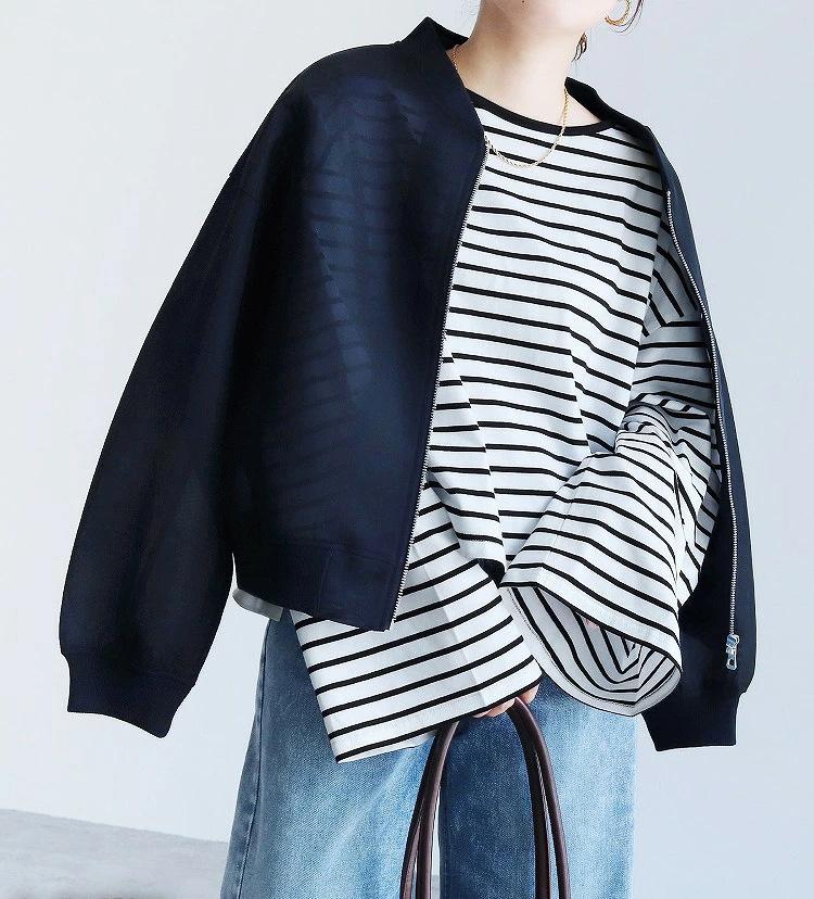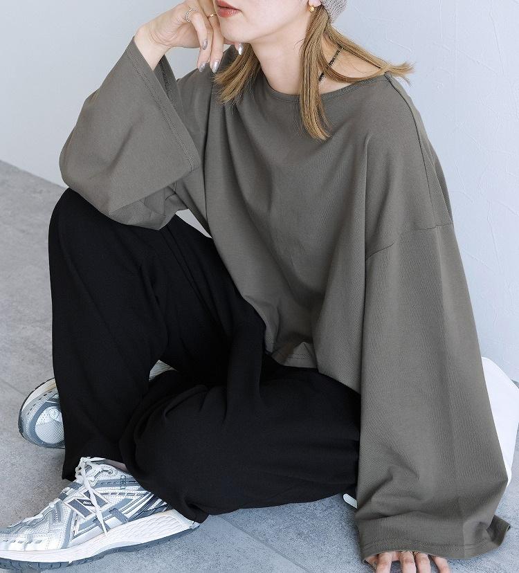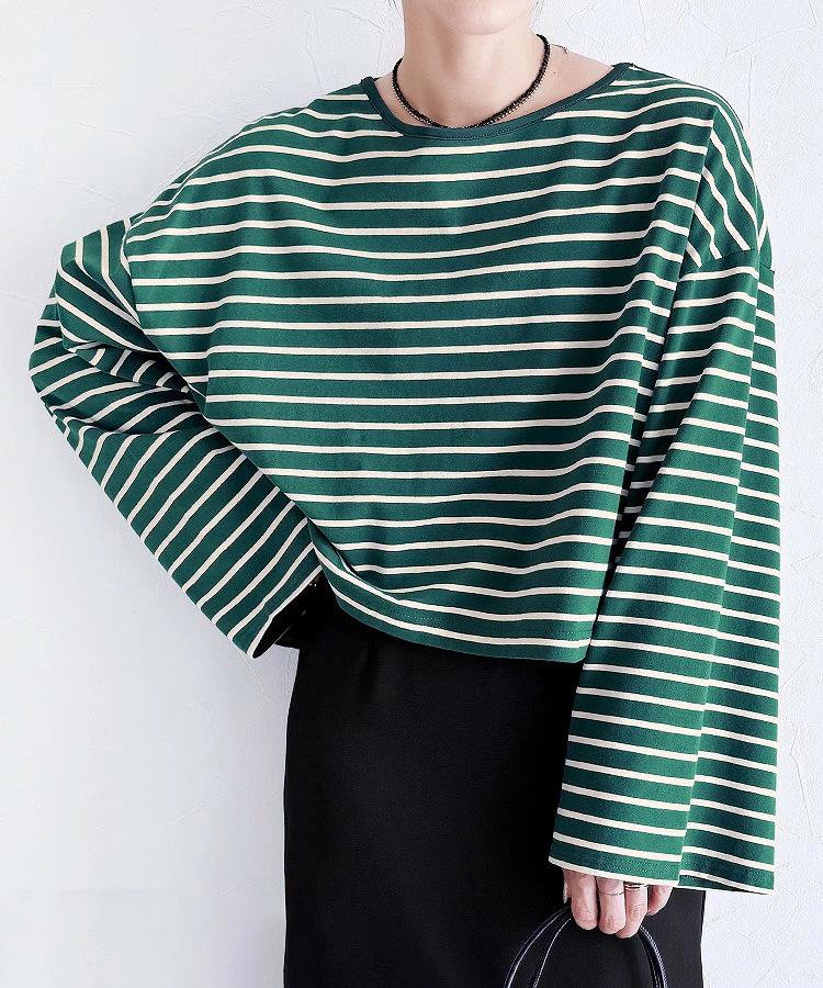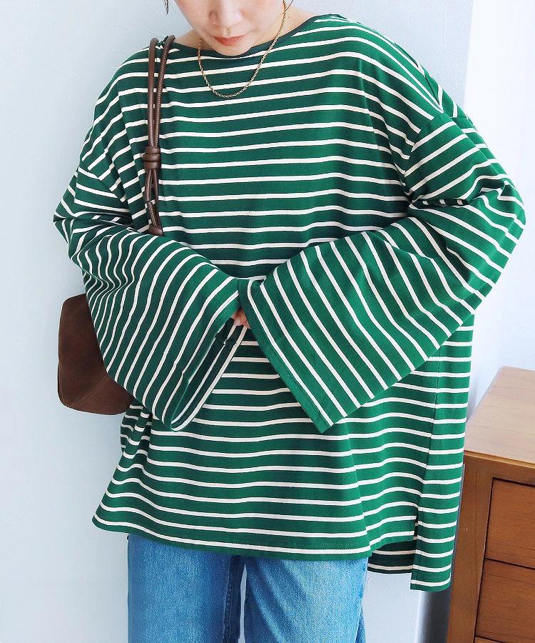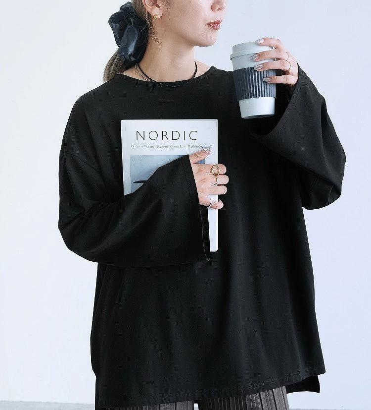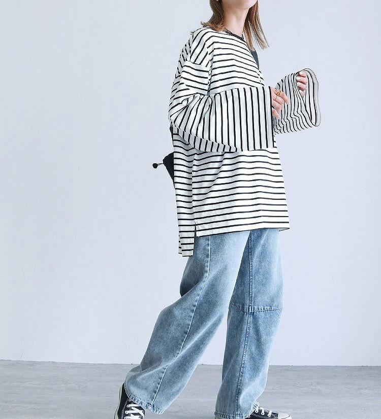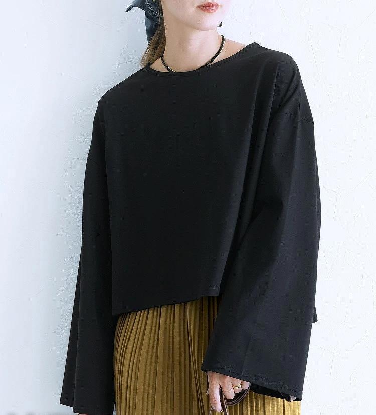 Otoño Japonés Nuevo Top de Manga Larga a Rayas de Color Sólido Suelto para Mujer Versátil Casual Manga Campana Cuello Redondo Camiseta