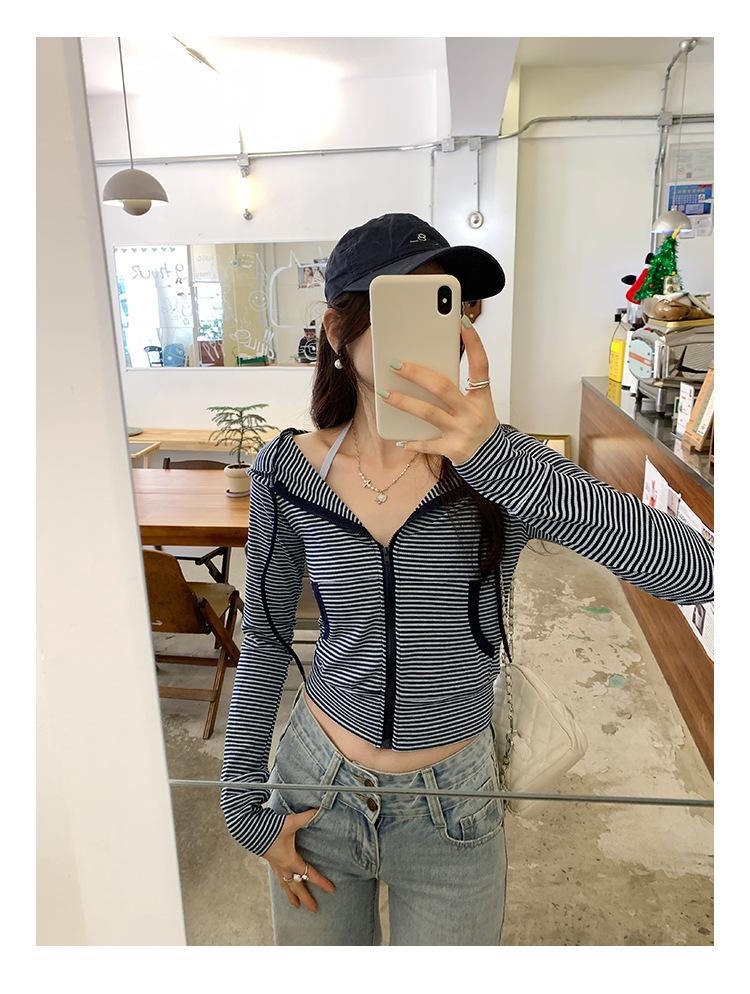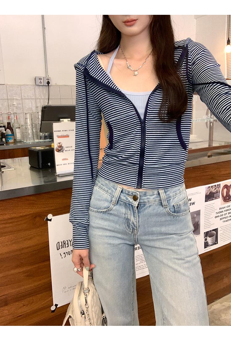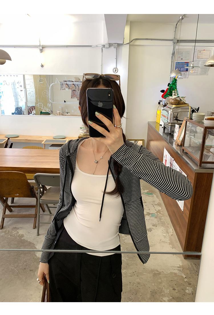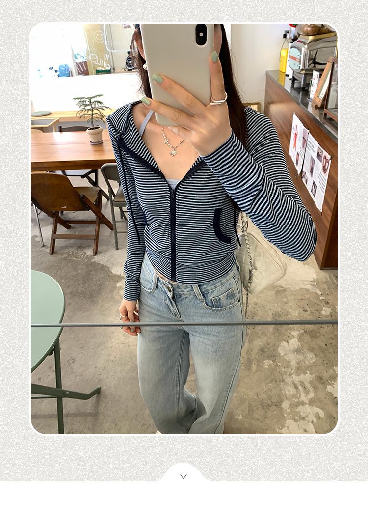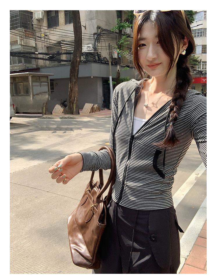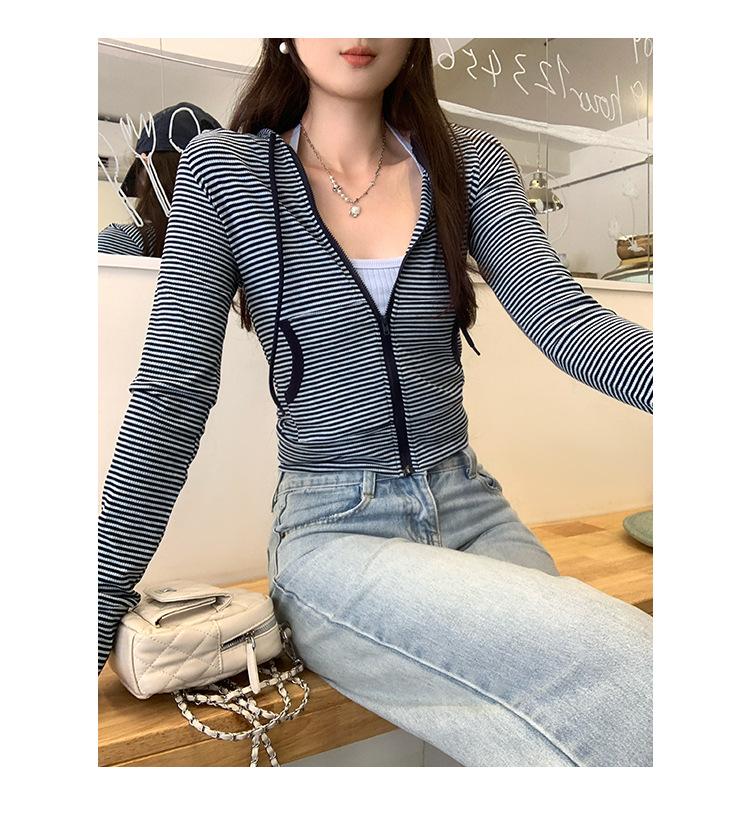 Sentido del diseño con cordón con capucha cárdigan casual a rayas ropa de mujer 2025 principios de otoño nuevo suéter chic abrigo top