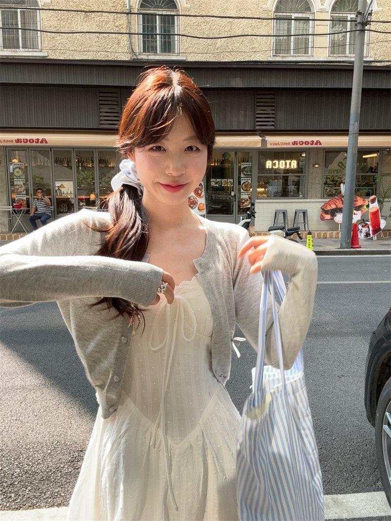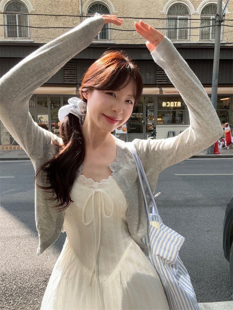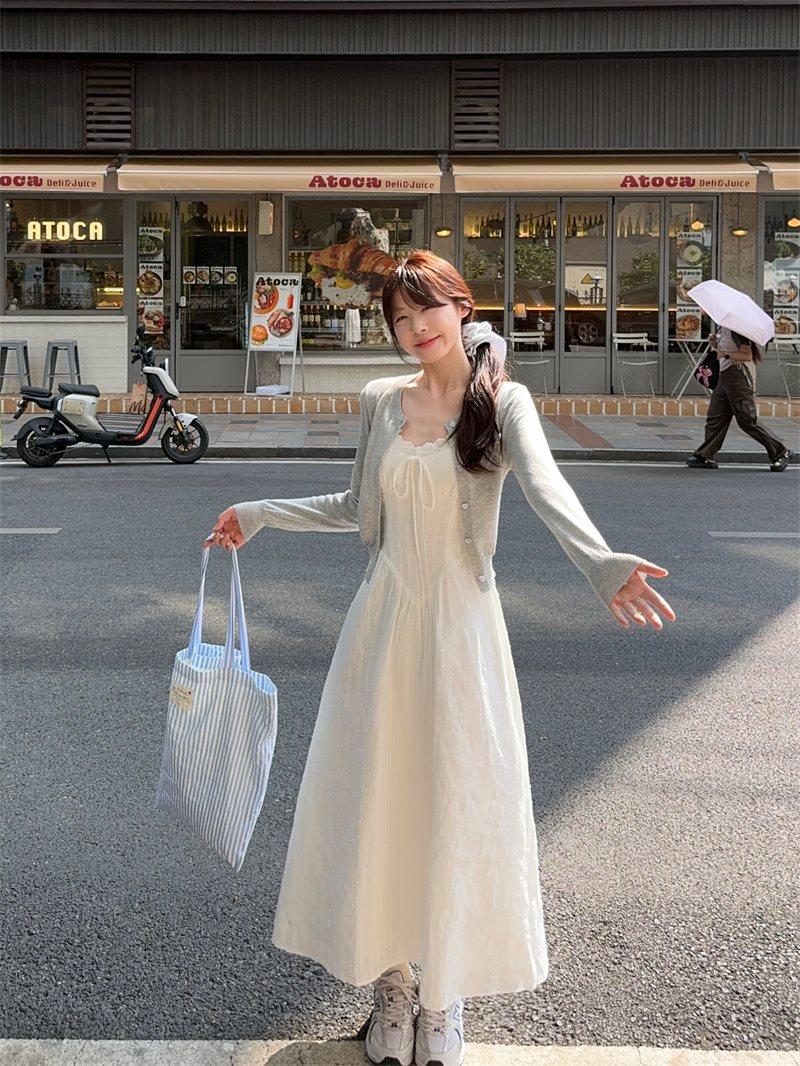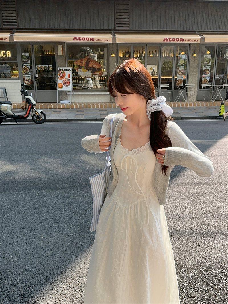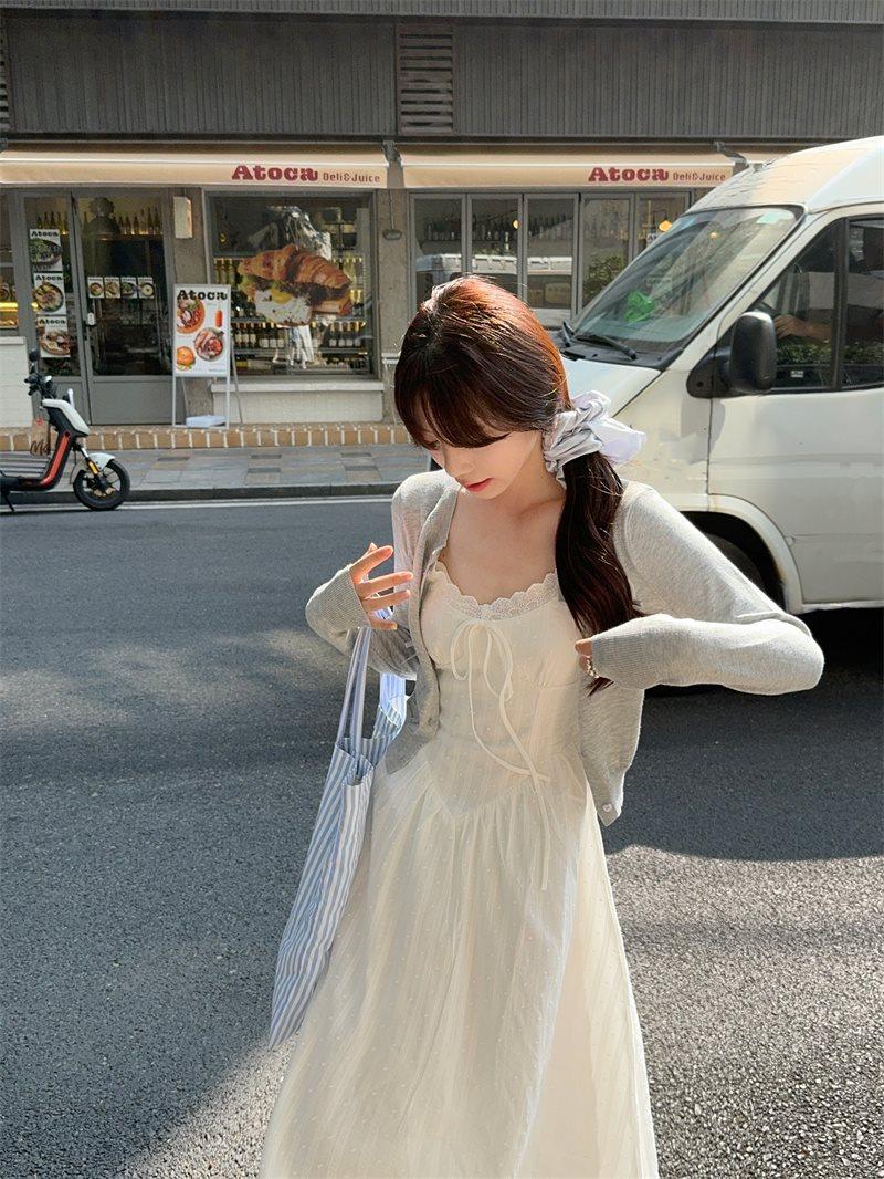 Cárdigan de Punto de Manga Larga Estilo Suave Ropa Exterior Encaje Patchwork Primer Amor Vestido de Tirantes Espagueti Otoño Nuevo Conjunto de Moda Mujeres