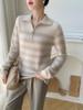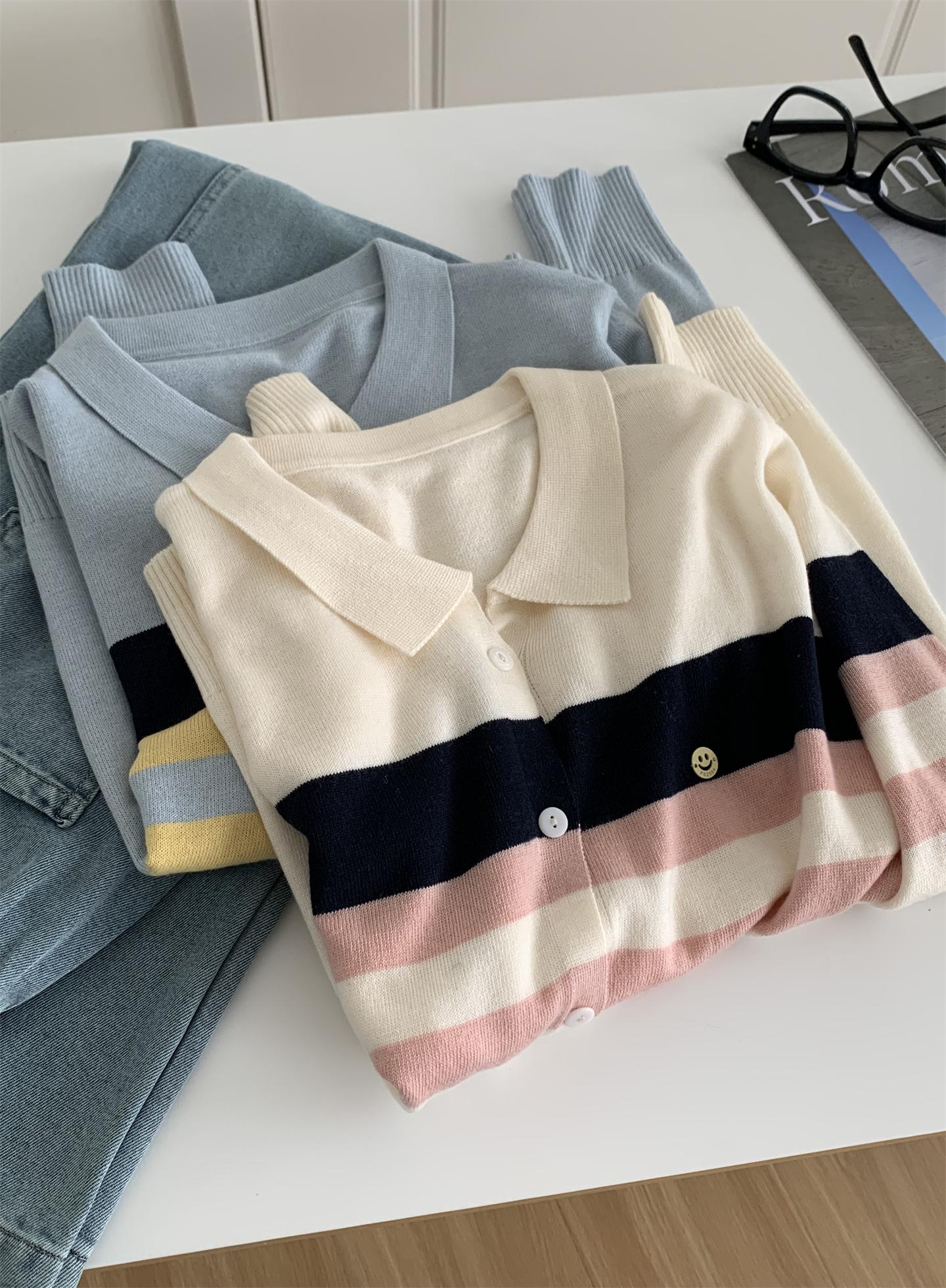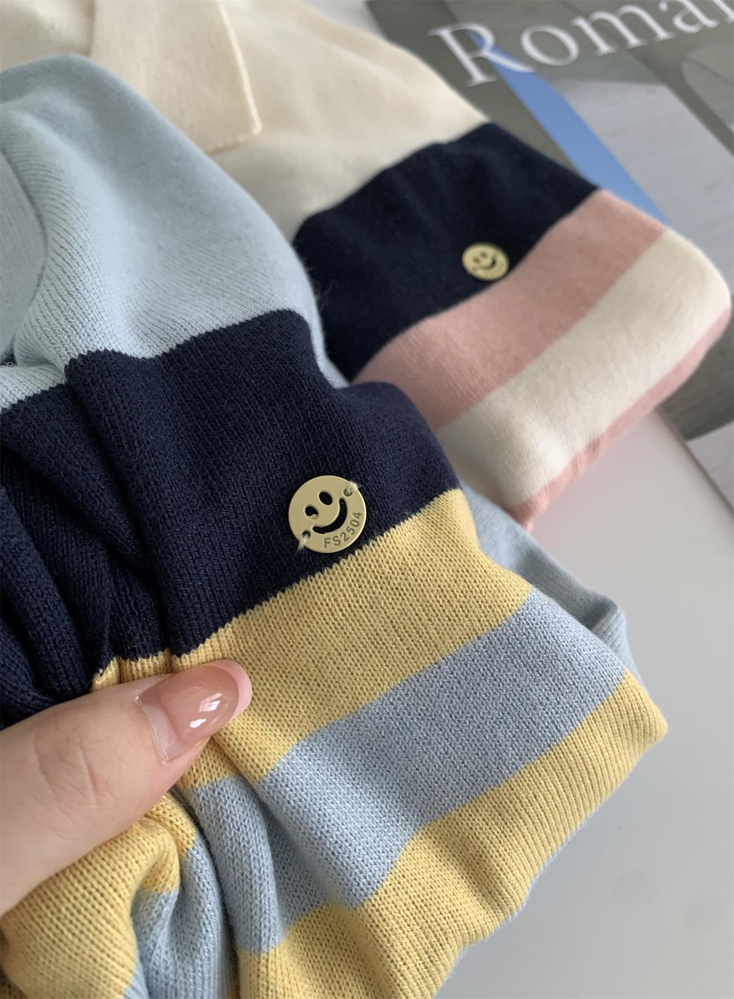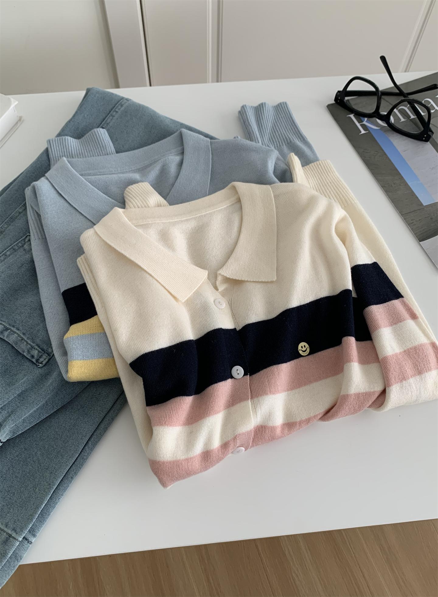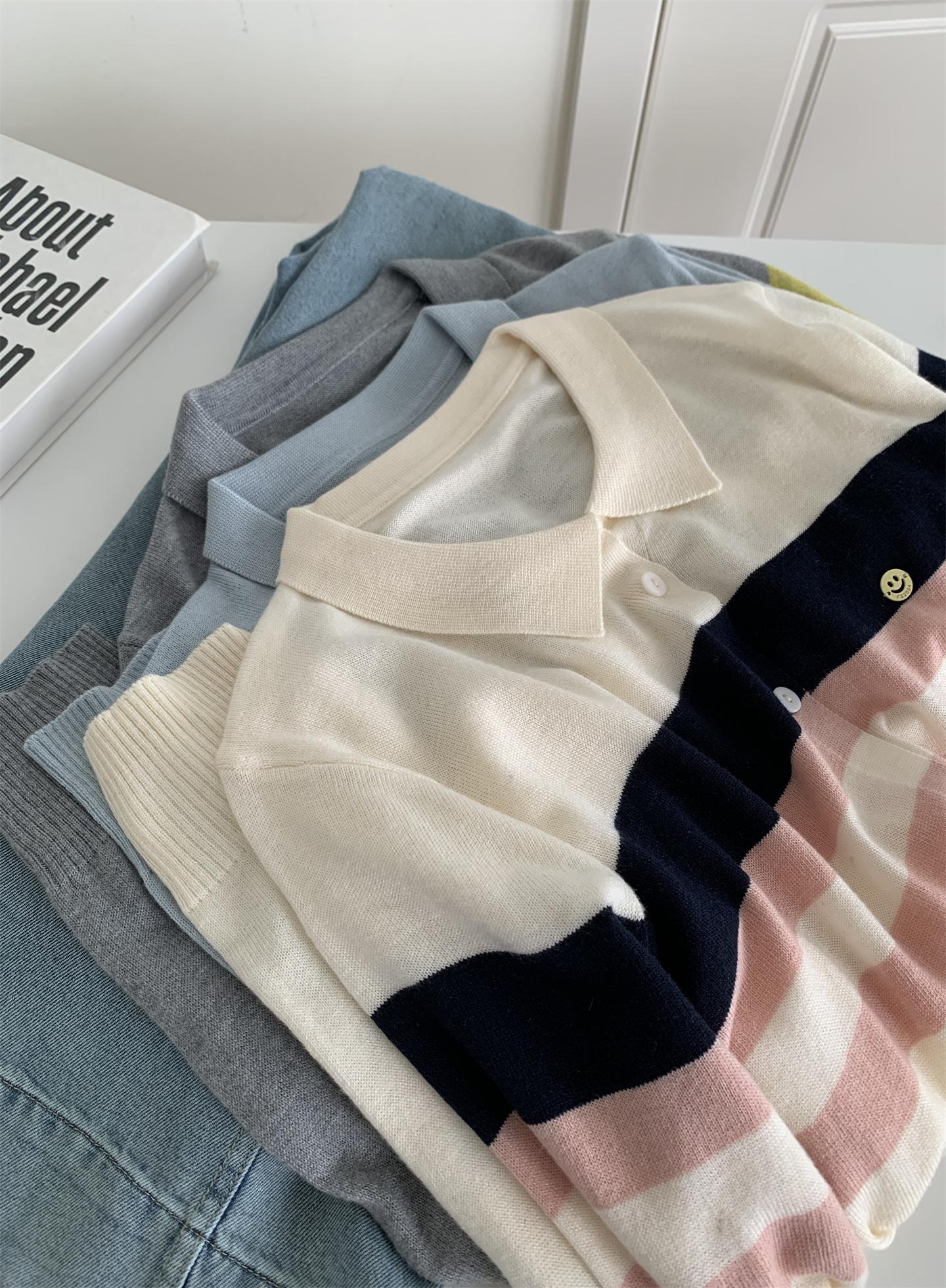 Suéter de Punto con Cuello Abotonado y Cara Sonriente para Mujer, Suave y Delicado con la Piel, Lana Merino, Bloque de Color, Rayado, Tipo Polo, Cárdigan, Chaqueta, Otoño
