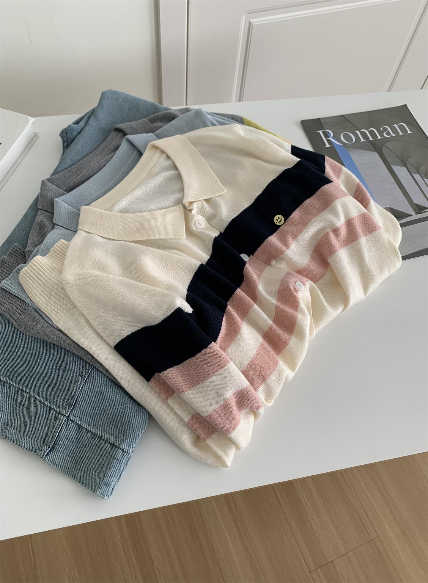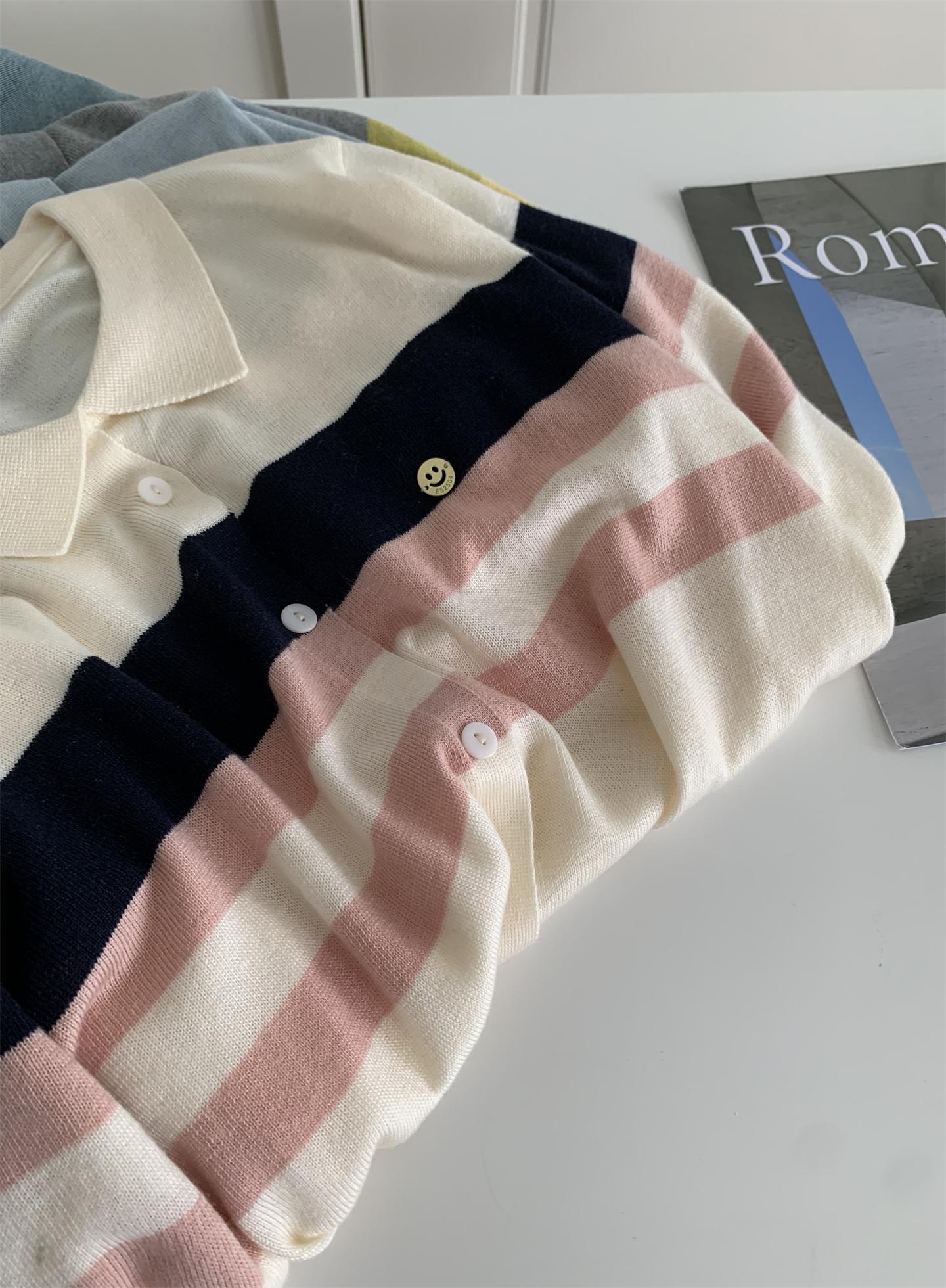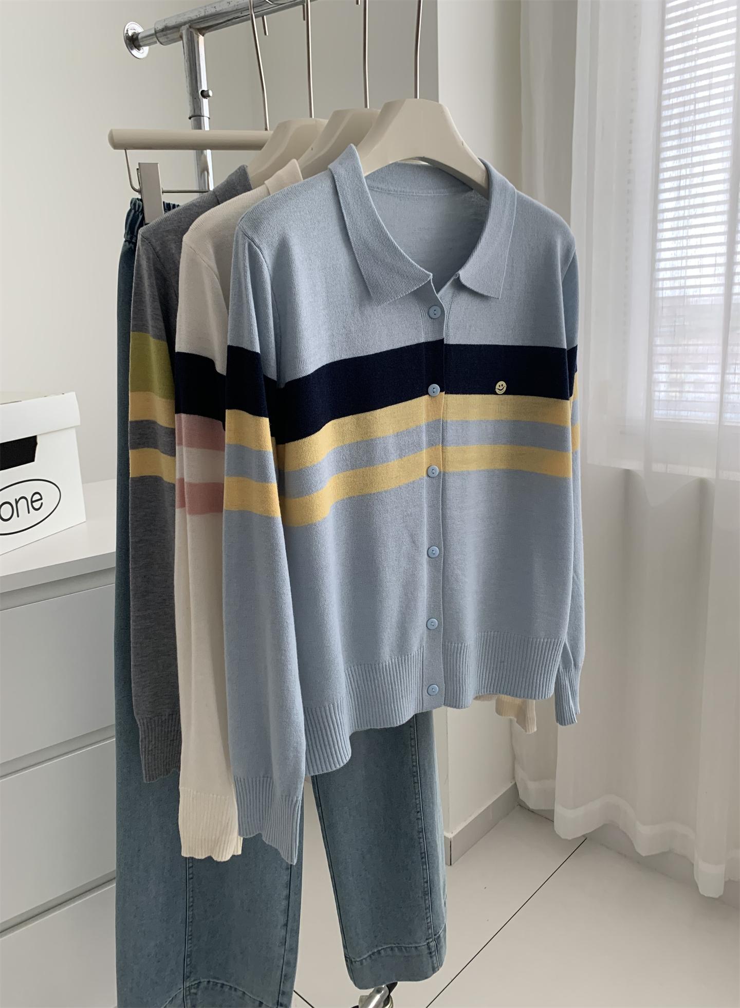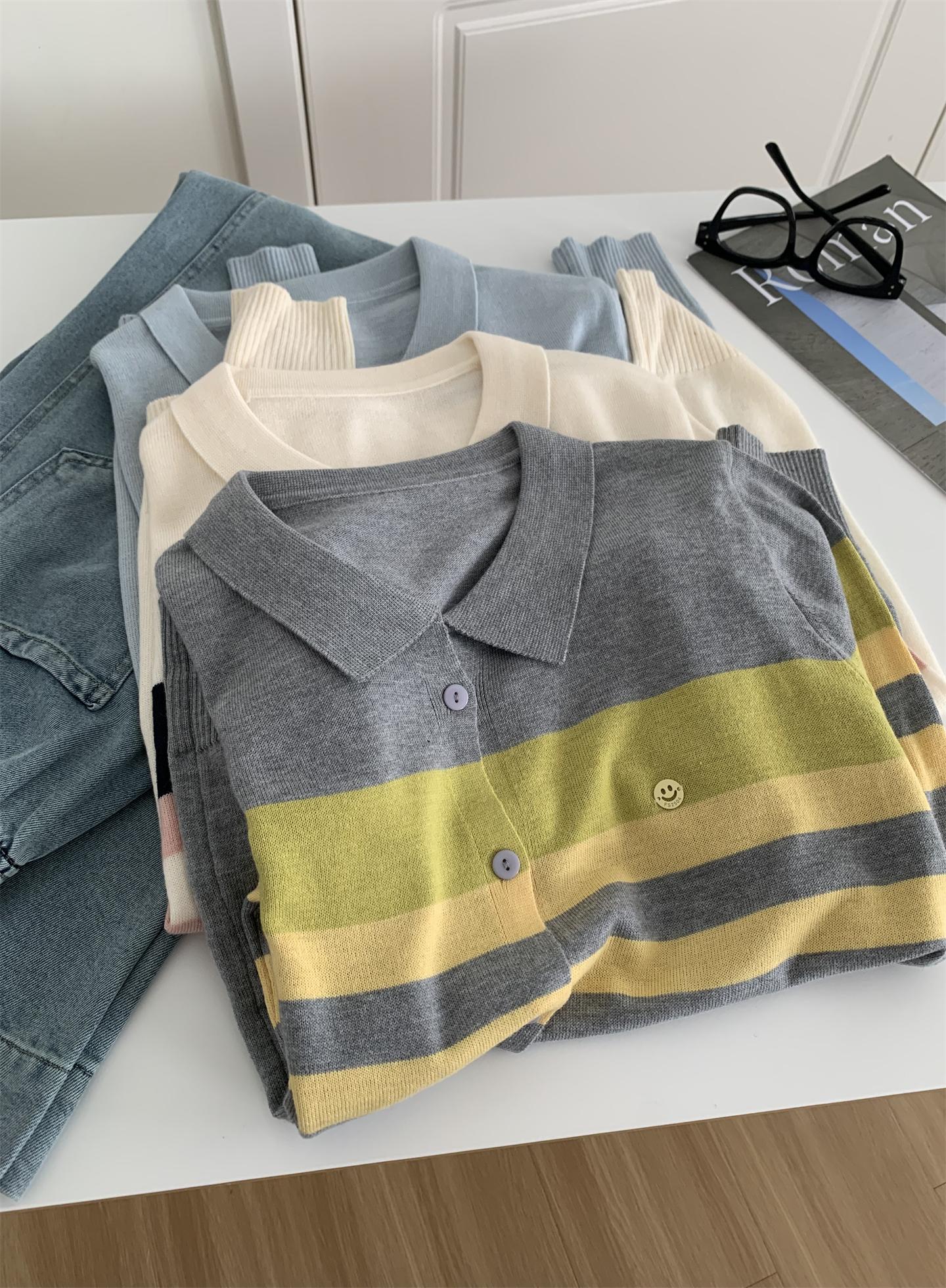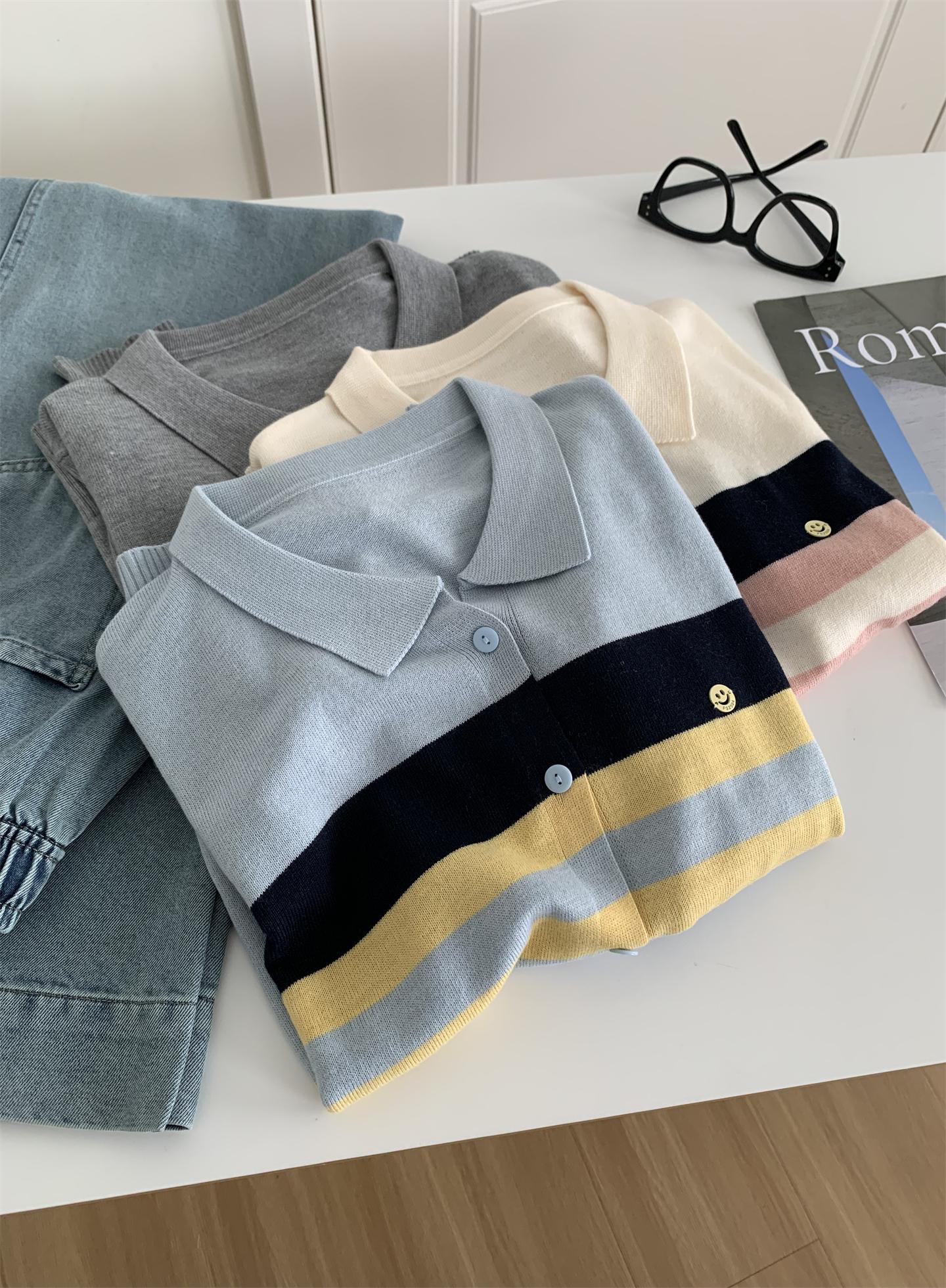 Suéter de Punto con Cuello Abotonado y Cara Sonriente para Mujer, Suave y Delicado con la Piel, Lana Merino, Bloque de Color, Rayado, Tipo Polo, Cárdigan, Chaqueta, Otoño
