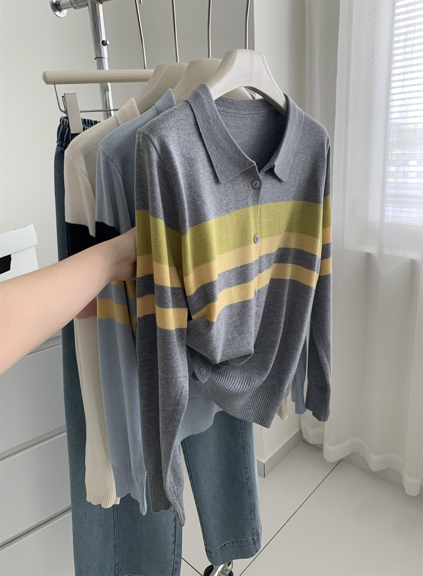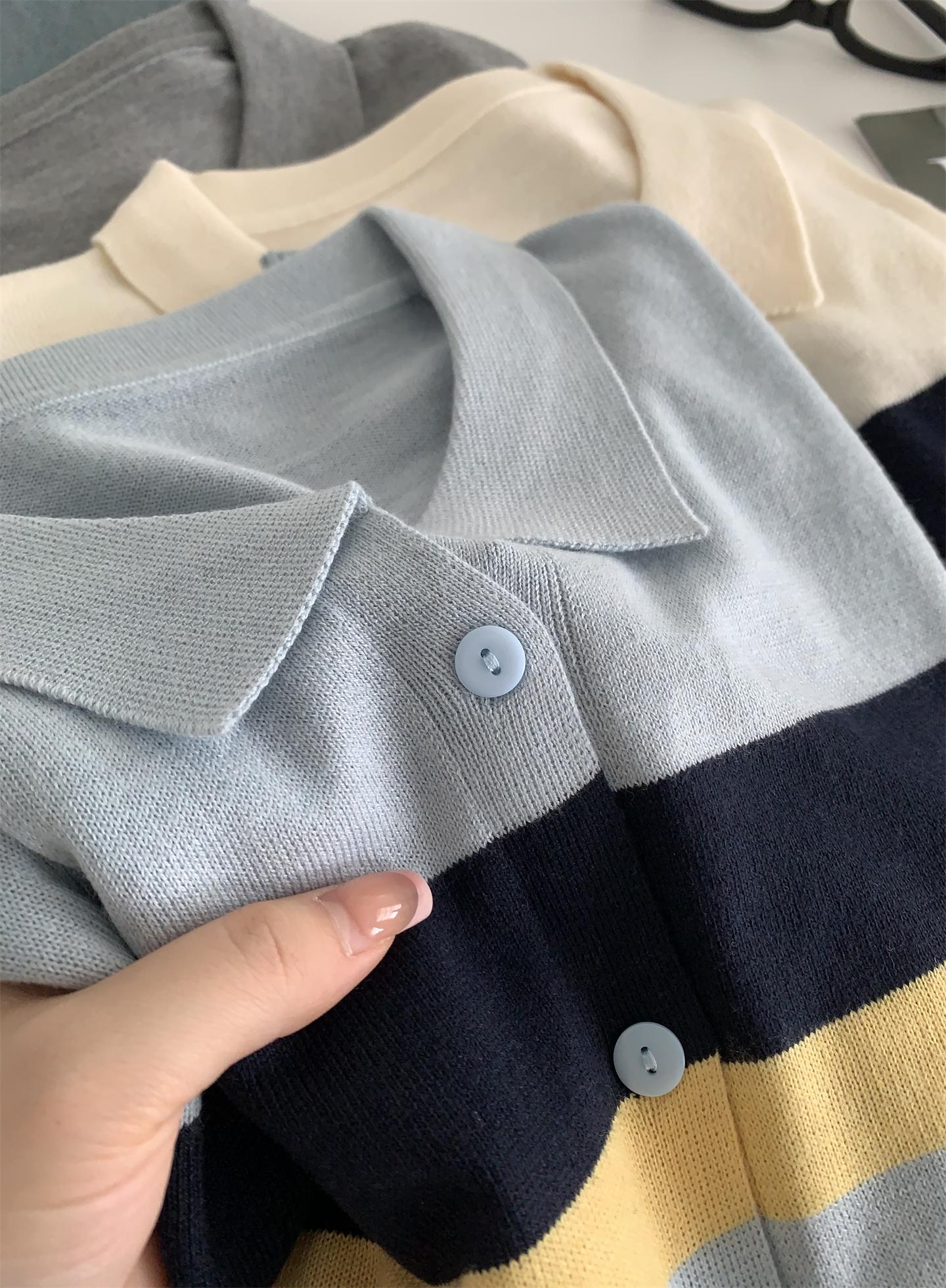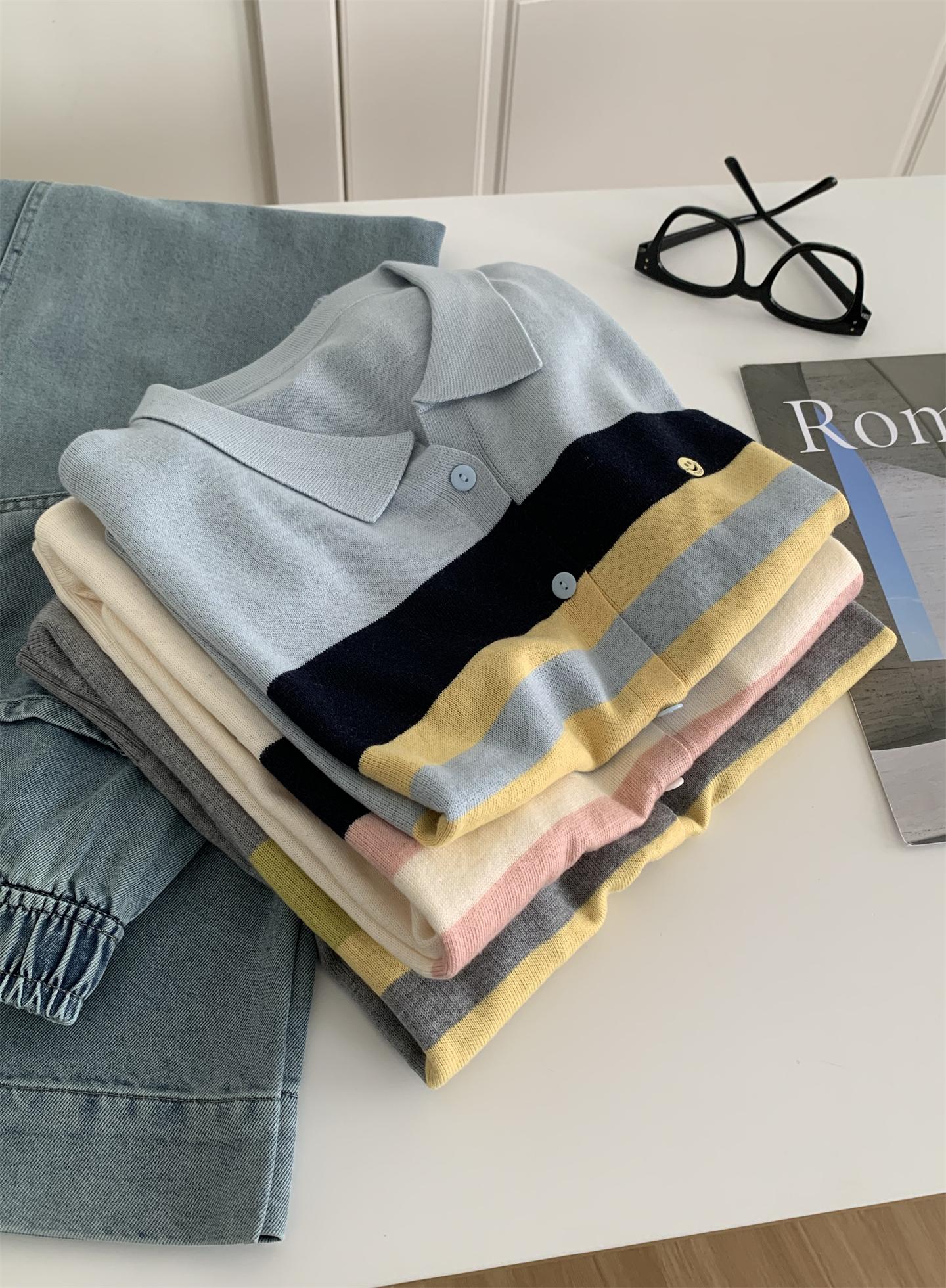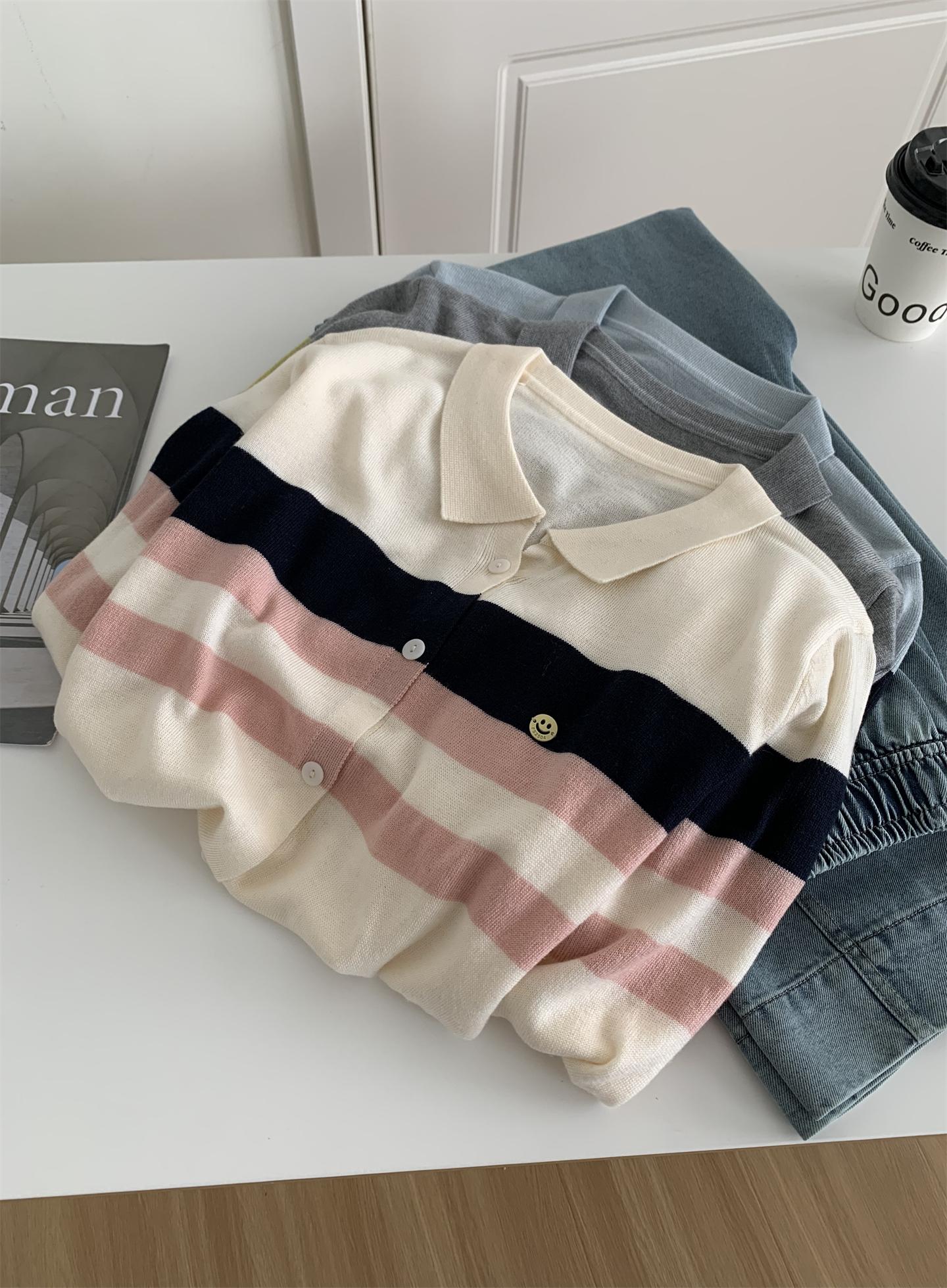 Suéter de Punto con Cuello Abotonado y Cara Sonriente para Mujer, Suave y Delicado con la Piel, Lana Merino, Bloque de Color, Rayado, Tipo Polo, Cárdigan, Chaqueta, Otoño