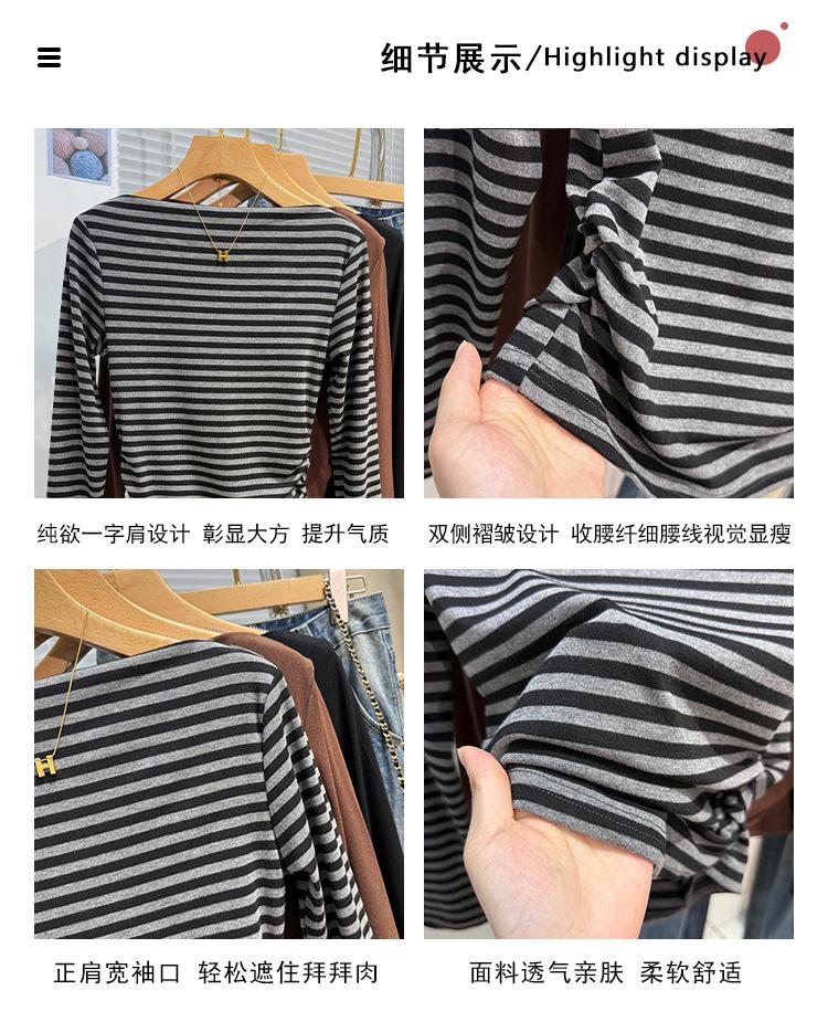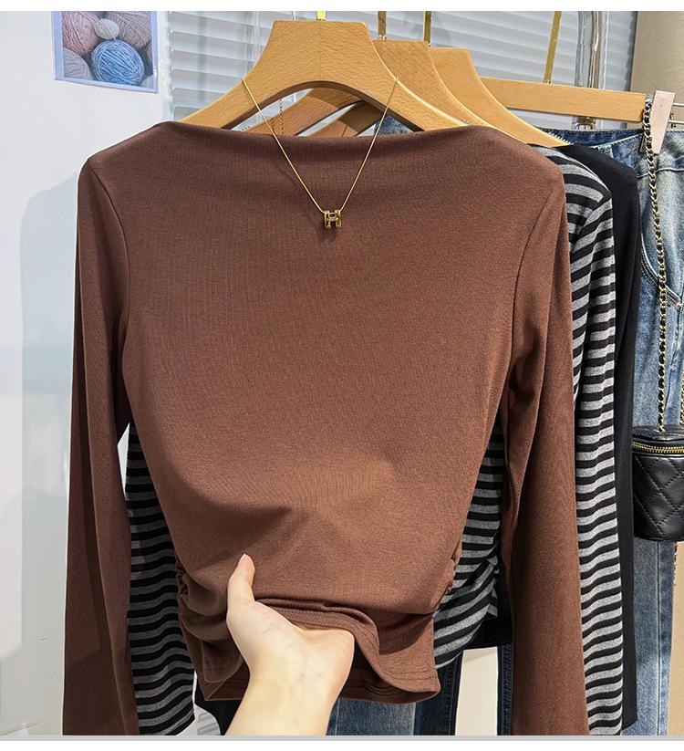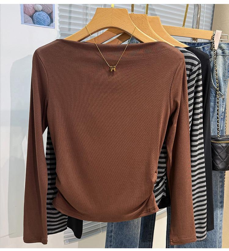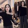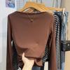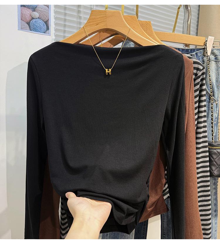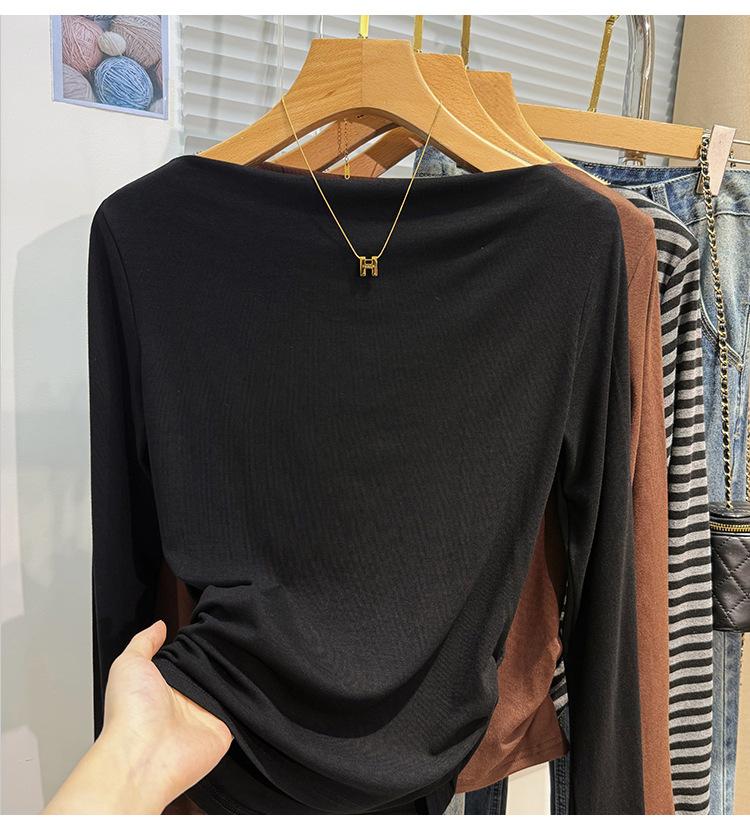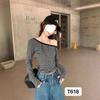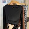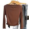 Foto real Camiseta francesa de un hombro de manga larga para mujer otoño e invierno sentido de alta gama fuera del hombro camisa base moda y estilo extranjero top corto