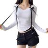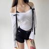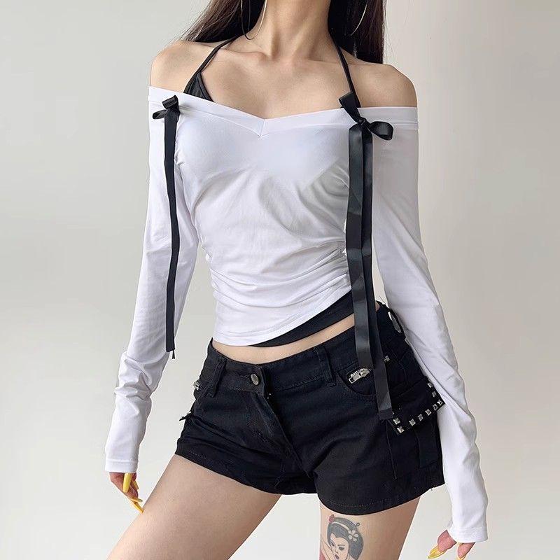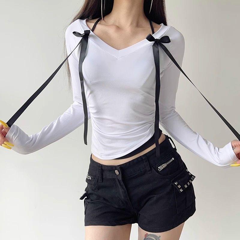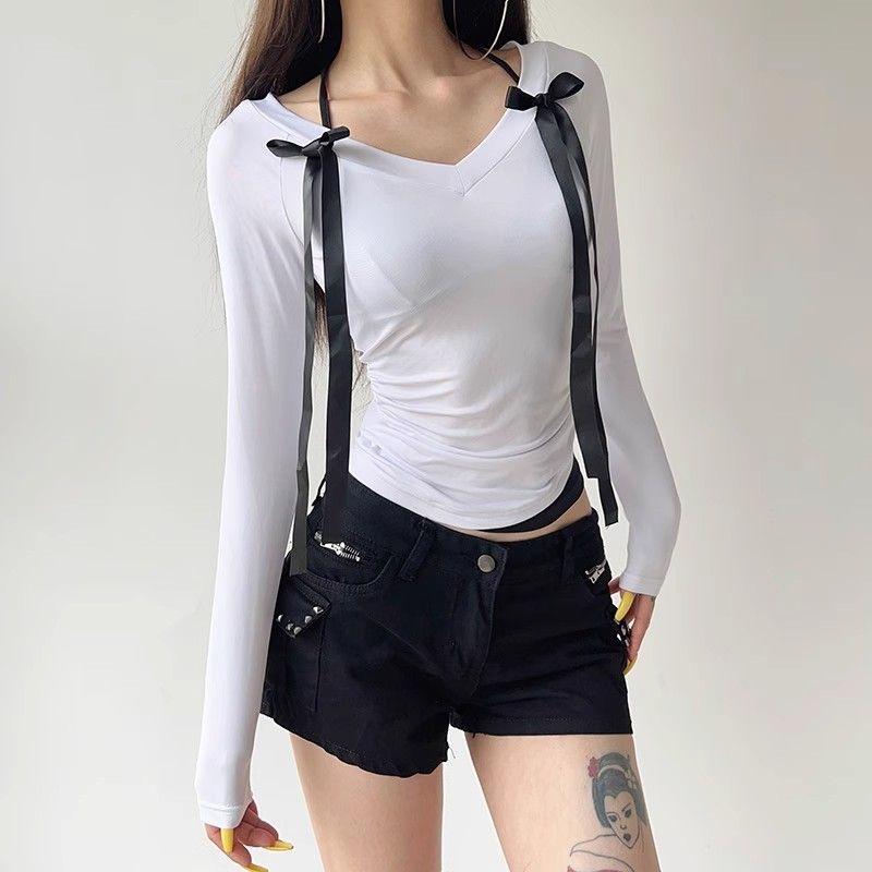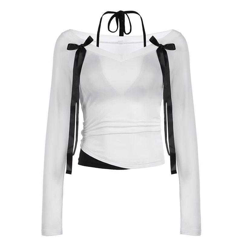 Estilo Coreano Elegante Moda Falso Dos Piezas Puro Femenino Lazo Color Contraste Cuello Manga Larga Camiseta Costuras Top Cuello en V