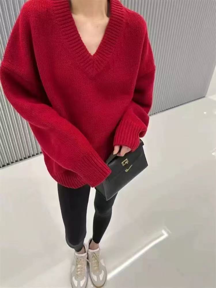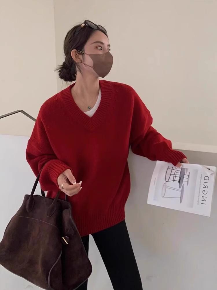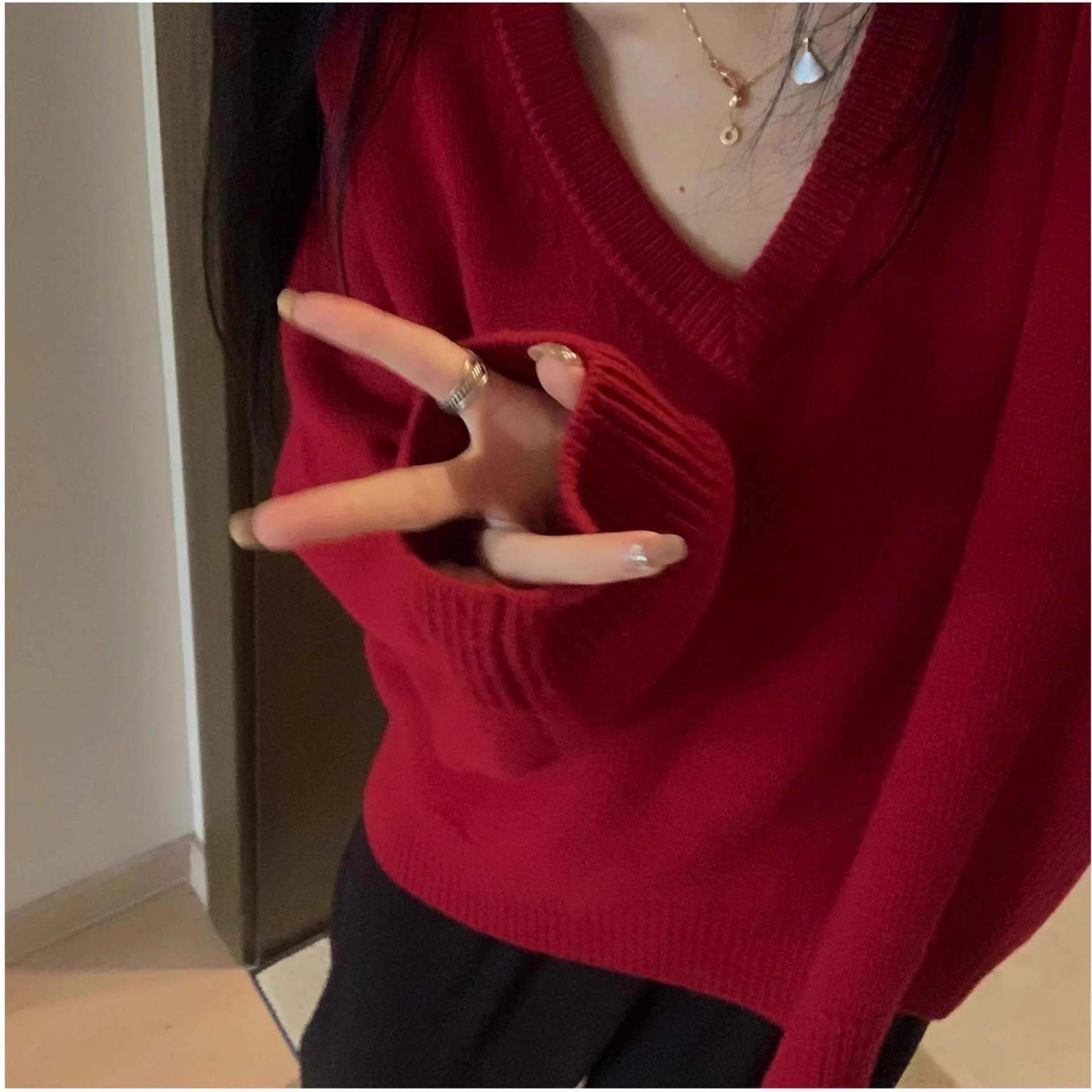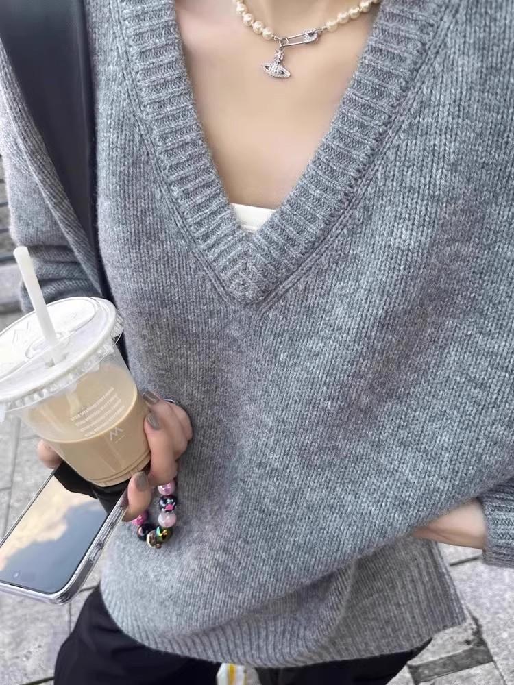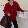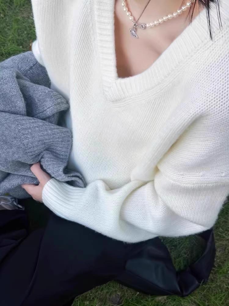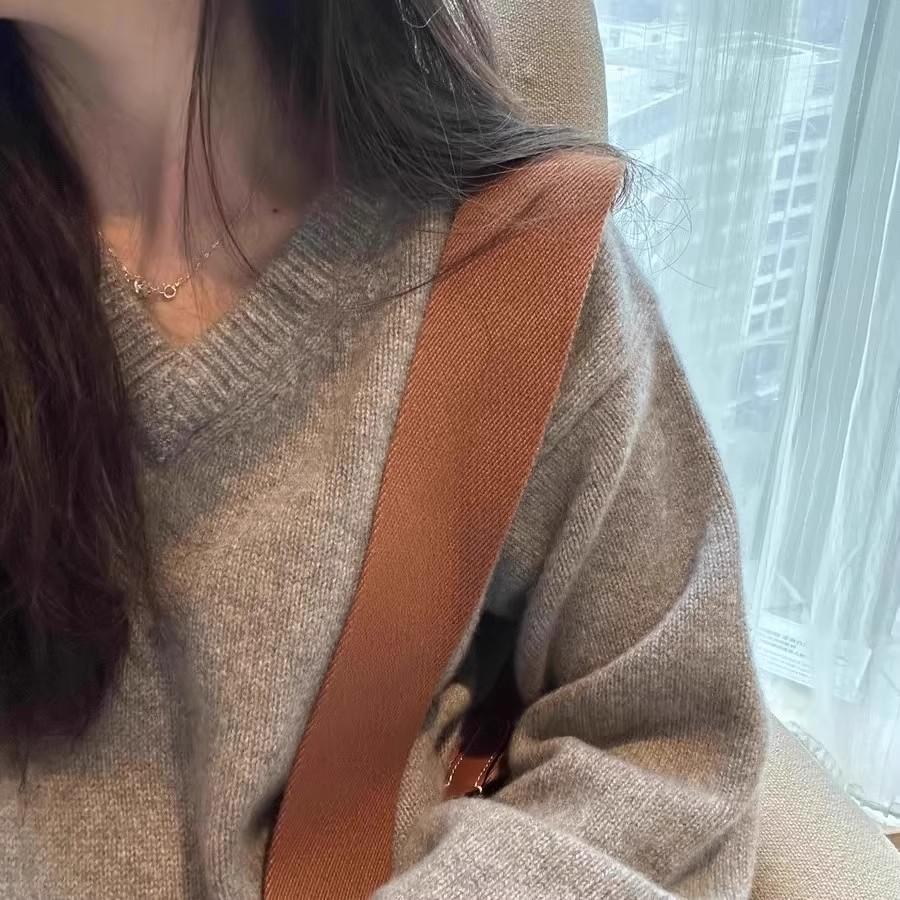 Suéter de Punto de Lana 100% Pura para Mujer, Jersey de Cuello en V, Camiseta Base, Otoño e Invierno, Nuevo Estilo Holgado y Relajado, Tendencia Ropa Interior