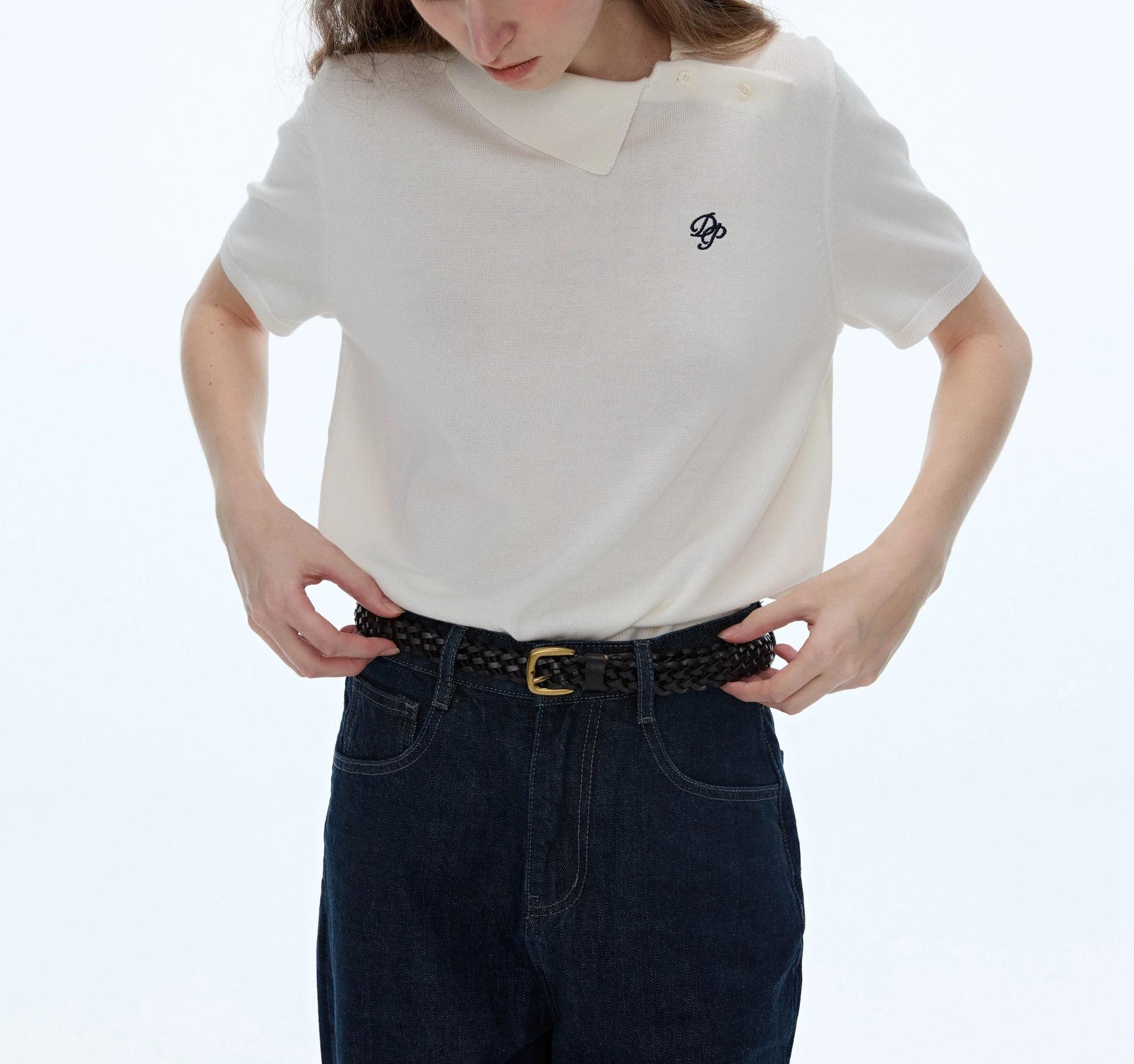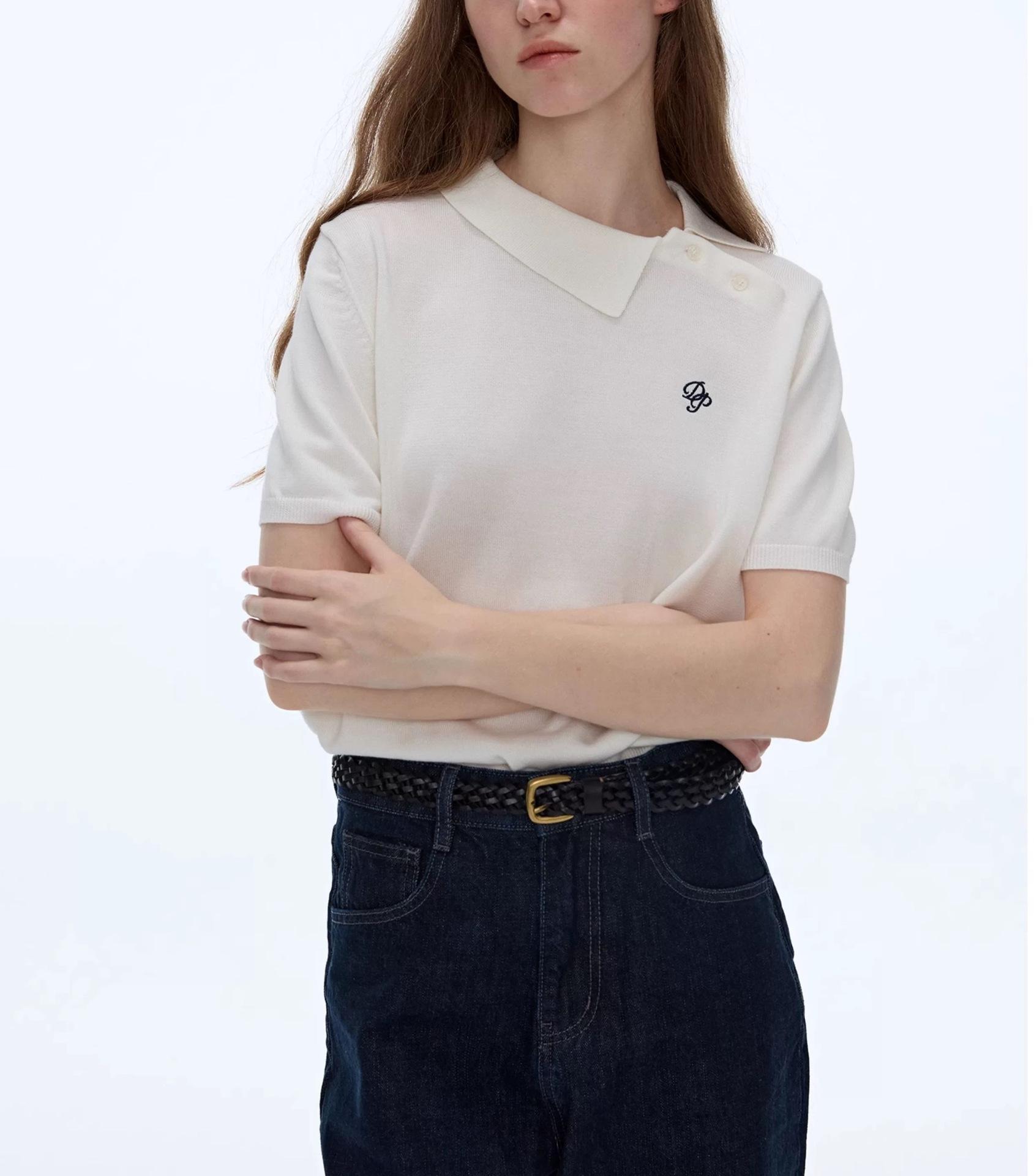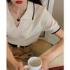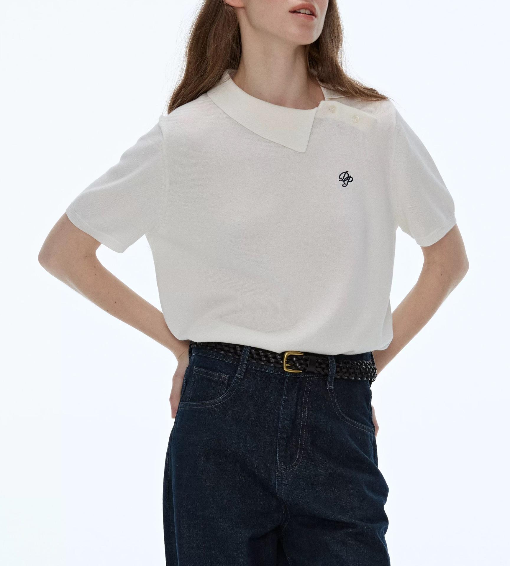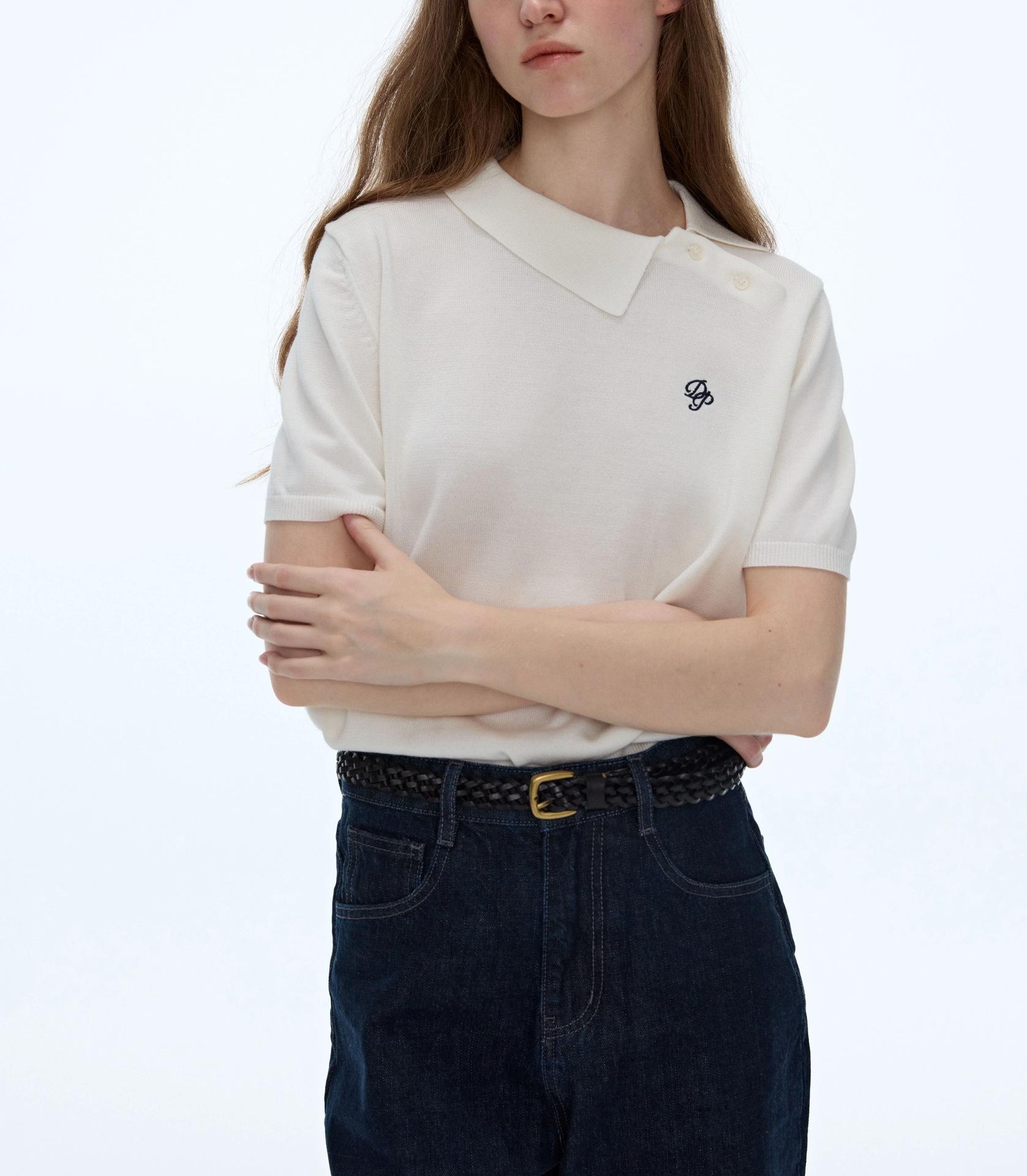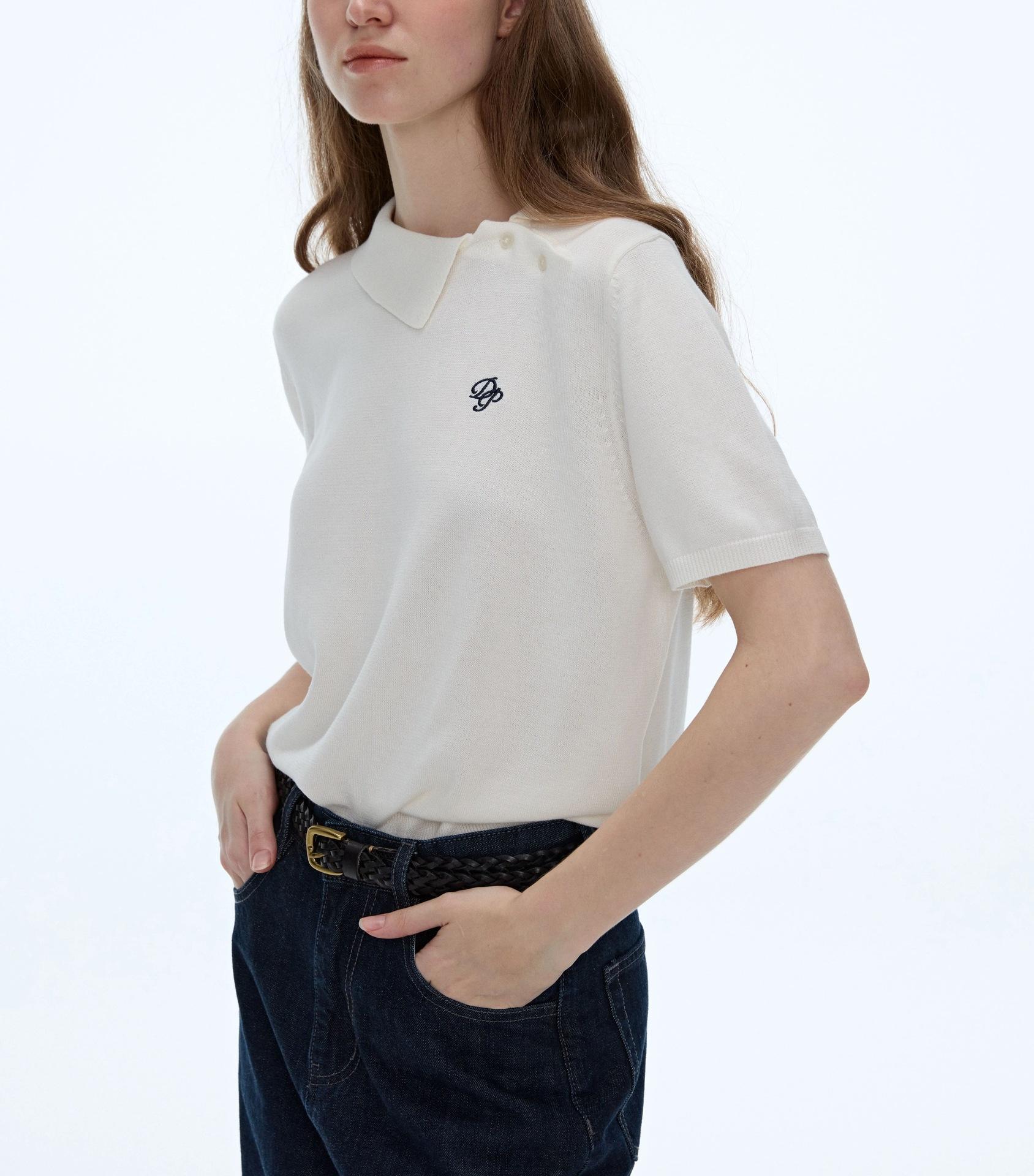 Polo Blanco Retro de Nicho Otoño Temprano Versátil Estilo Preppy Casual Manga Corta Tejido Bordado Top Mujer