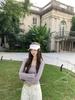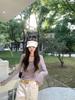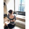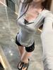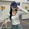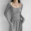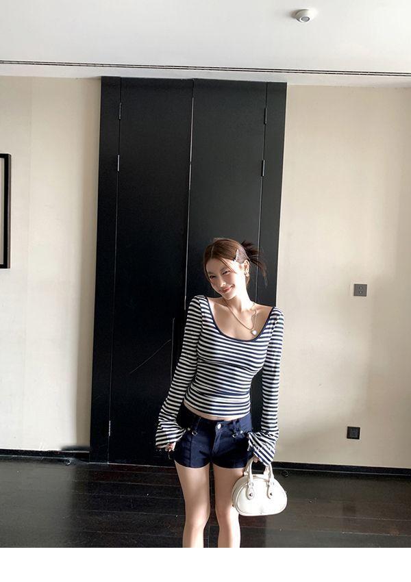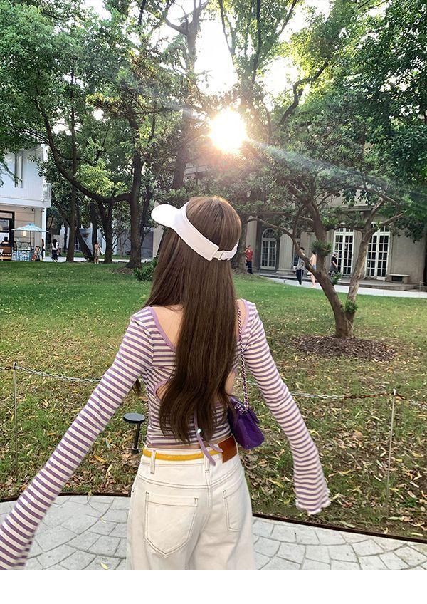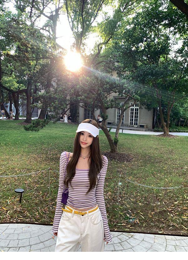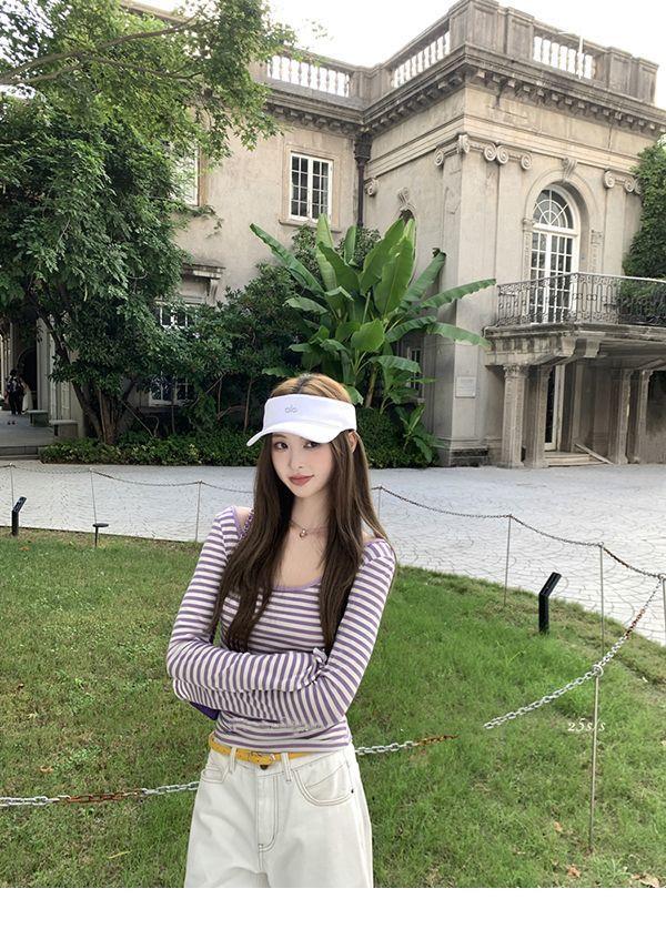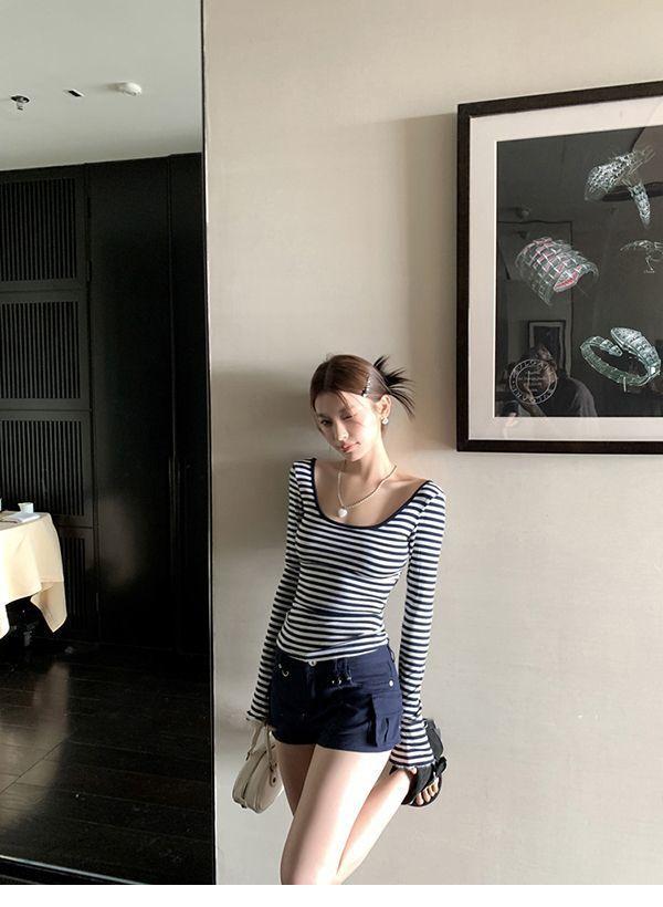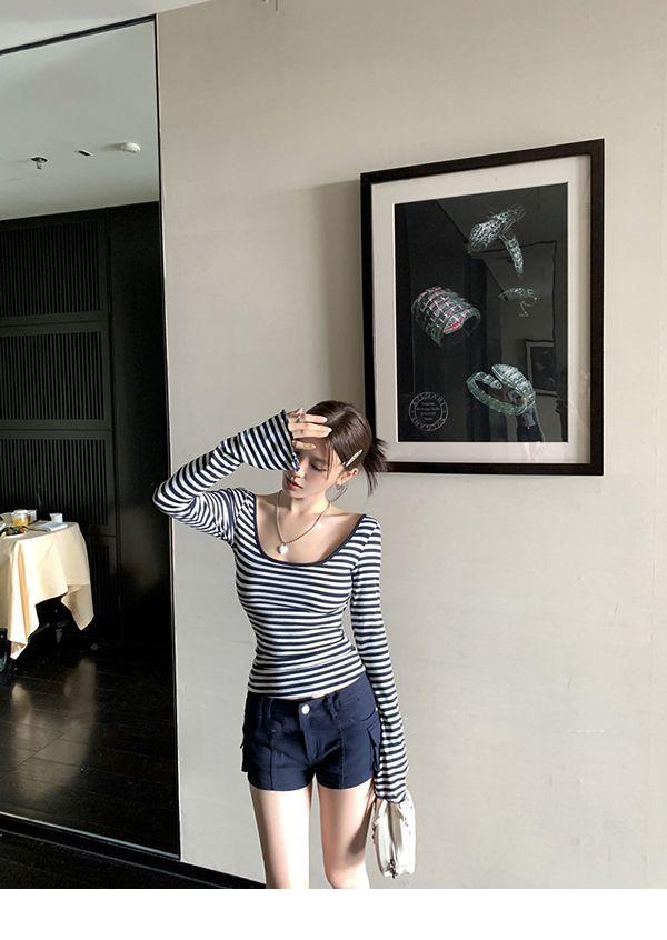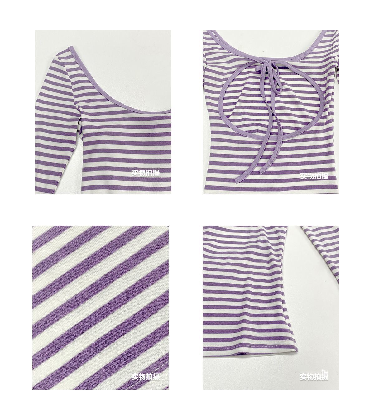Playera de Chica Caliente de Rayas sin Espalda Pura y Sexy de Cuello U Grande de Manga Larga Otoño 2025 Diseño de Hombro Recto Ajustado Top de Capa Interior para Mujer