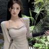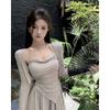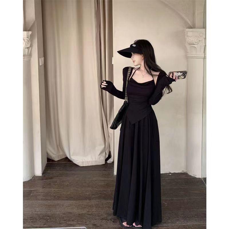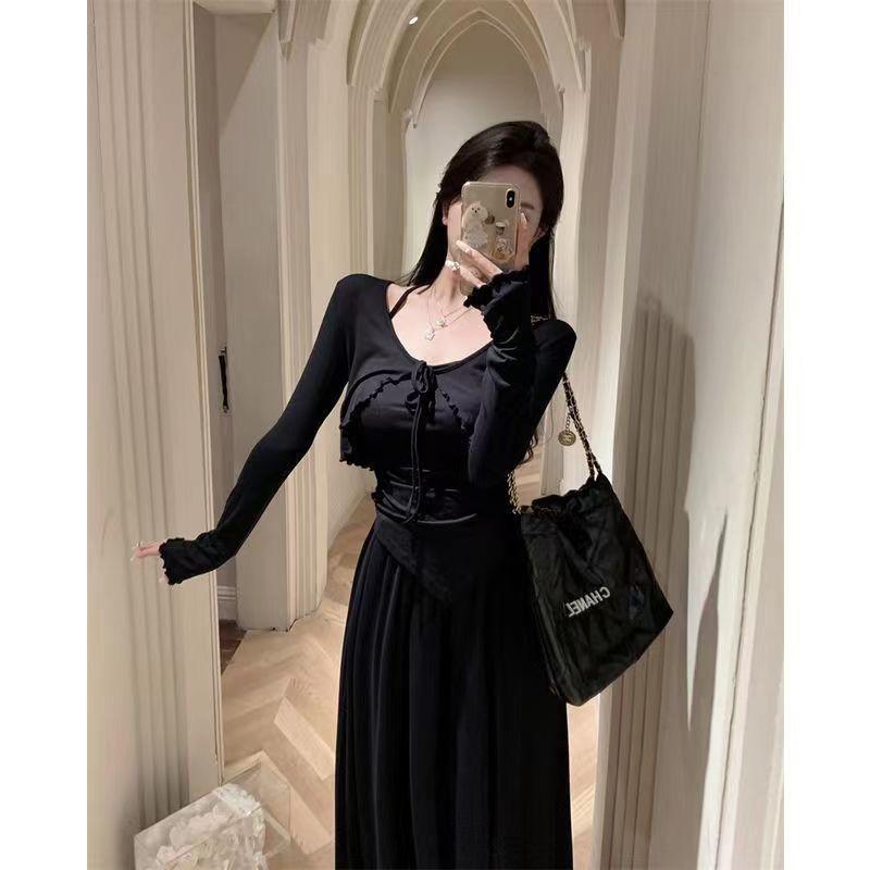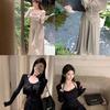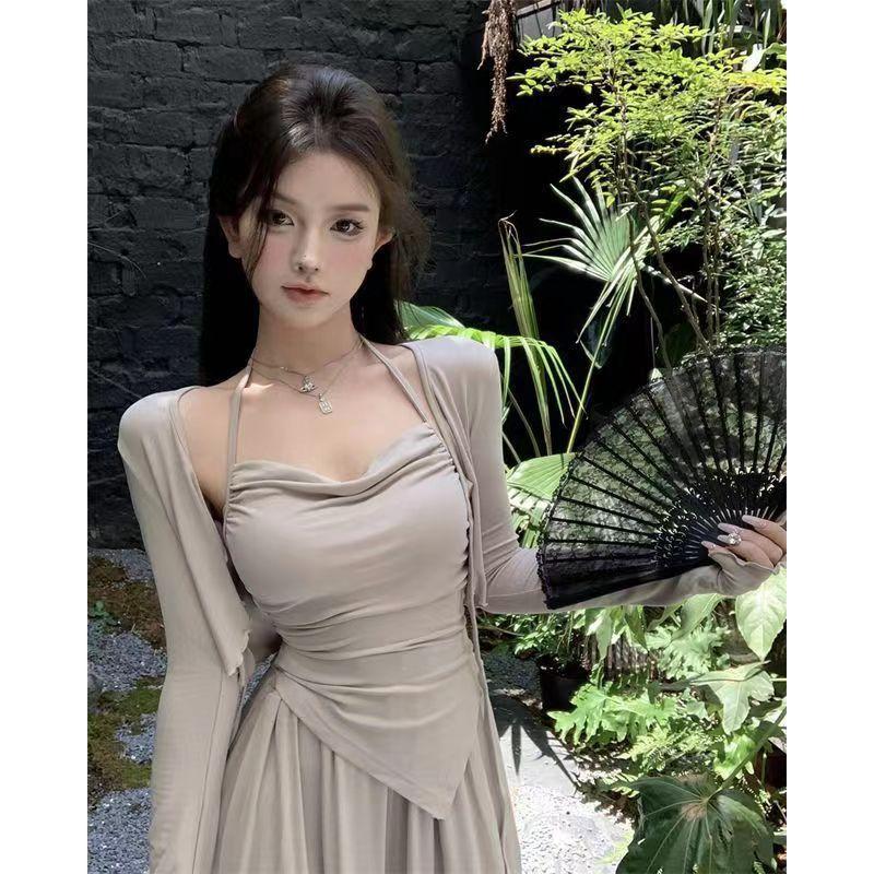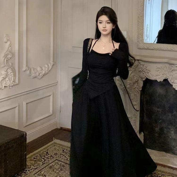 khaki cardigan+camisole+culottes+three-piece set, black cardigan+sling+culottes+three-piece set, Brown cardigan + single piece
