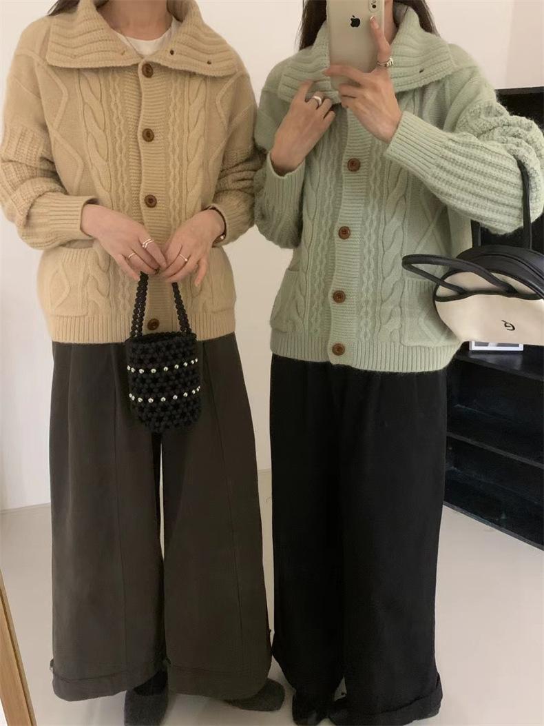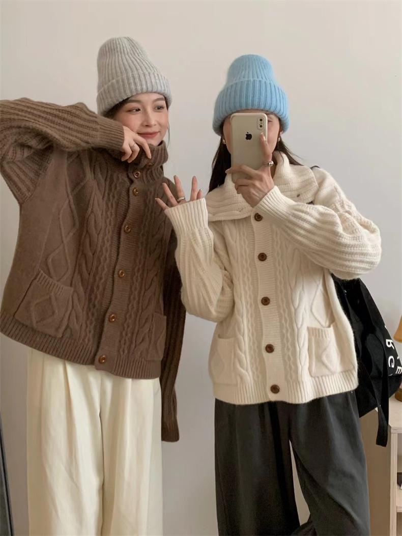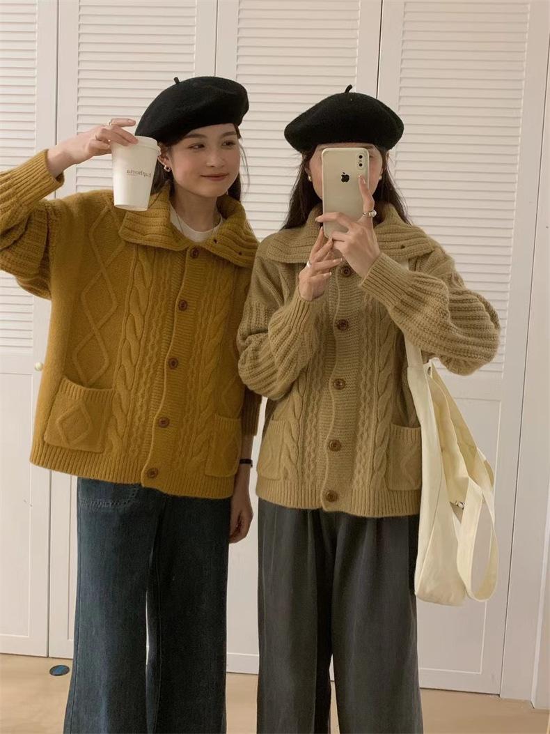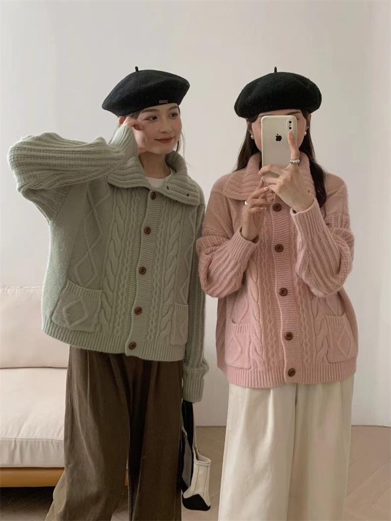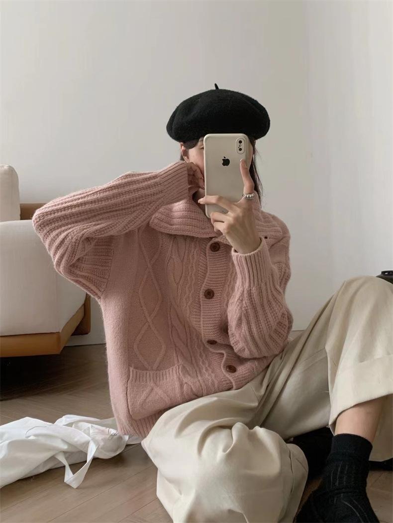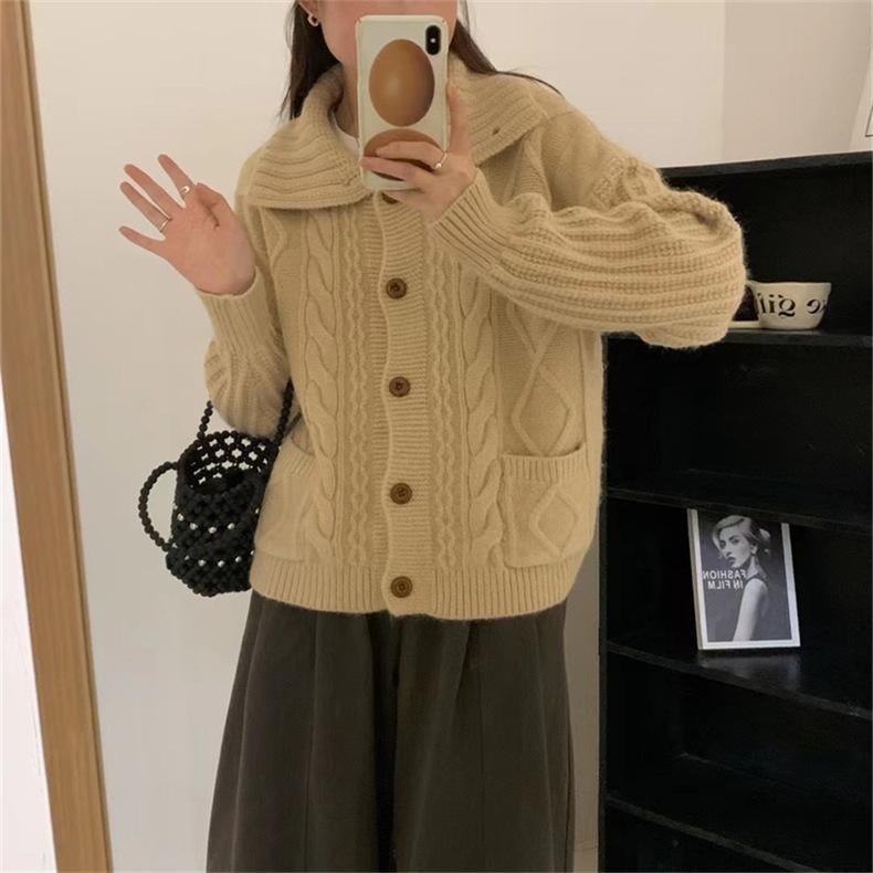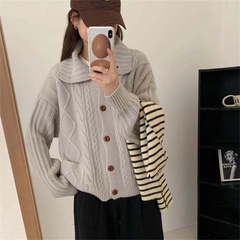 Cárdigan de Punto con Solapa de Estilo Coreano de Estilo Suave para Mujer, Suéter Holgado Corto de Un Solo Botón, Otoño e Invierno, Retro, con Trenzas