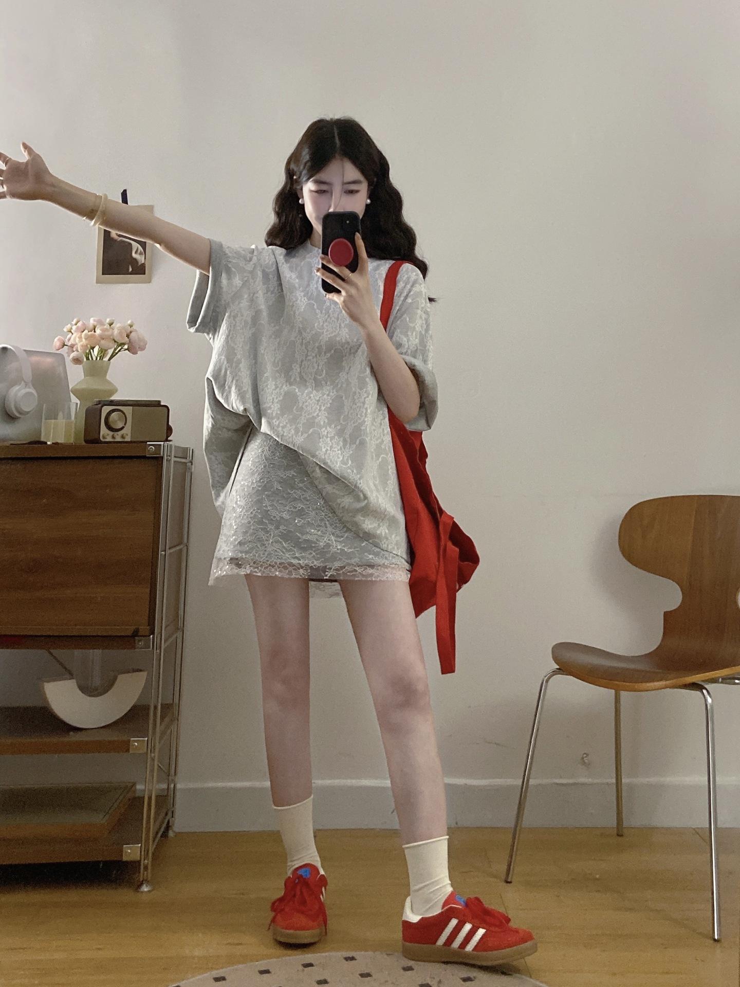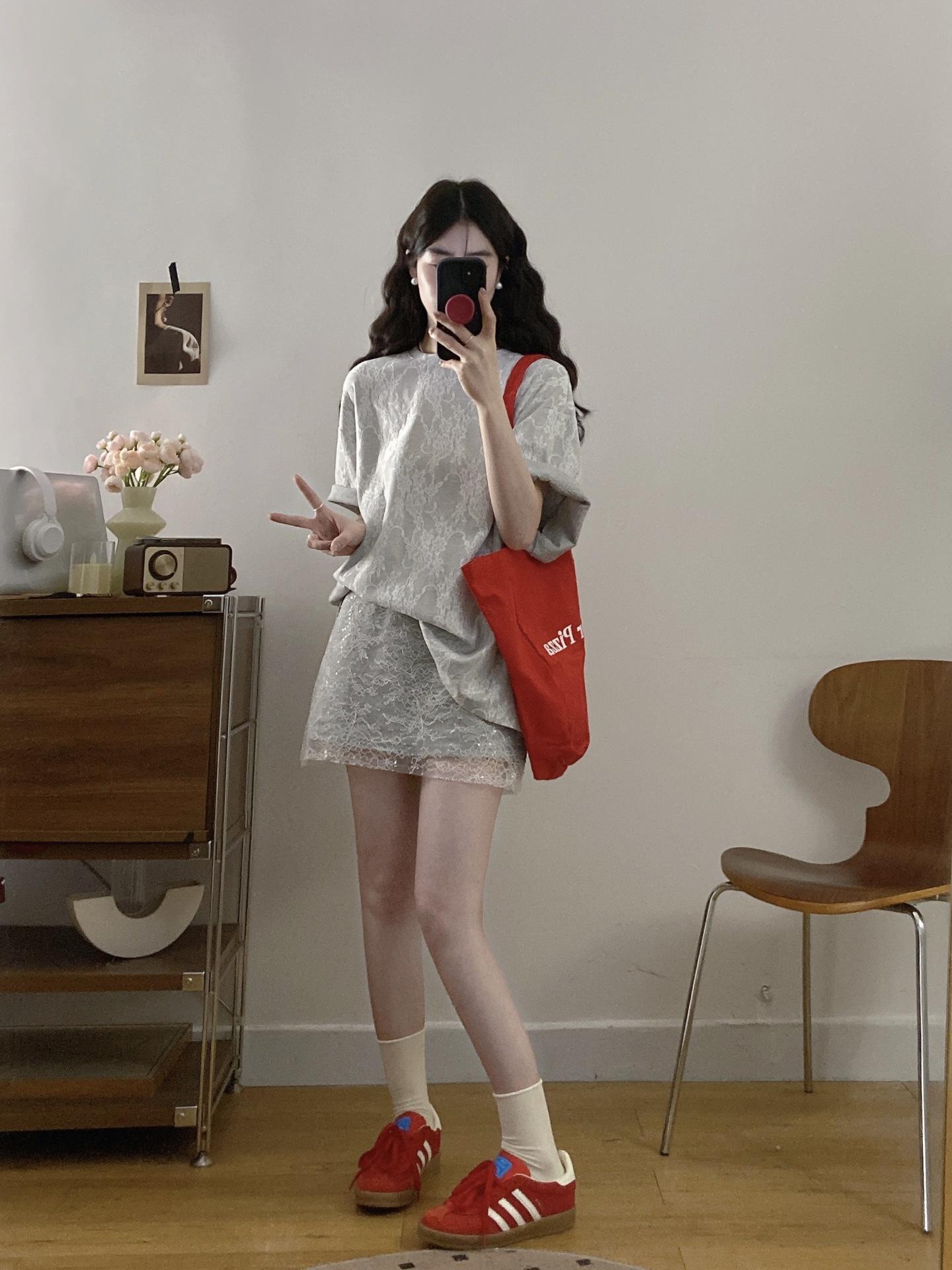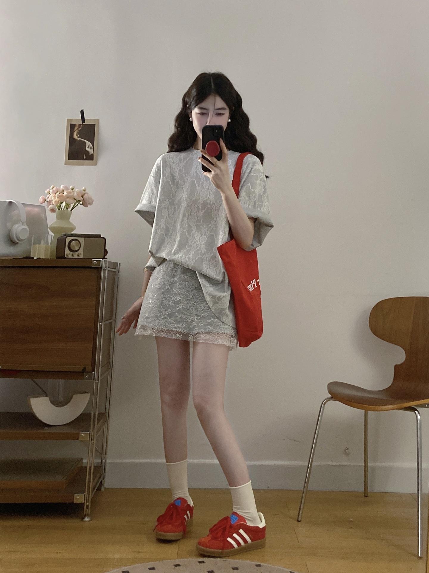 Talla Grande Verano Nuevo Suelto Perezoso Encaje Empalmado Manga Corta Top Casual Falda Cintura Alta Traje de Moda para Mujer