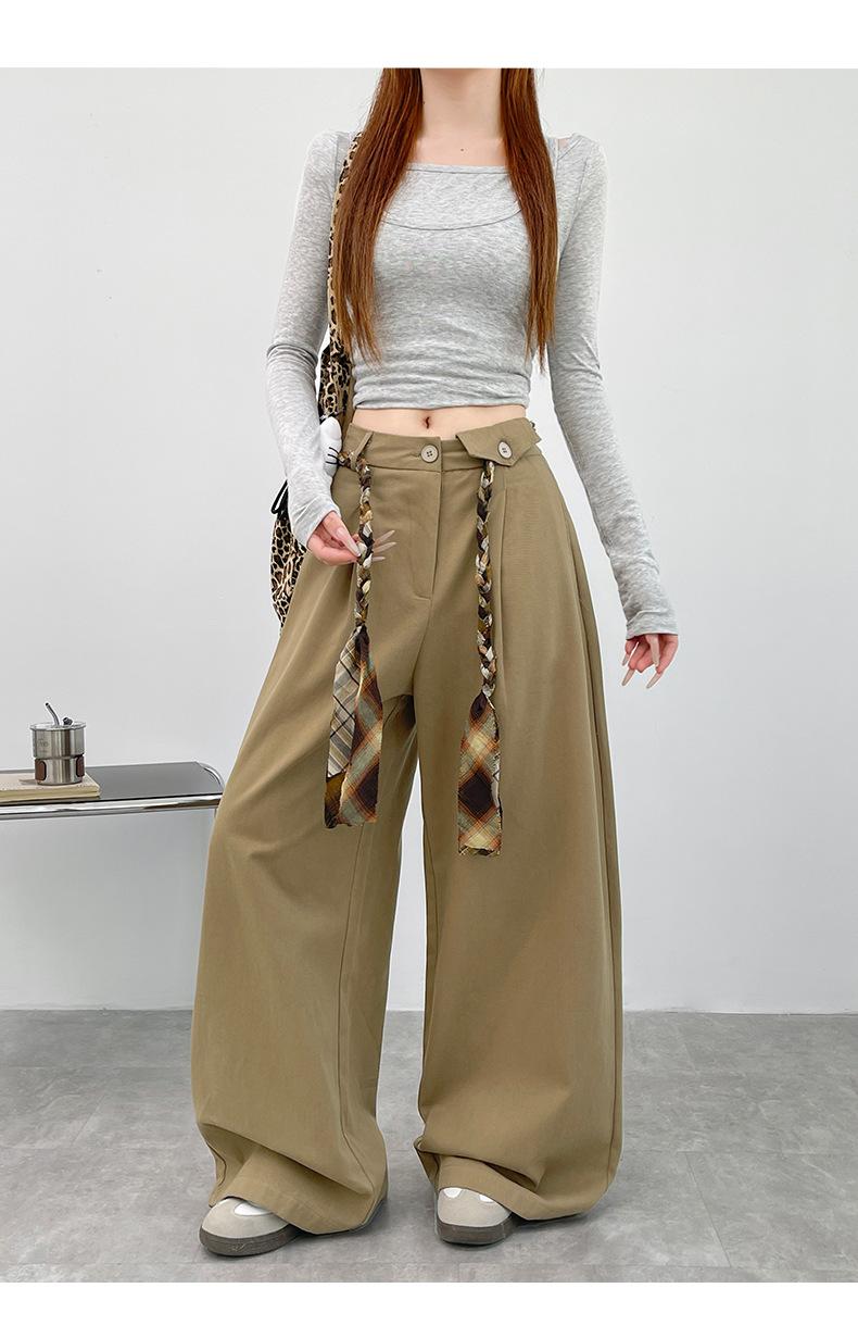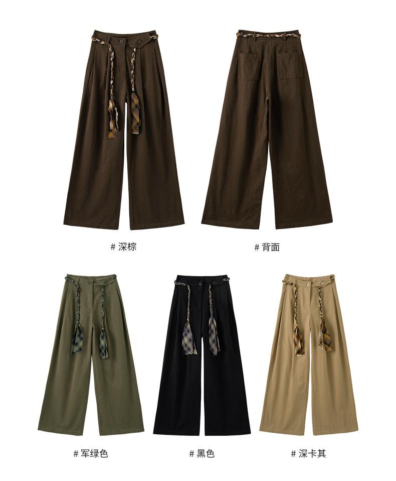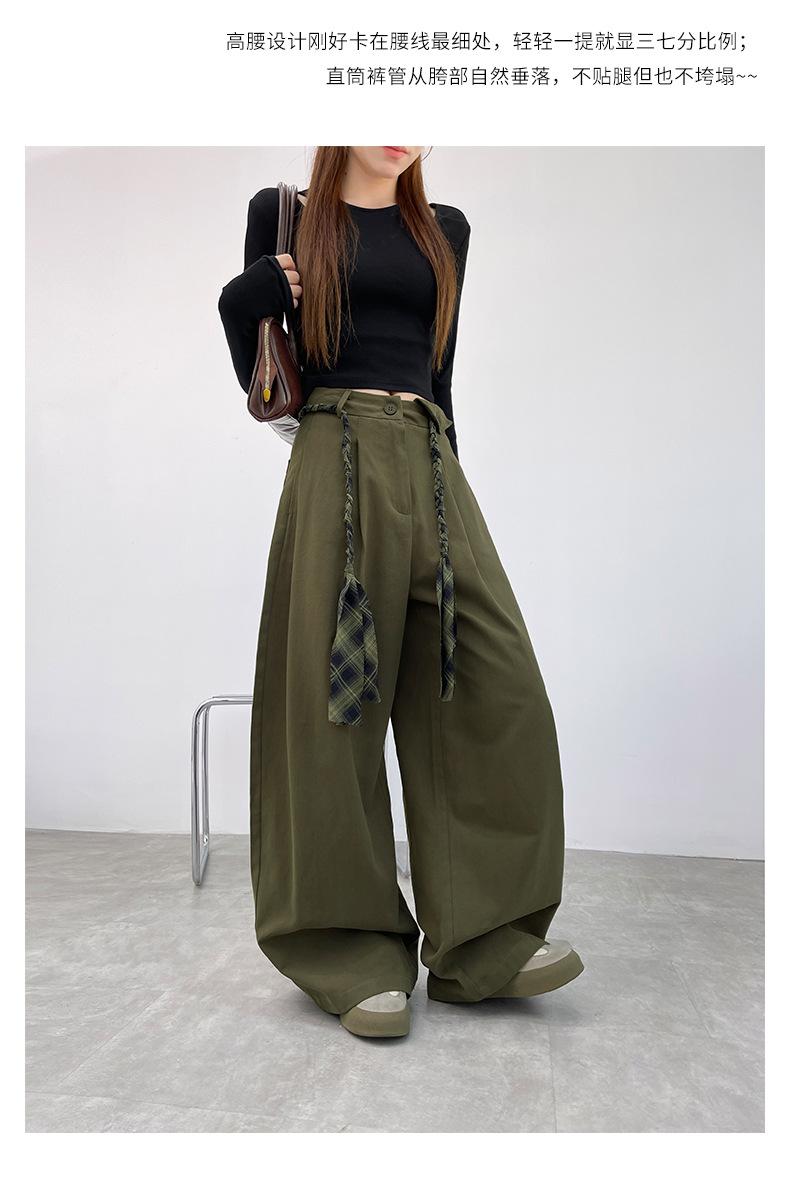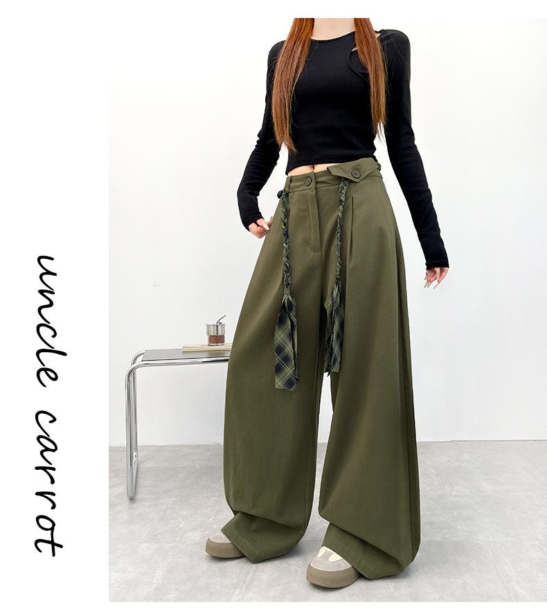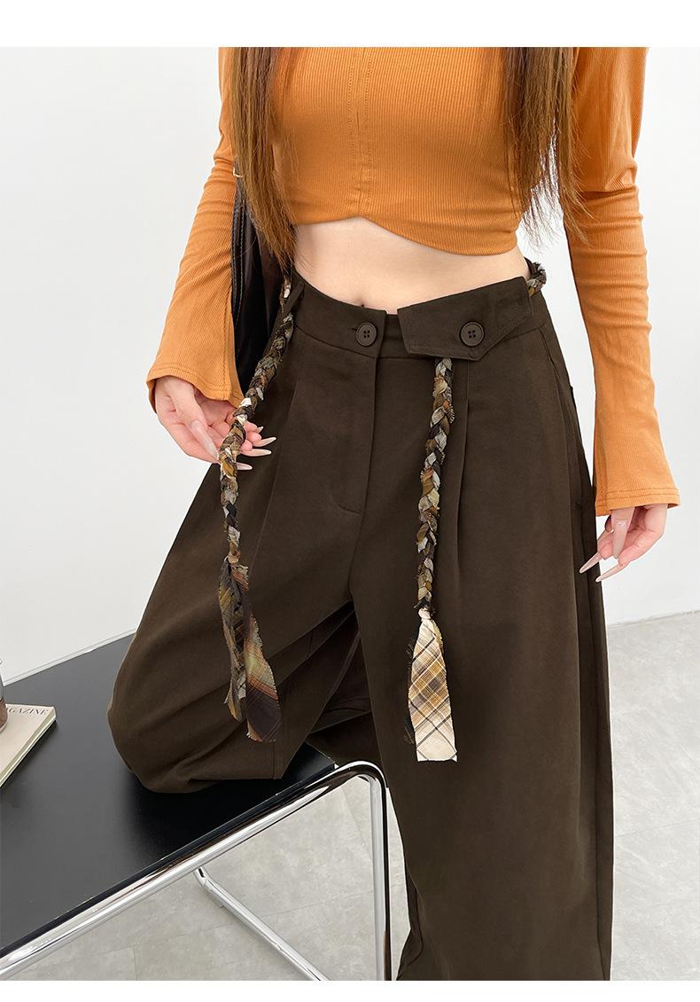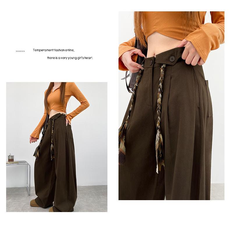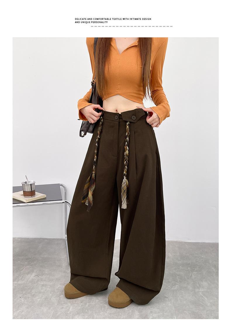 Pantalones de trabajo americanos de algodón lavado para mujer 2025 otoño nuevo diseño de cintura alta sentido de atar retro drapeado pantalones de pierna ancha