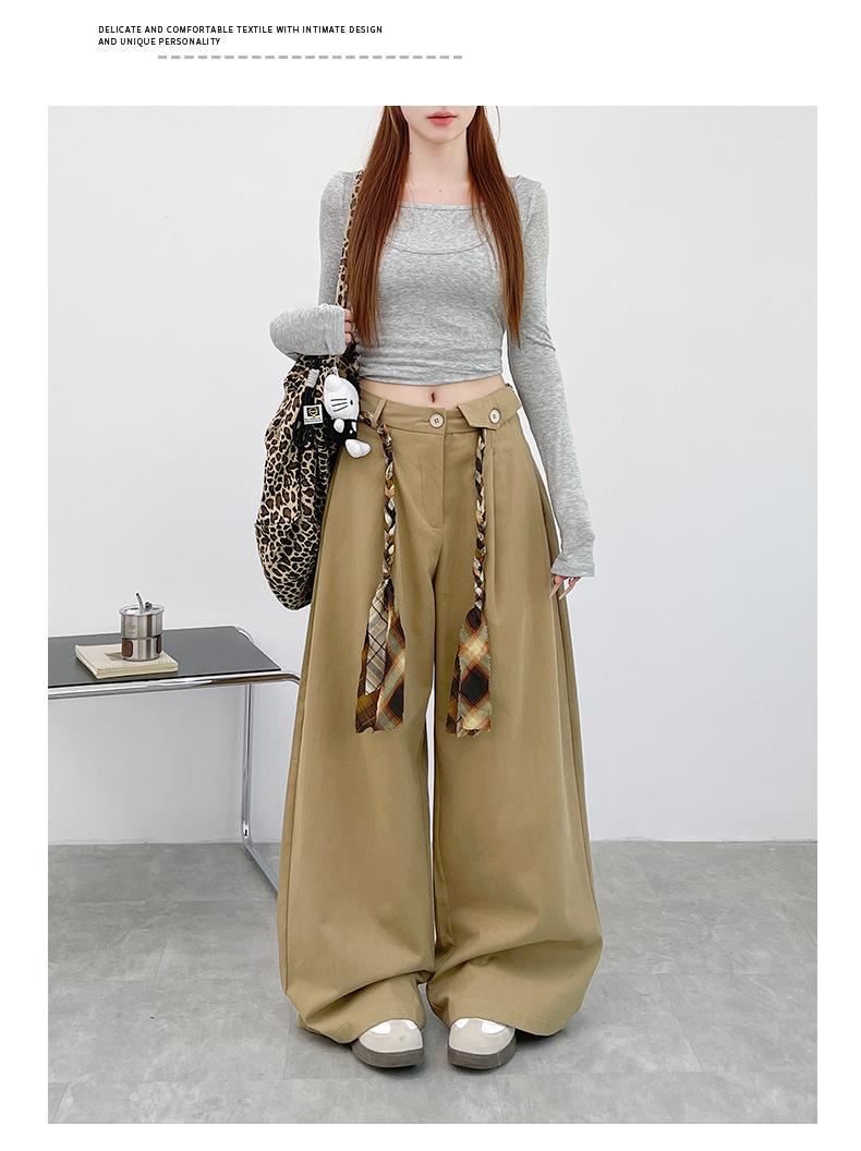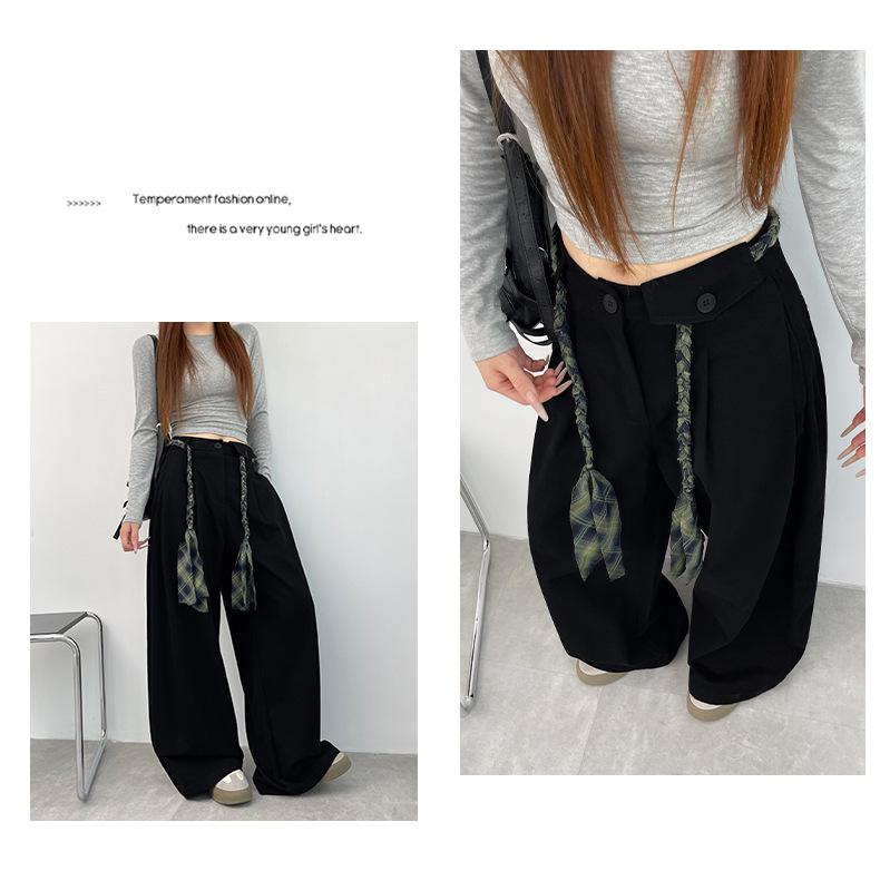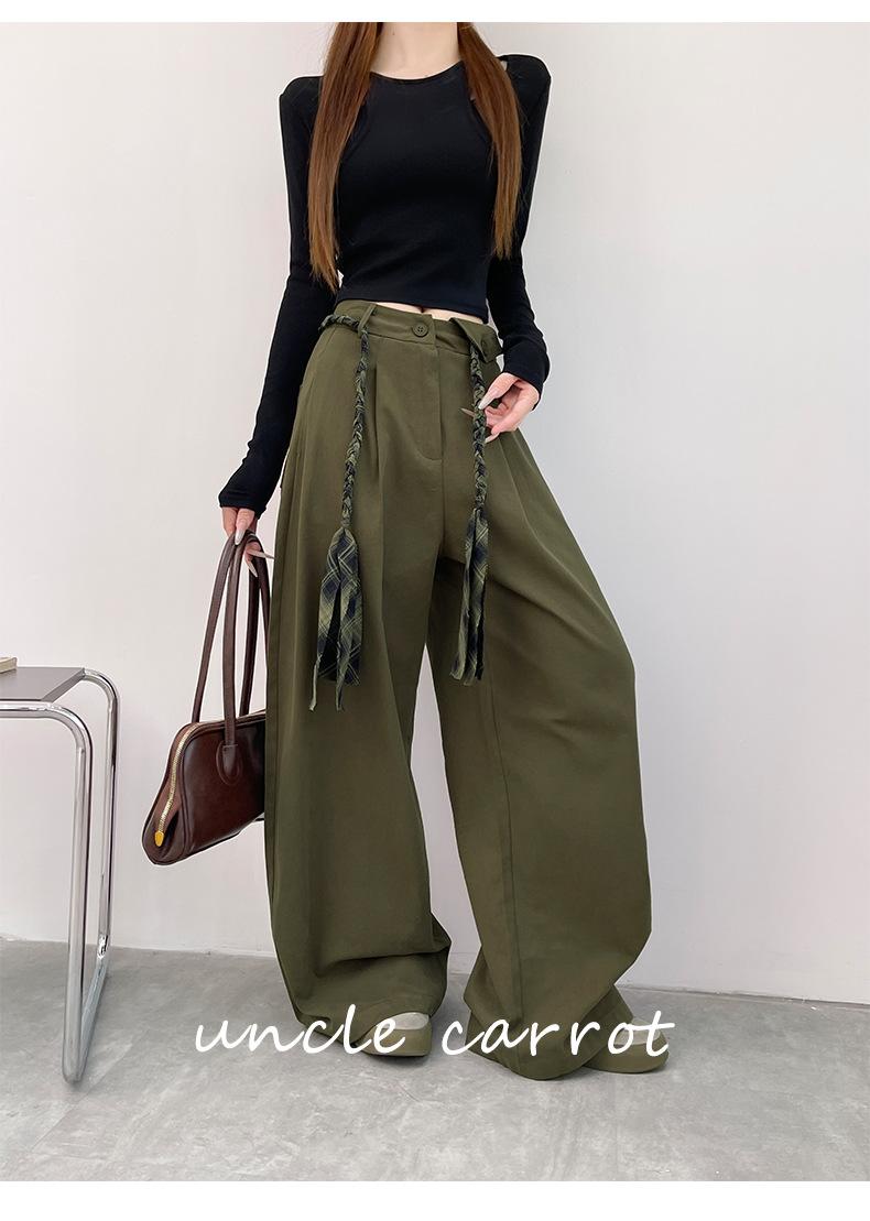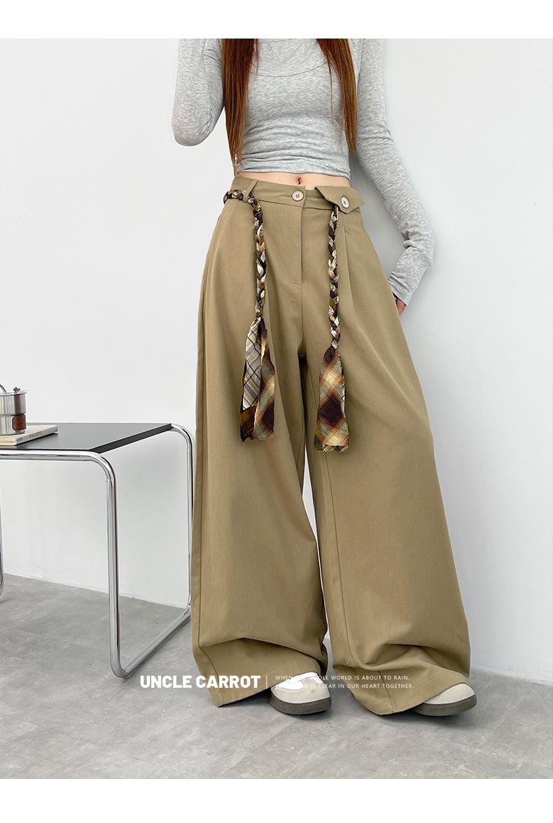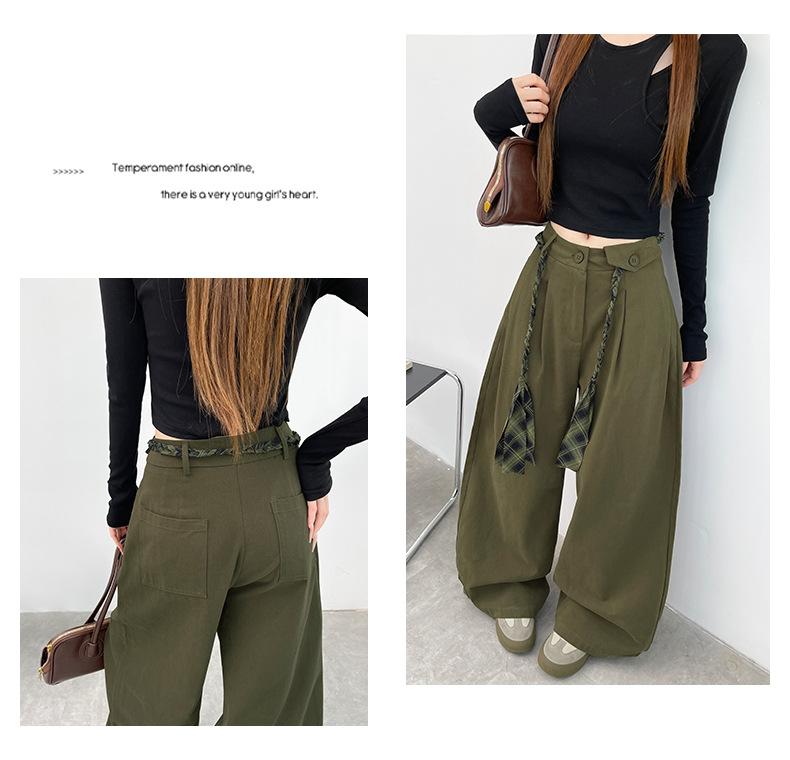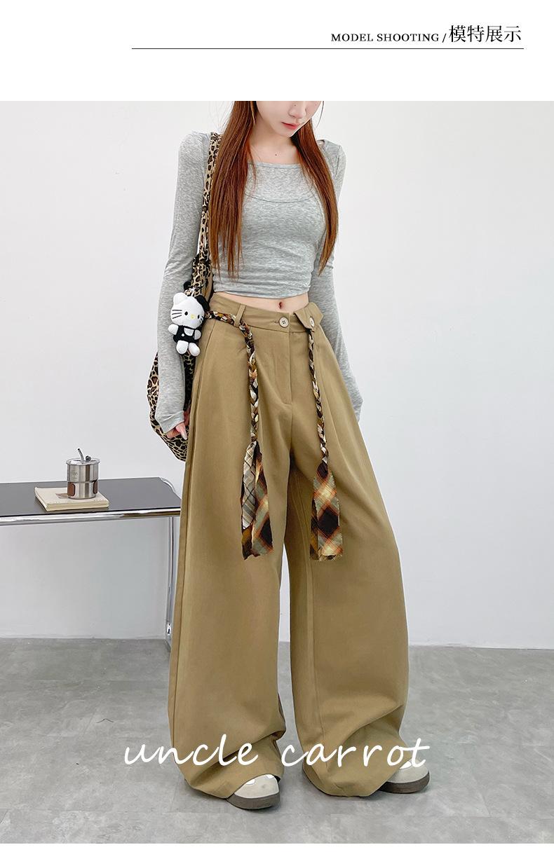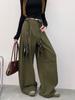 Pantalones de trabajo americanos de algodón lavado para mujer 2025 otoño nuevo diseño de cintura alta sentido de atar retro drapeado pantalones de pierna ancha