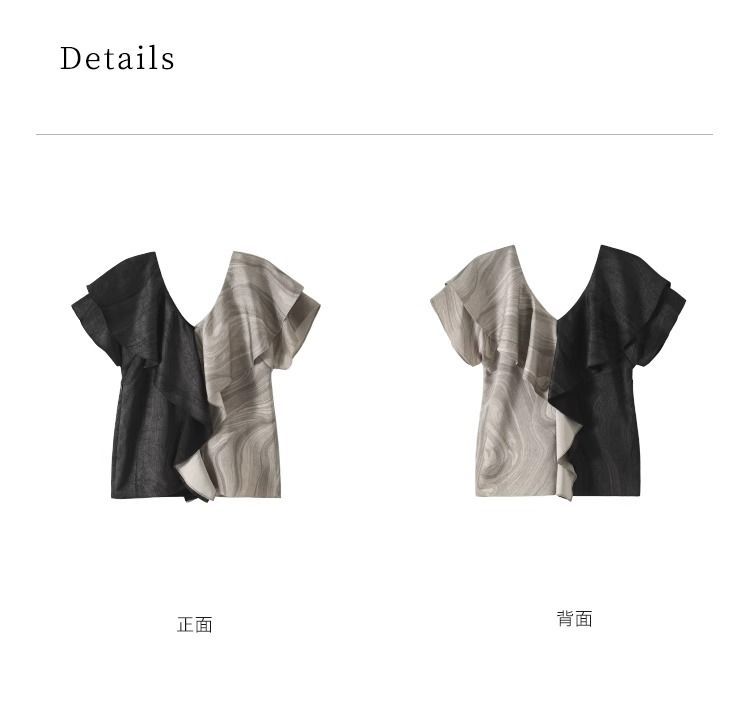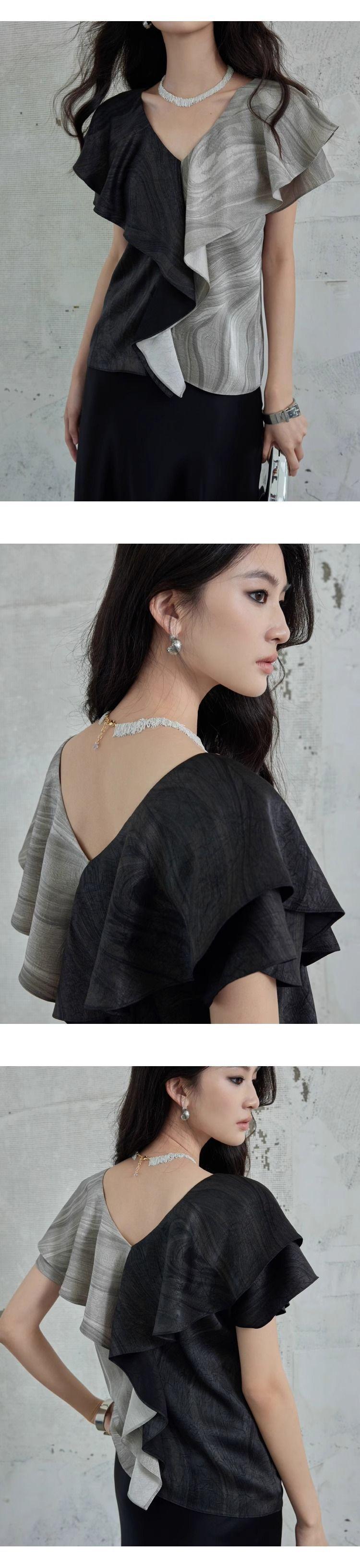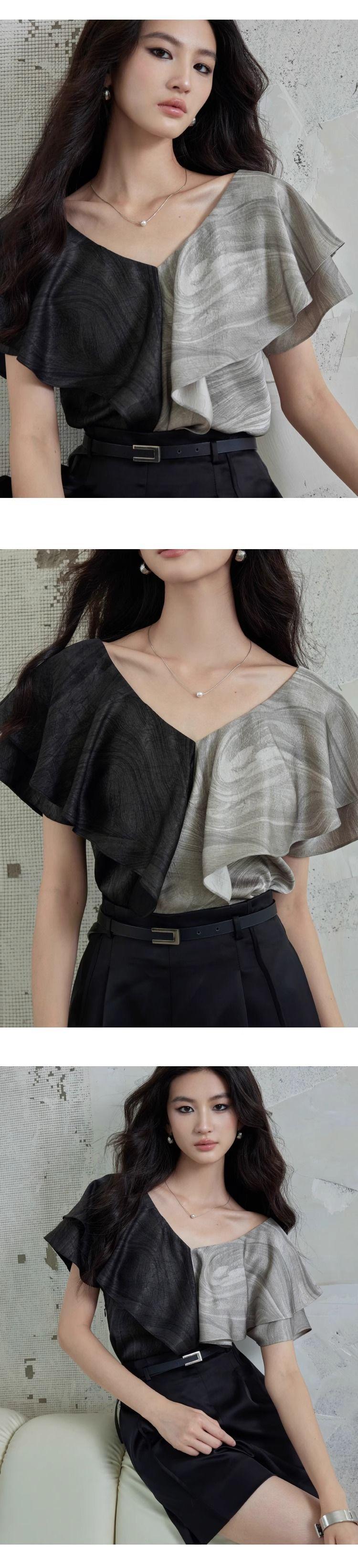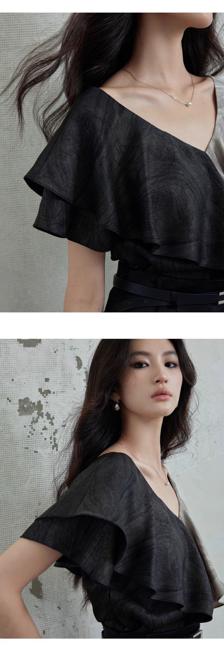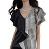 Elegante Top Negro y Gris con Volantes de Manga Corta Estilo Francés Nuevo Cuello en V Doble Delantero y Trasero Estampado Ajustado de Gama Alta