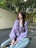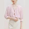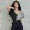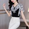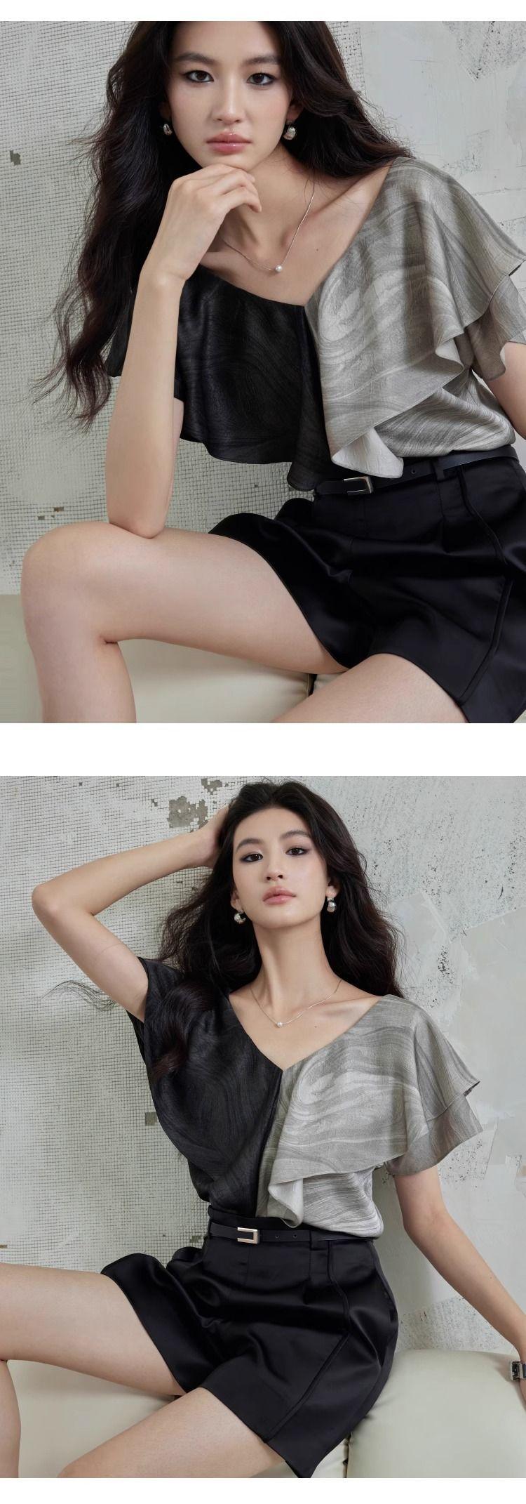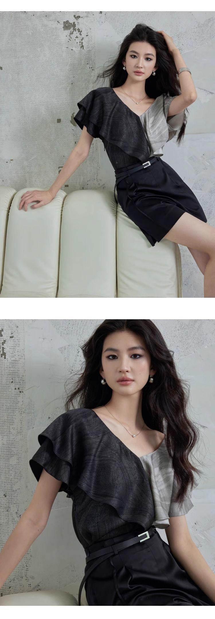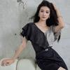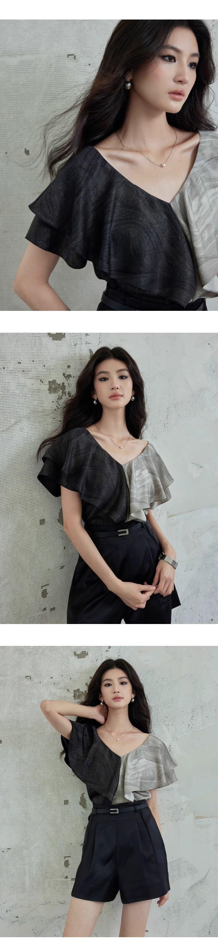 Elegante Top Negro y Gris con Volantes de Manga Corta Estilo Francés Nuevo Cuello en V Doble Delantero y Trasero Estampado Ajustado de Gama Alta