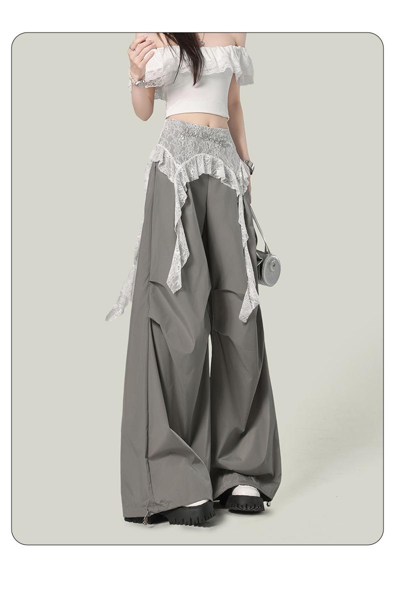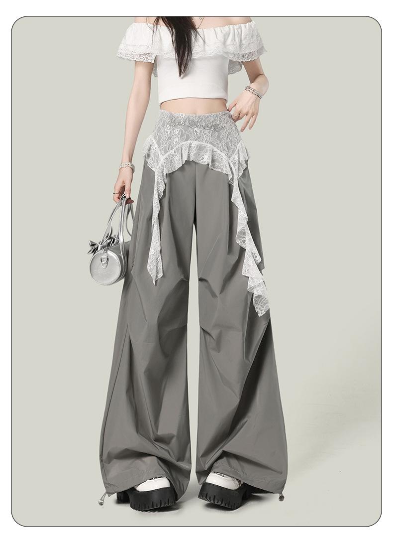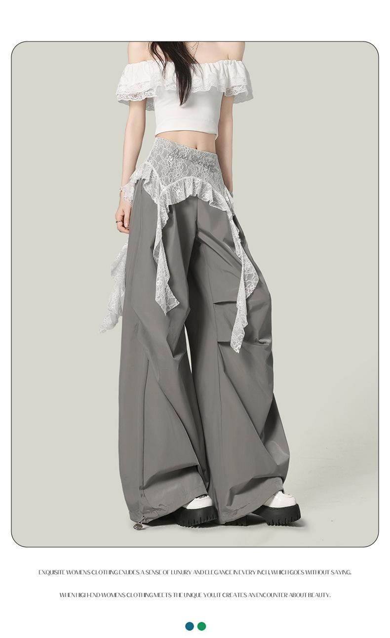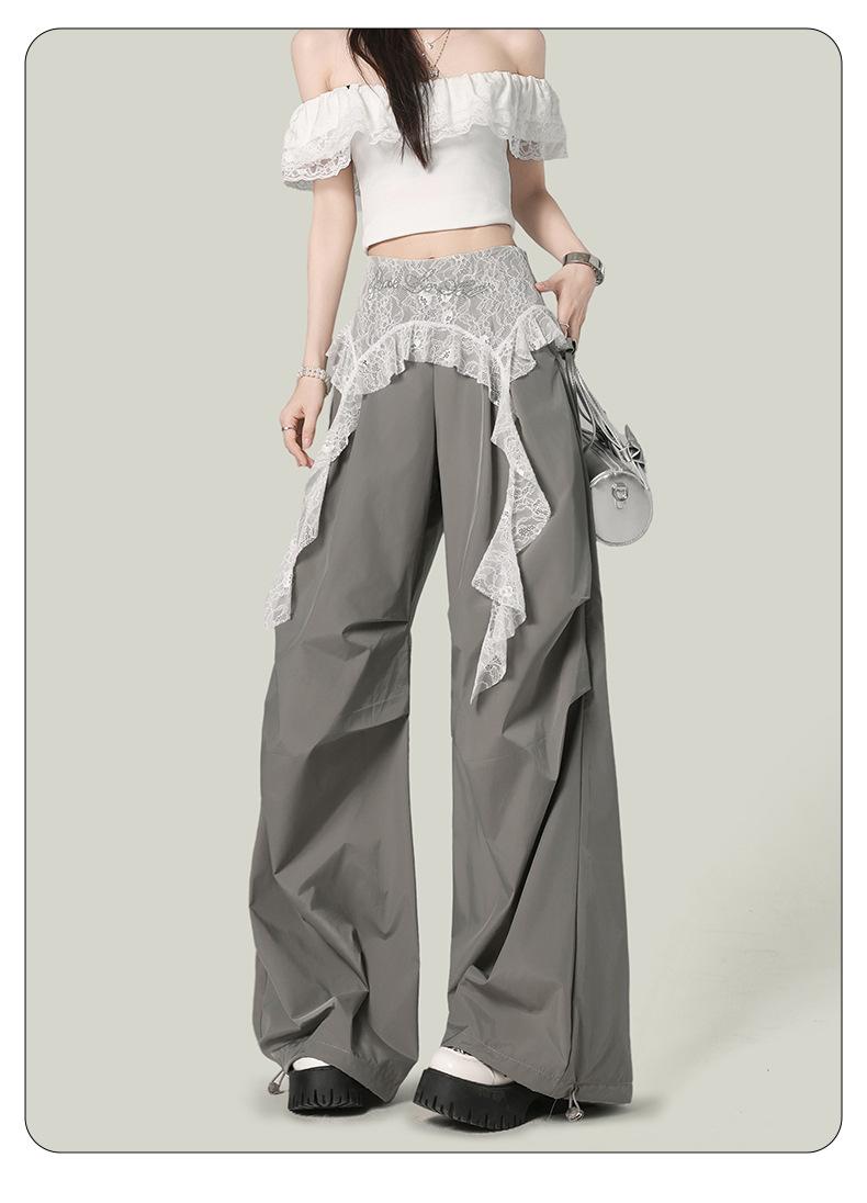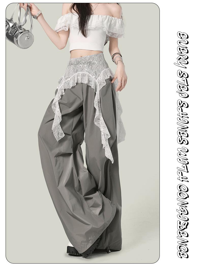 2025 Nuevo Verano Versátil Encaje Patchwork Suelto Casual Falso Dos Piezas Cargo Pierna Ancha Pantalones Largos Tendencia de Mujer