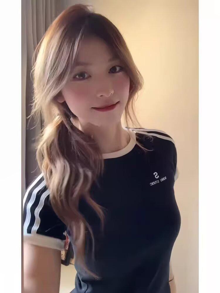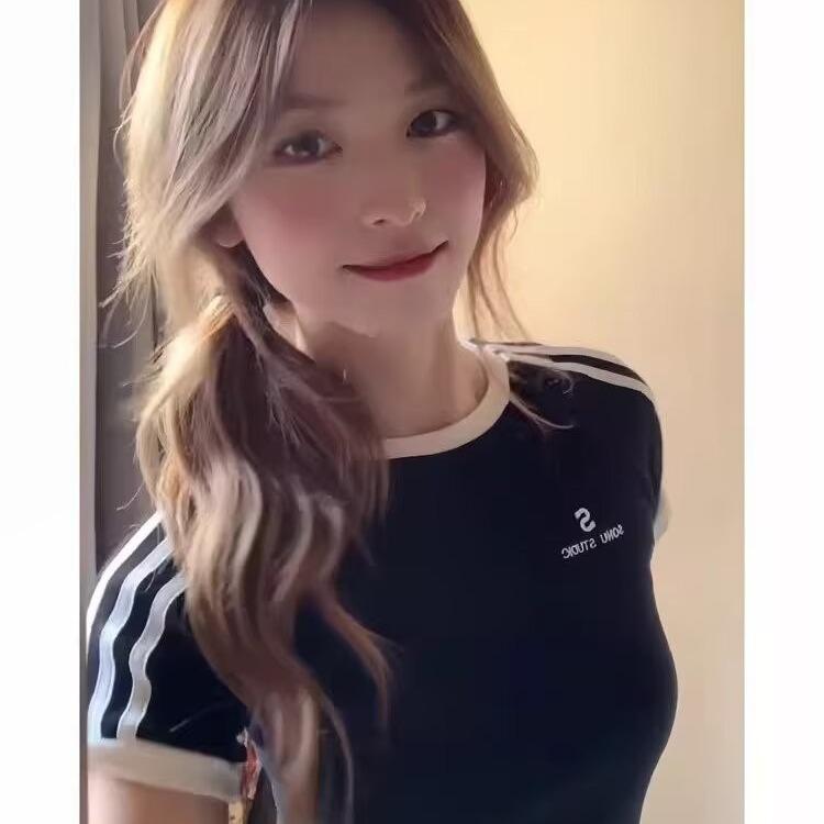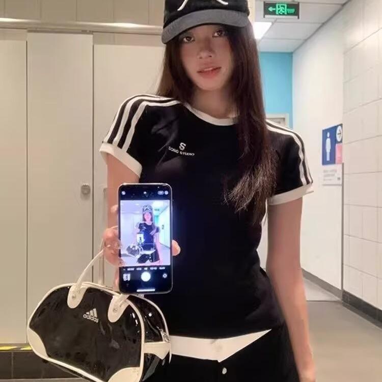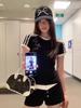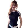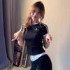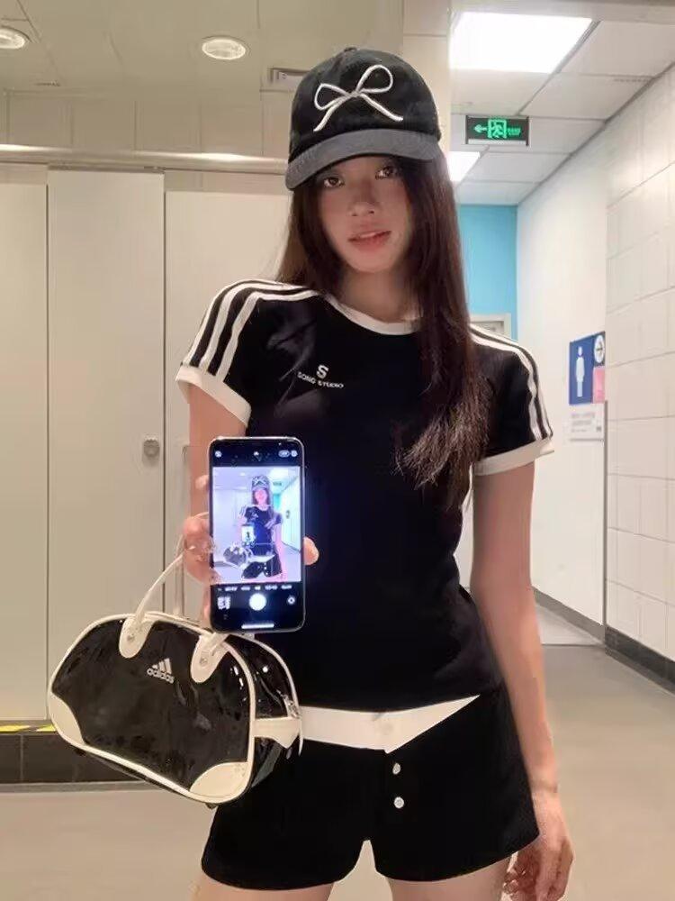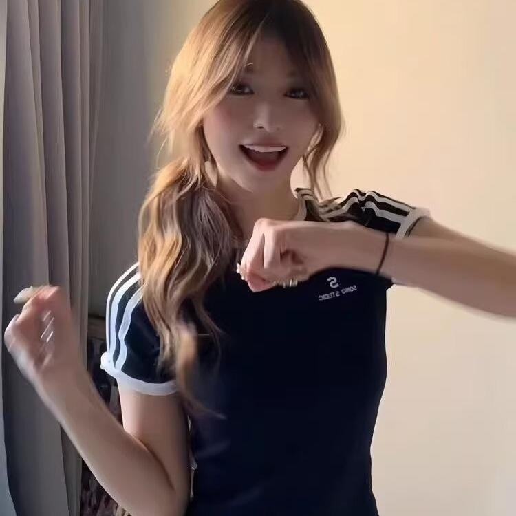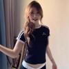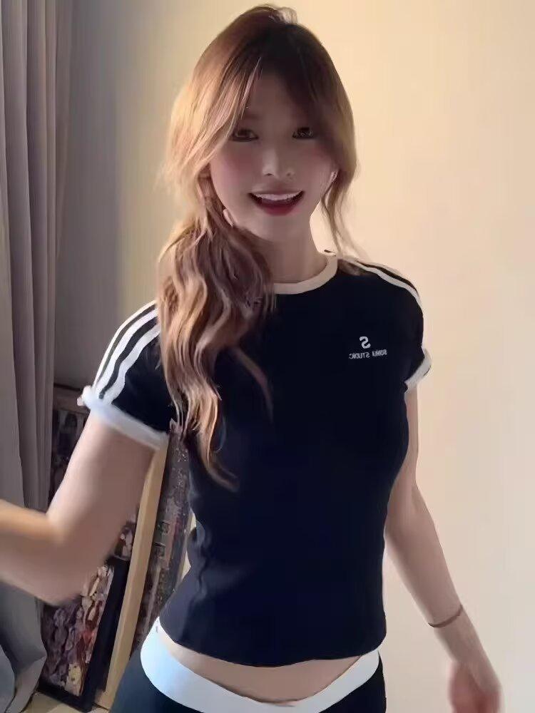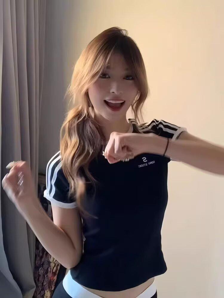 Camiseta de Rayas de Hombro Recto Manga Corta para Mujer Verano Sentido del Diseño Chica Caliente Adelgazante Camiseta Blanca Top Corto Casual Manga Corta