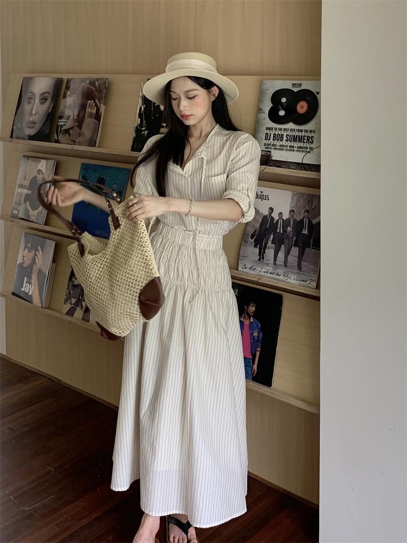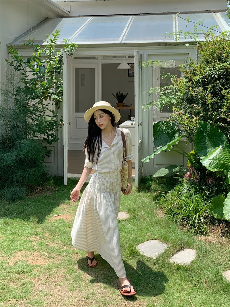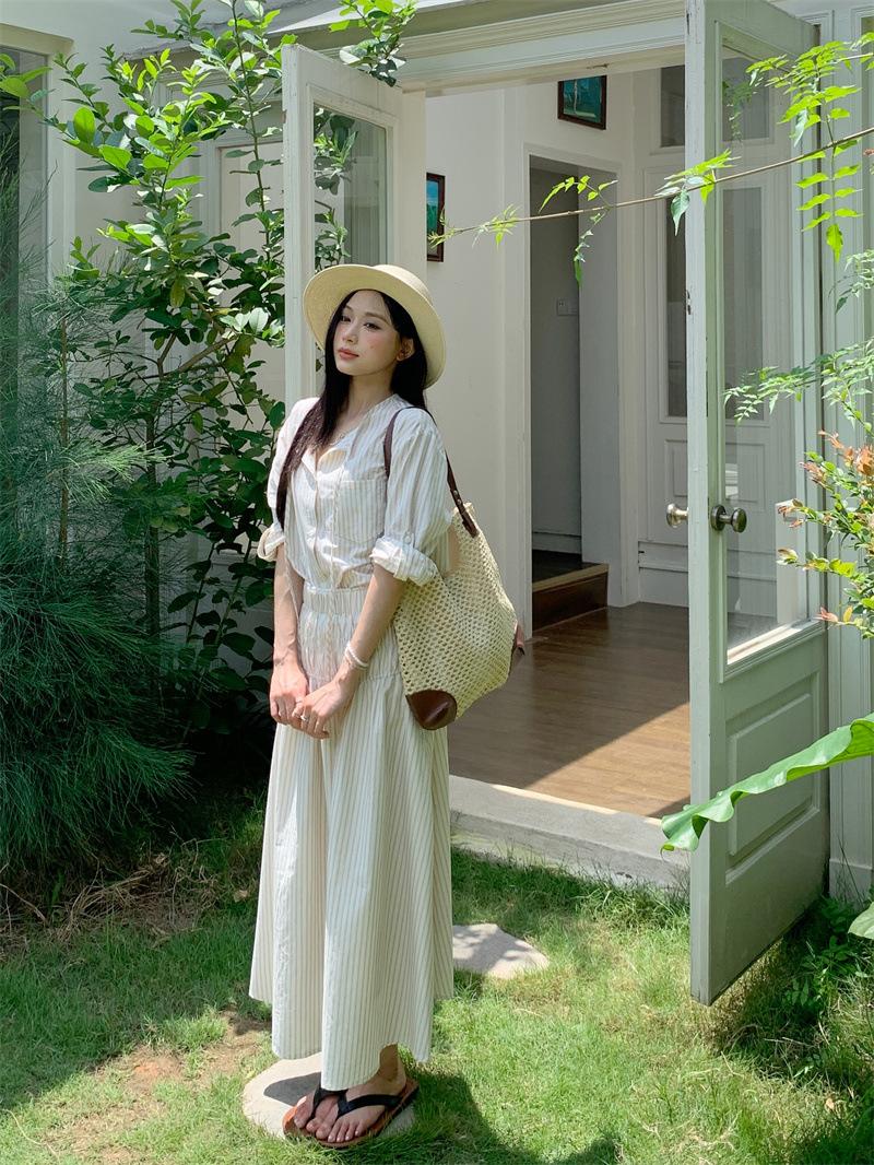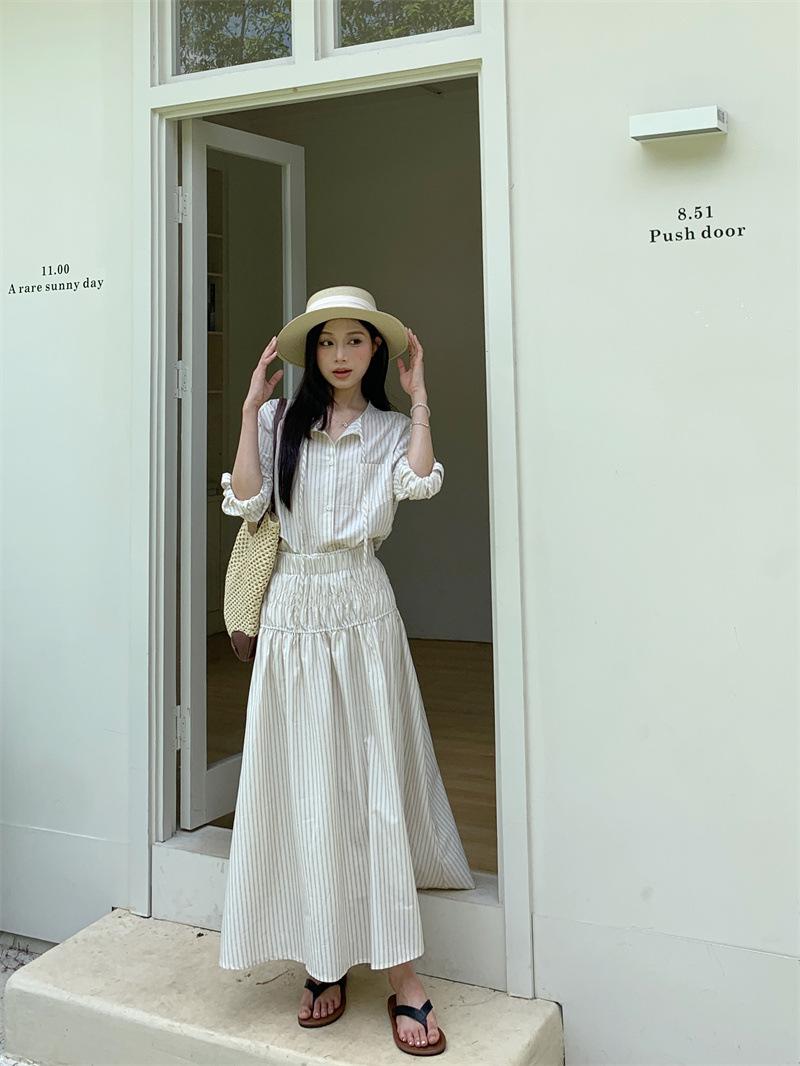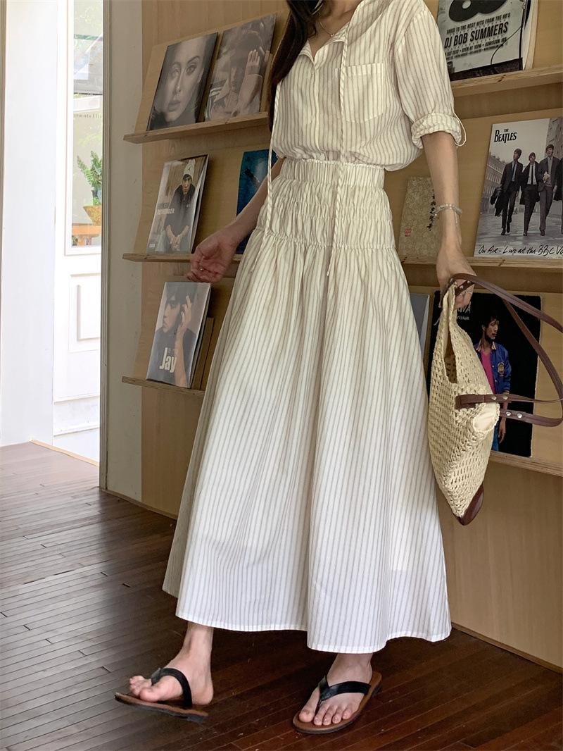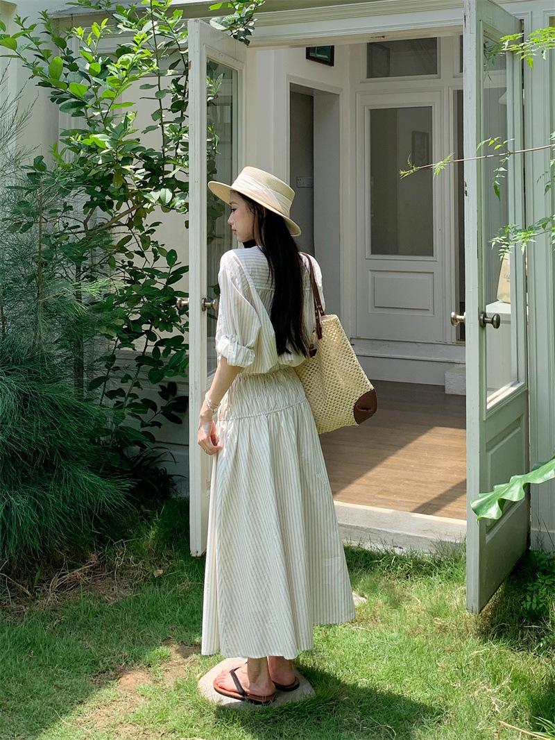 Foto Real de Traje de Verano Nicho Rayado Conjunto Coreano de Dos Piezas, Camisa Elegante Holgada y Floja + Traje de Falda Larga