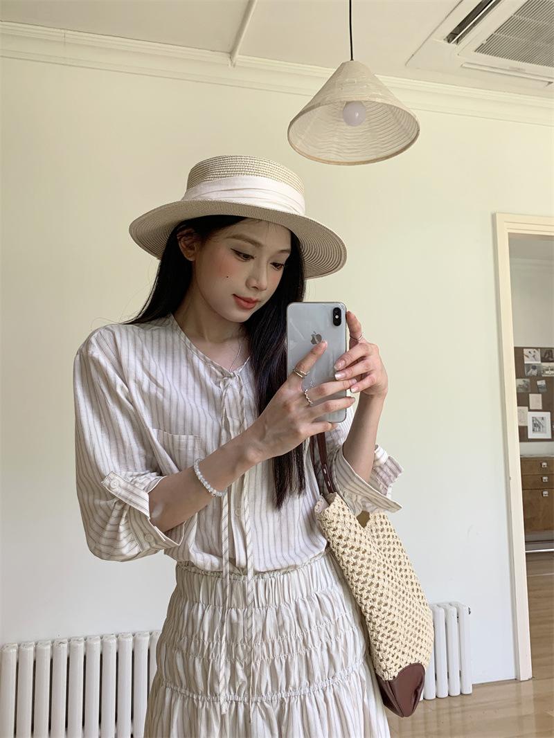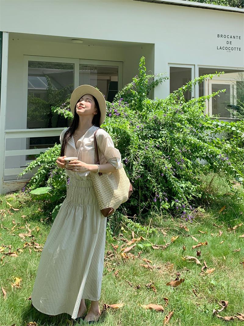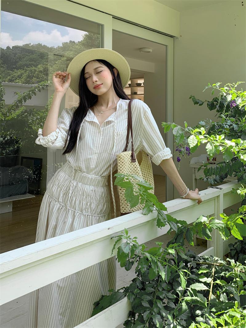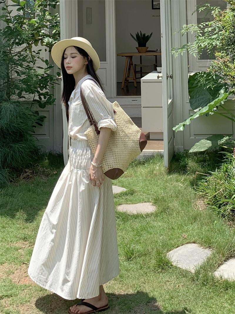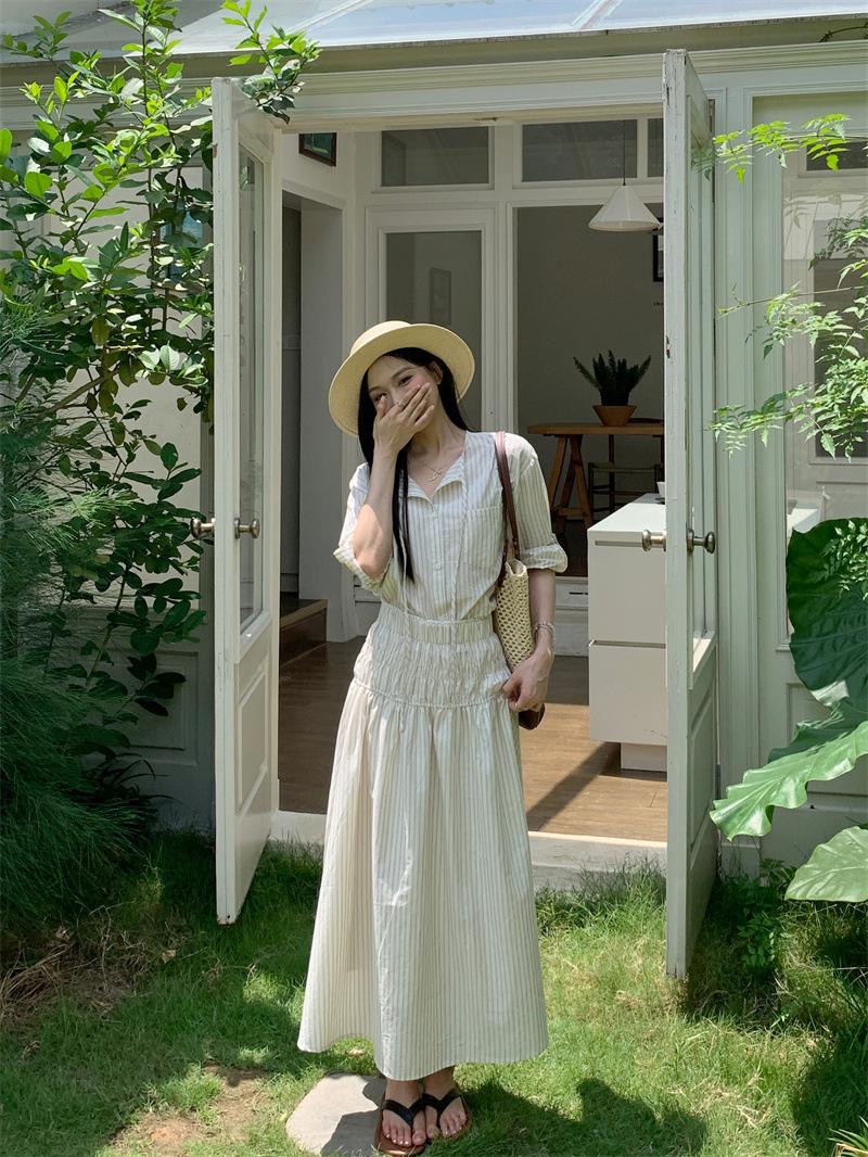 Foto Real de Traje de Verano Nicho Rayado Conjunto Coreano de Dos Piezas, Camisa Elegante Holgada y Floja + Traje de Falda Larga