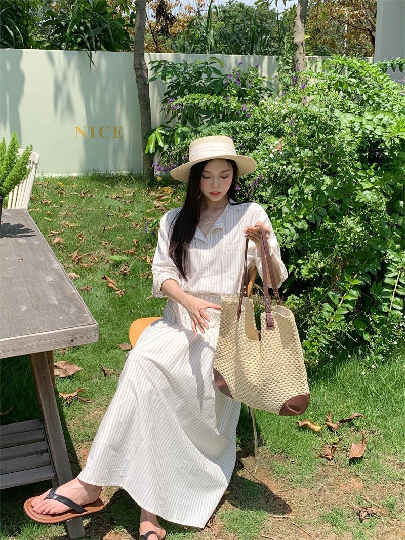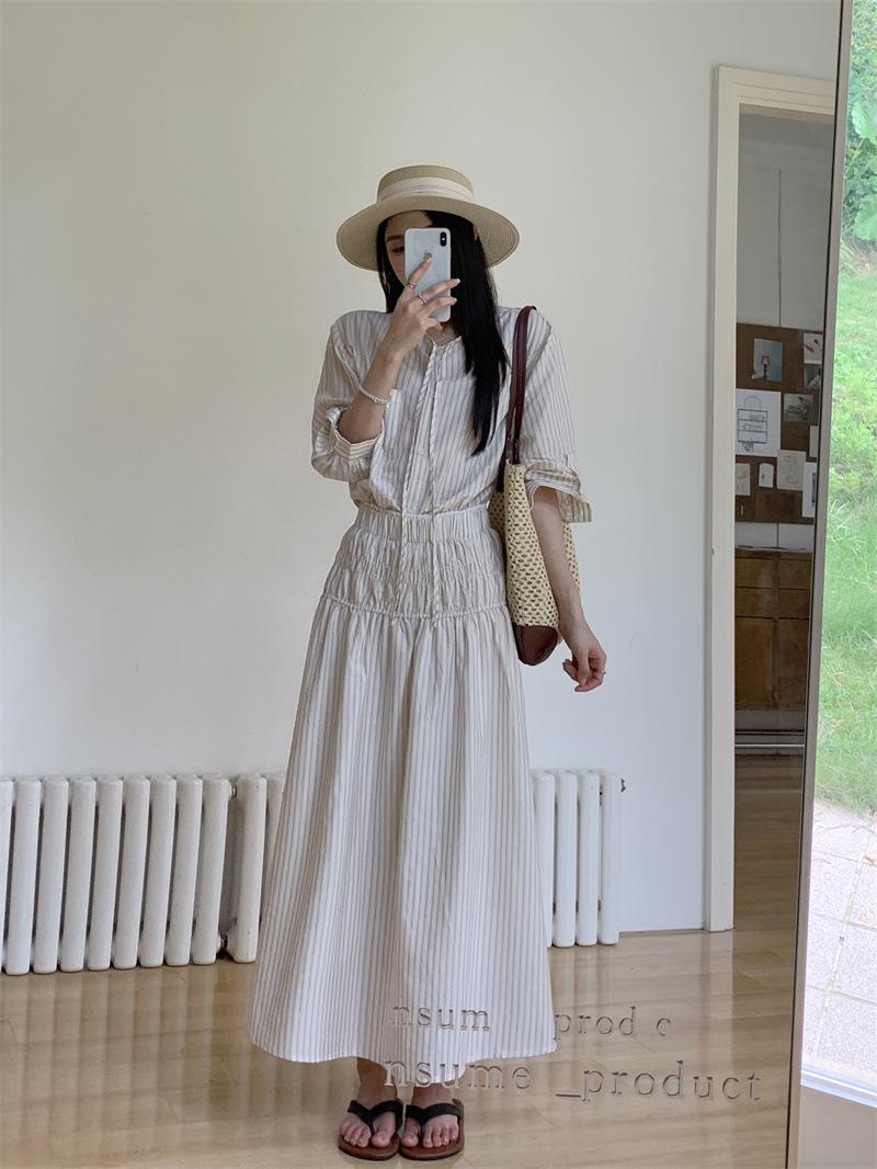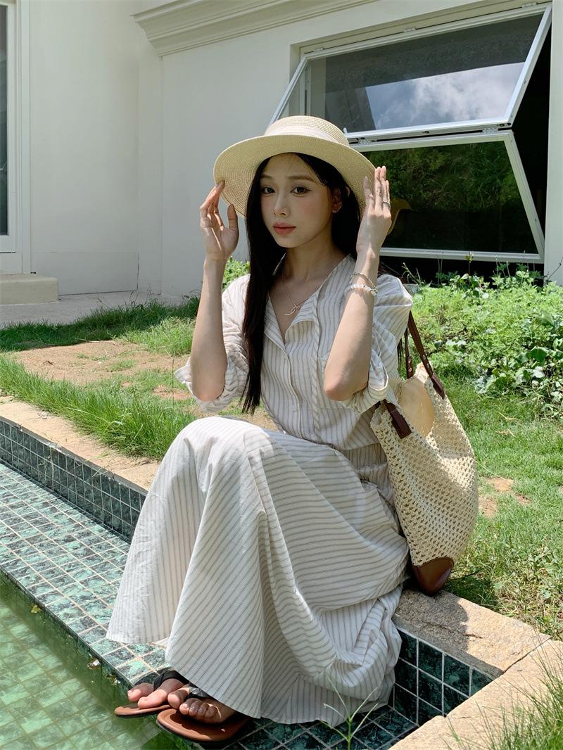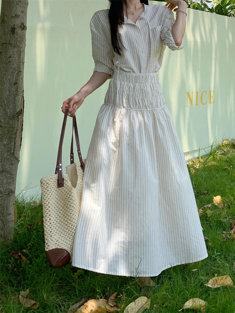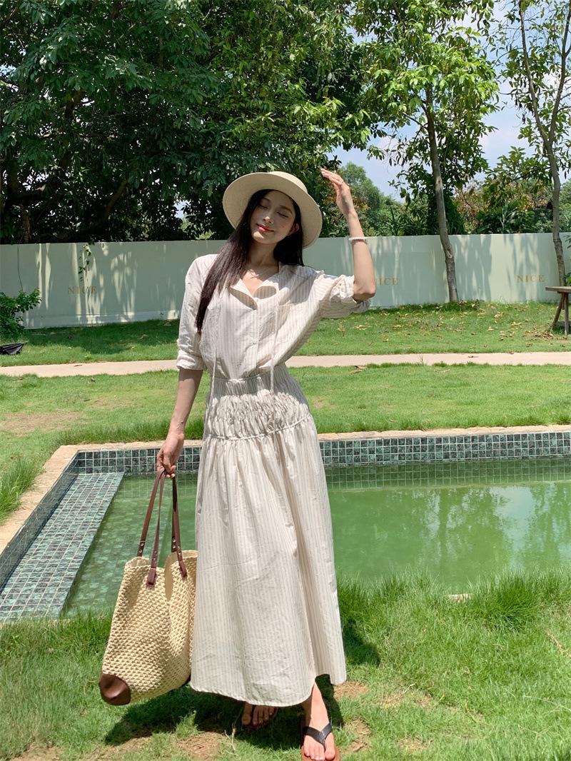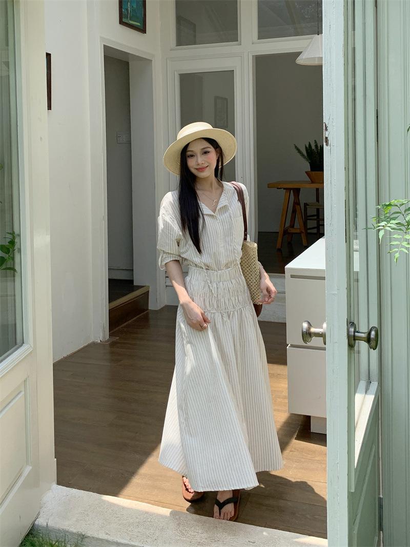Foto Real de Traje de Verano Nicho Rayado Conjunto Coreano de Dos Piezas, Camisa Elegante Holgada y Floja + Traje de Falda Larga