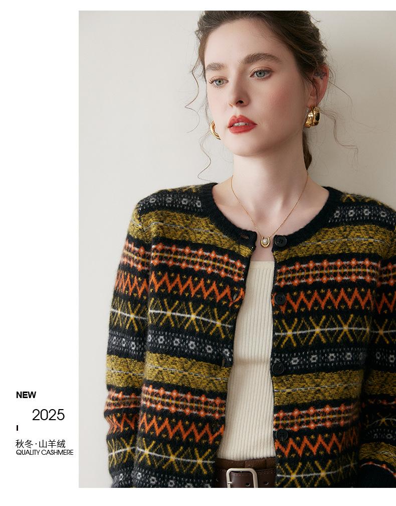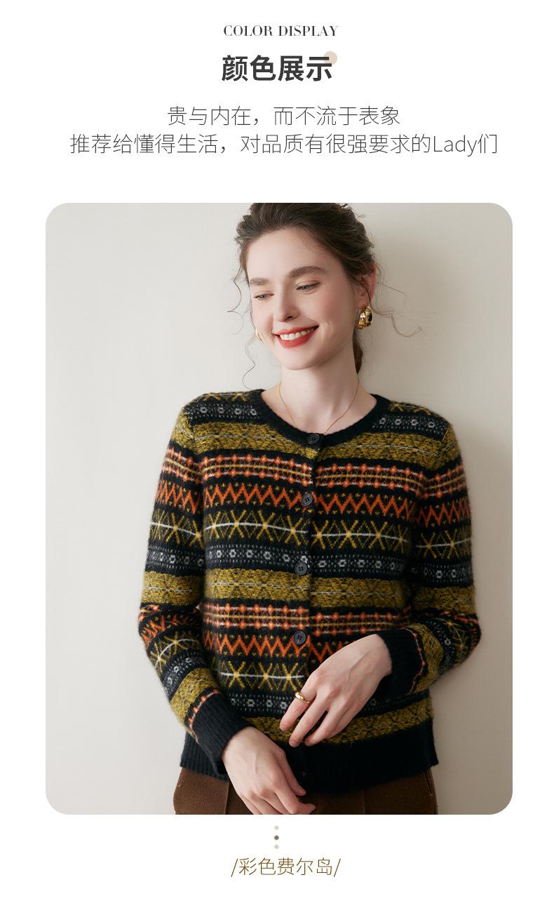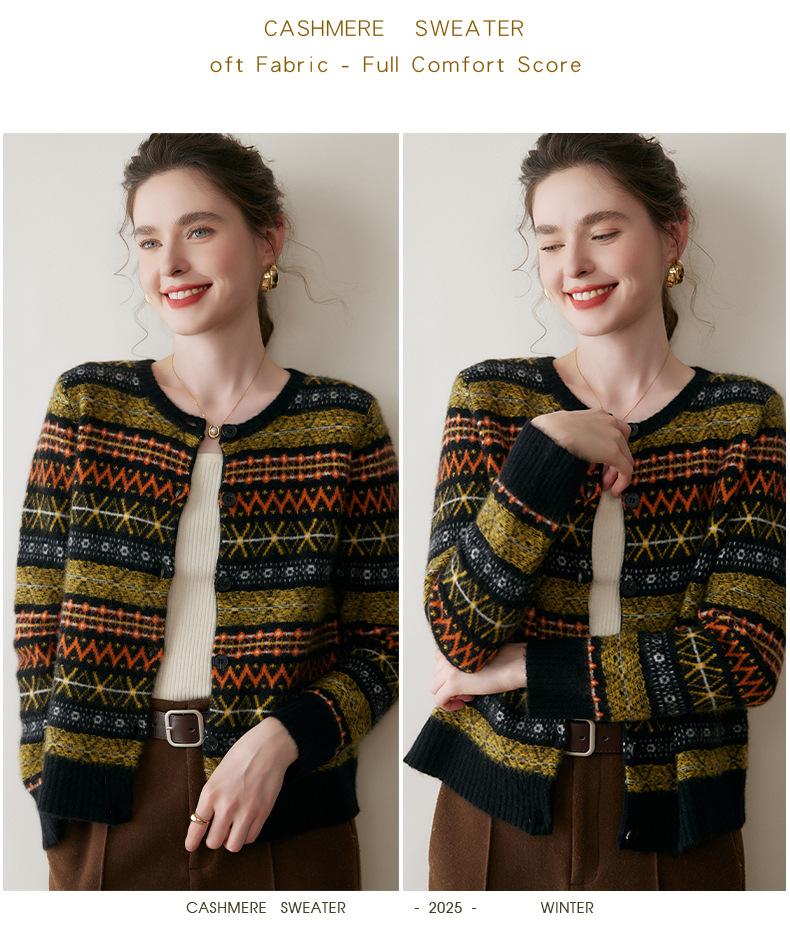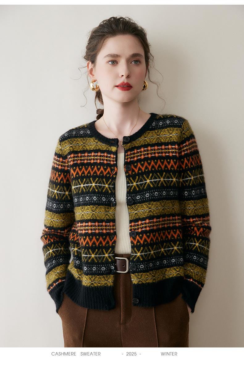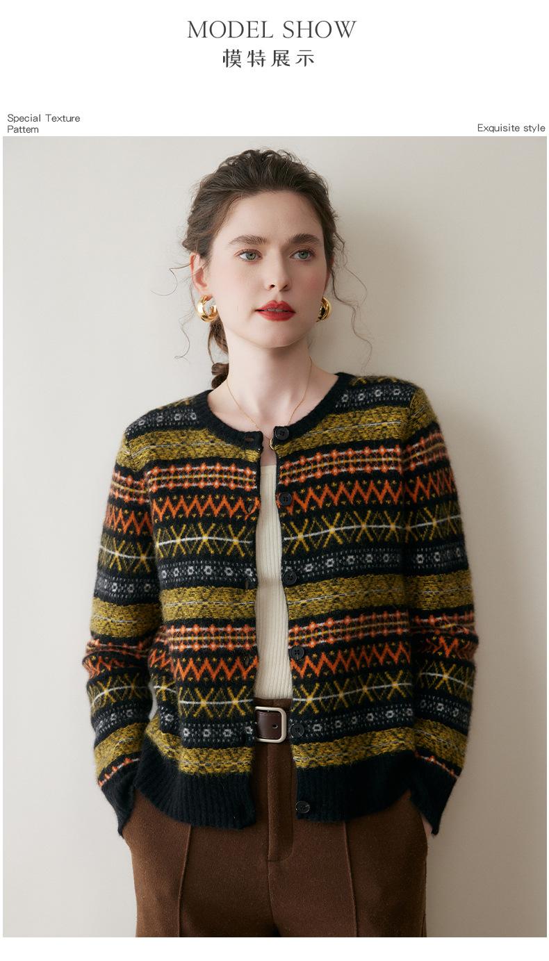 Cárdigan de Cachemira Fair Isle de Bloques de Color con Cuello Redondo para Mujer, Suéter Tejido Casual Retro Nuevo, Suave Suéter Top Ropa Exterior