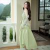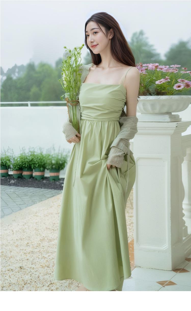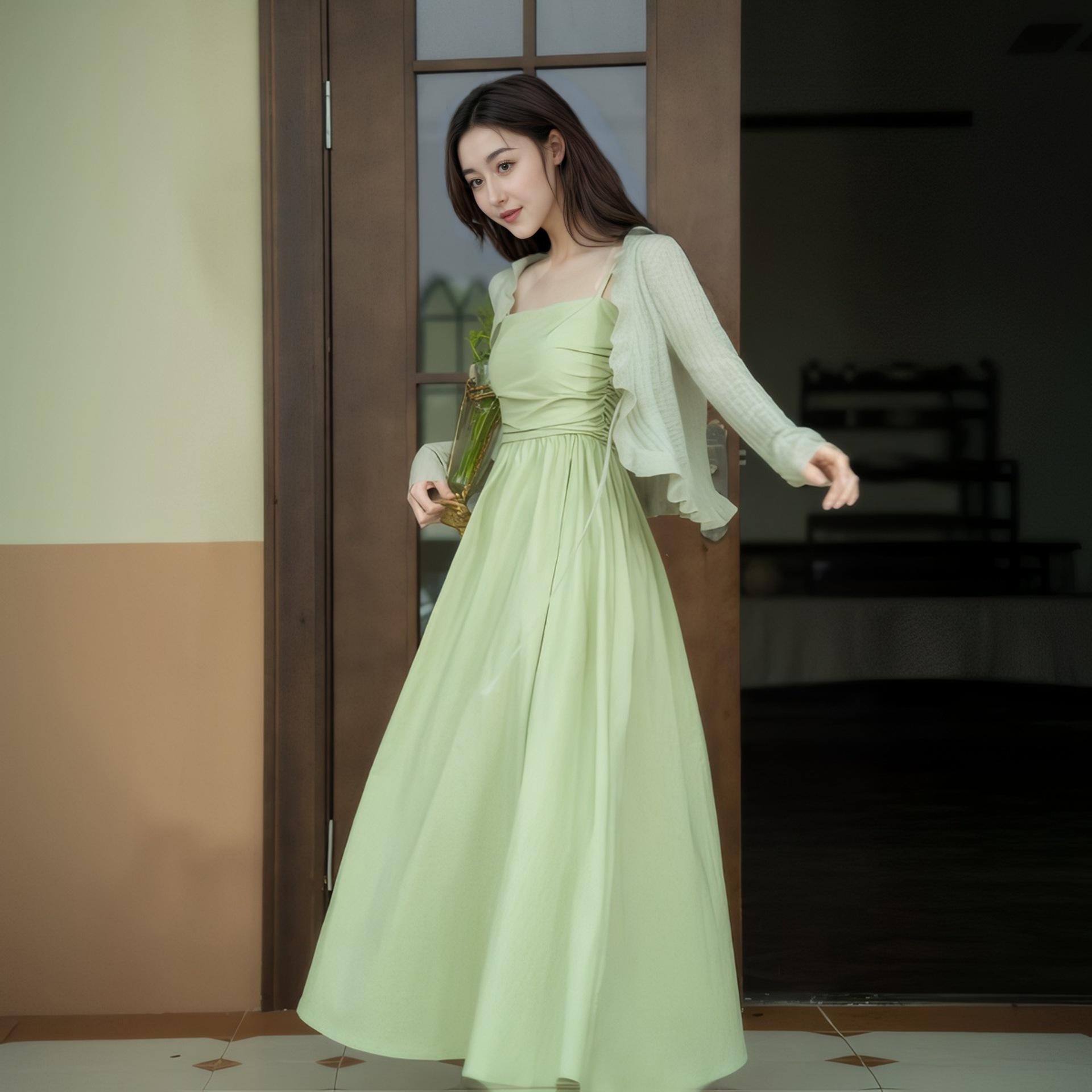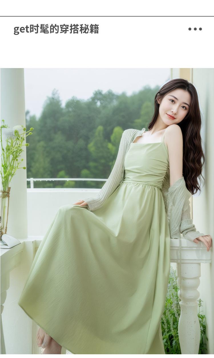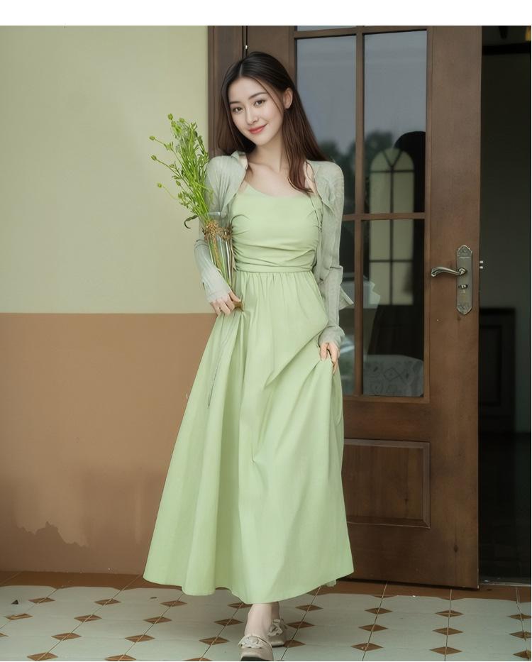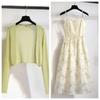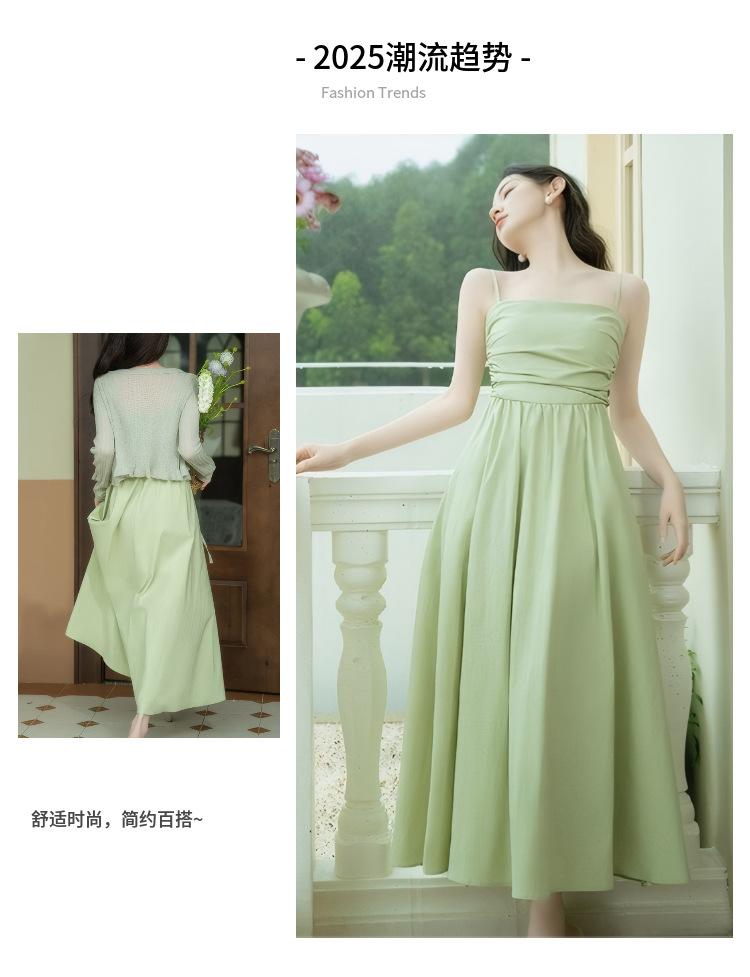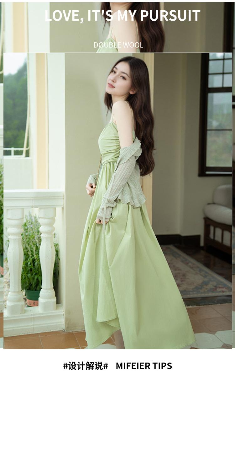 Verano 2025 Nuevo Conjunto de Dos Piezas Estilo Hong Kong Tirantes Cintura Ajustada Adelgazante Verde Falda Amplia Vacacional Más Cárdigan Protector Solar Mujer