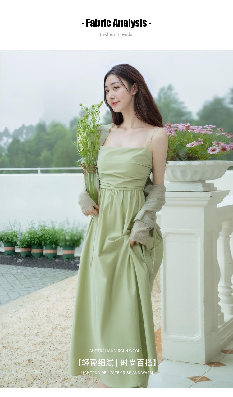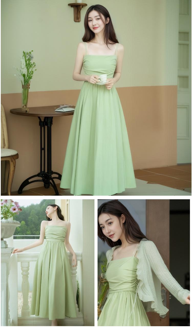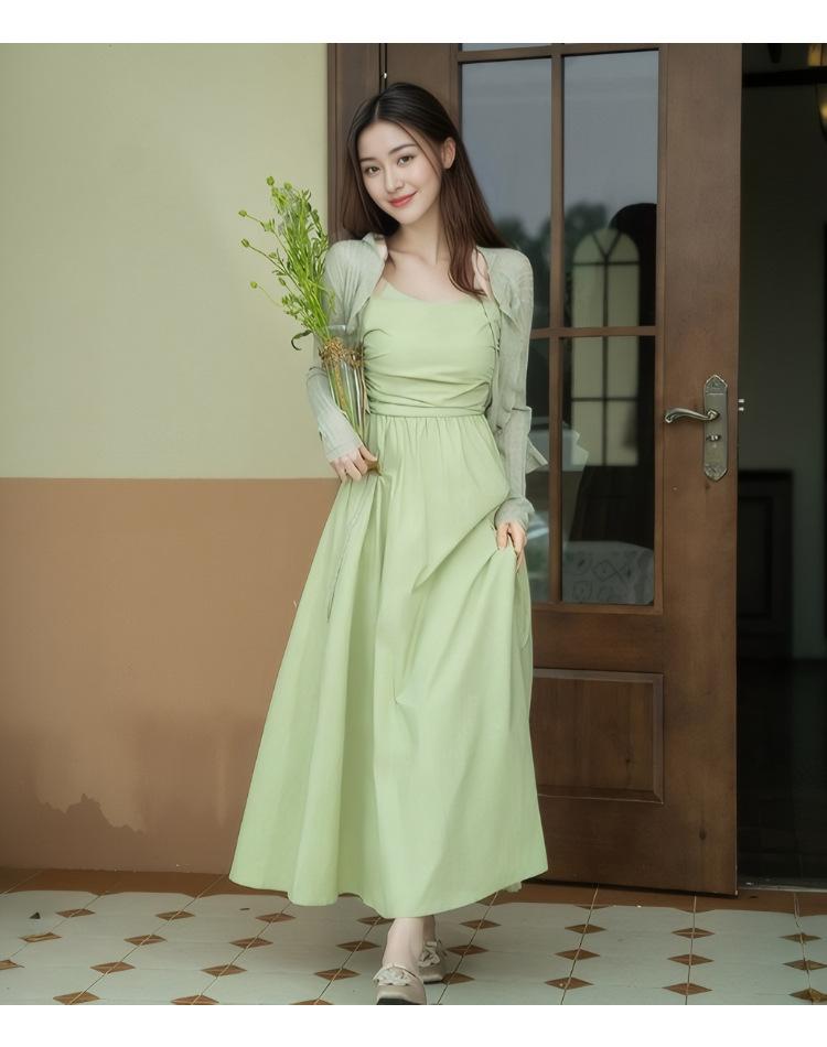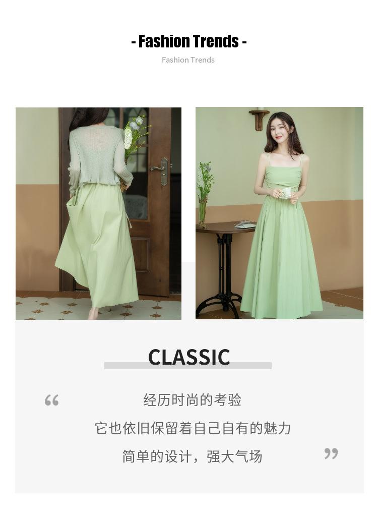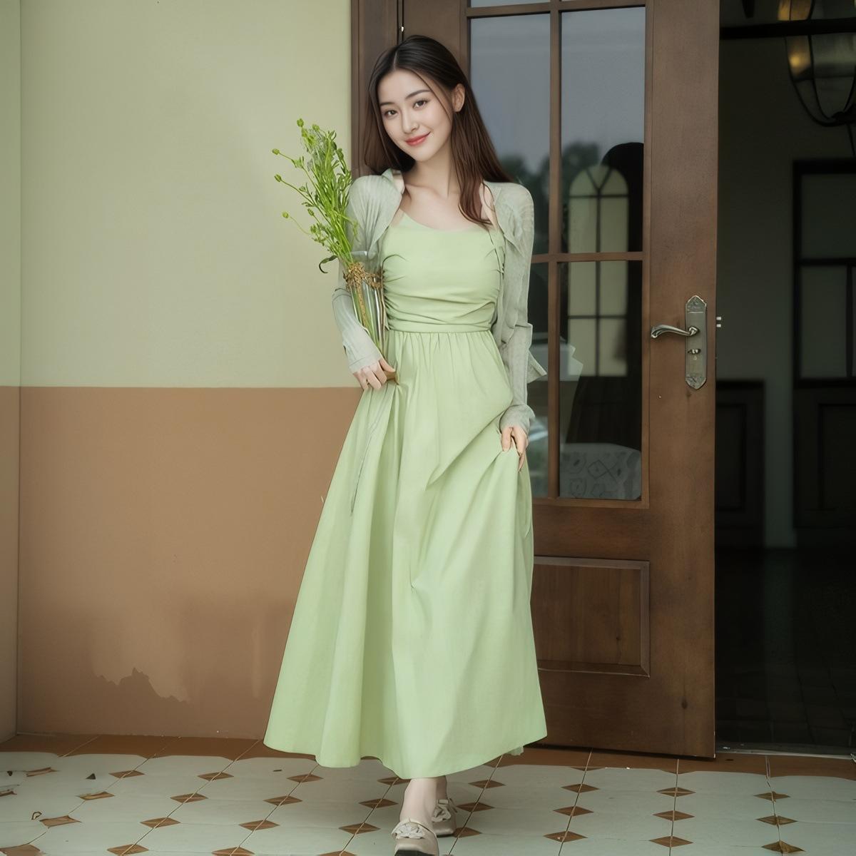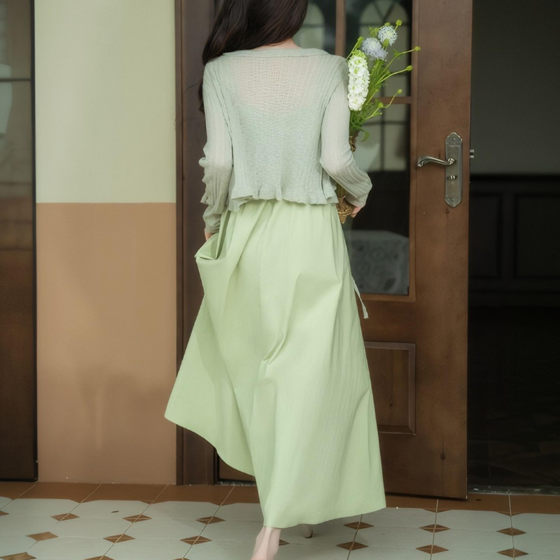 Verano 2025 Nuevo Conjunto de Dos Piezas Estilo Hong Kong Tirantes Cintura Ajustada Adelgazante Verde Falda Amplia Vacacional Más Cárdigan Protector Solar Mujer