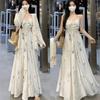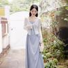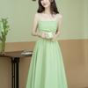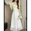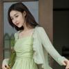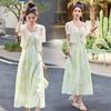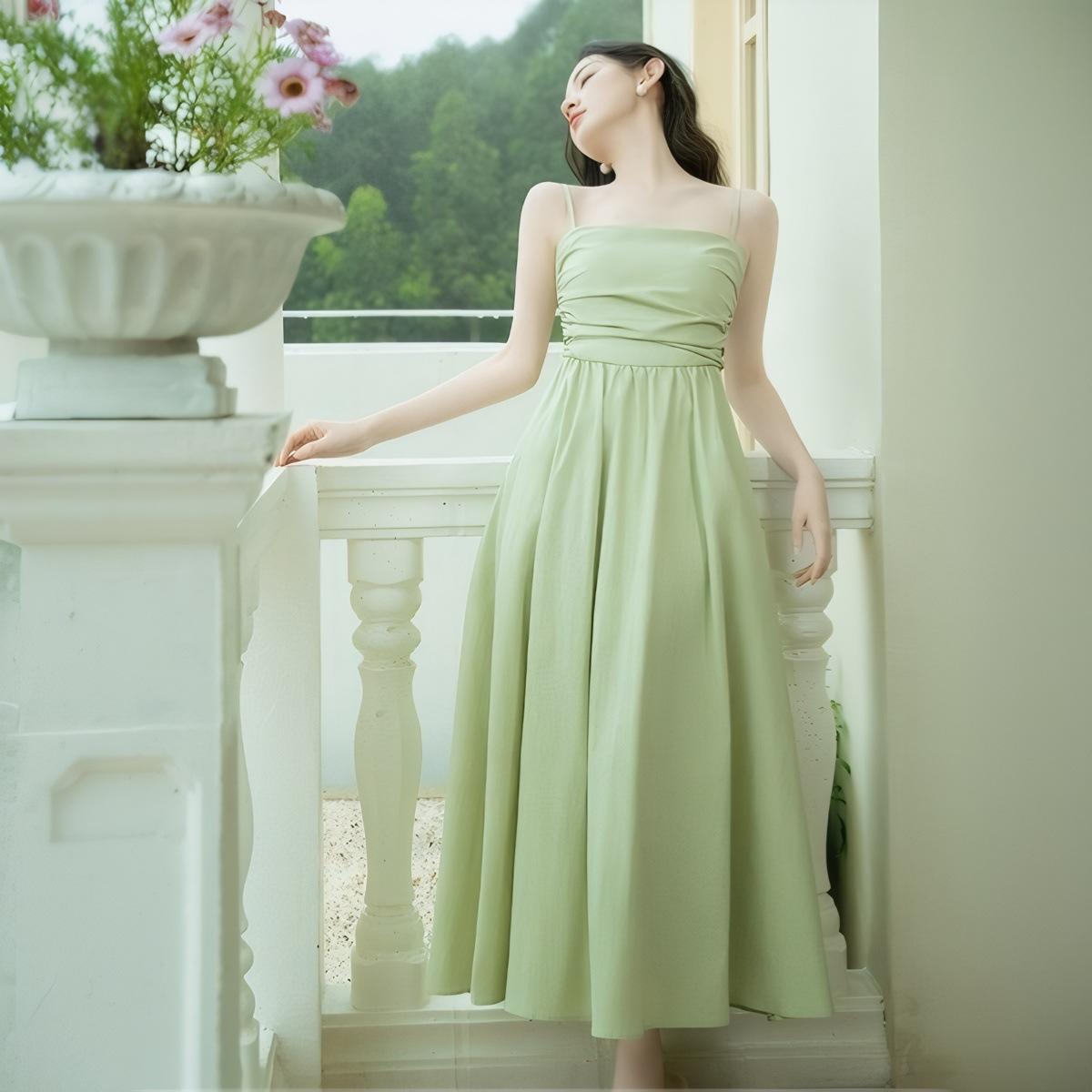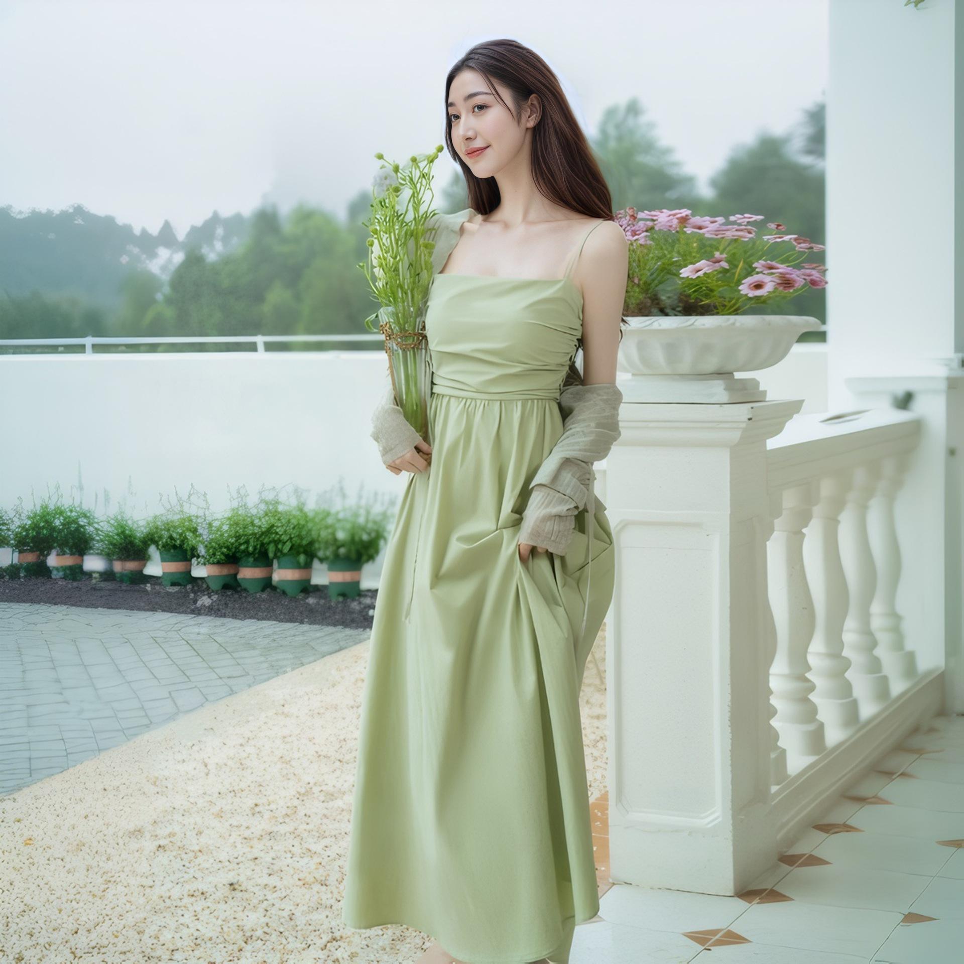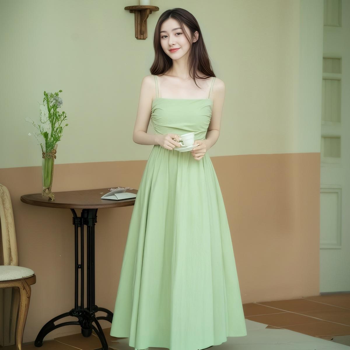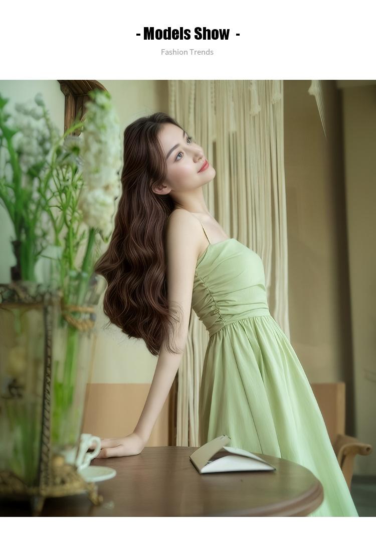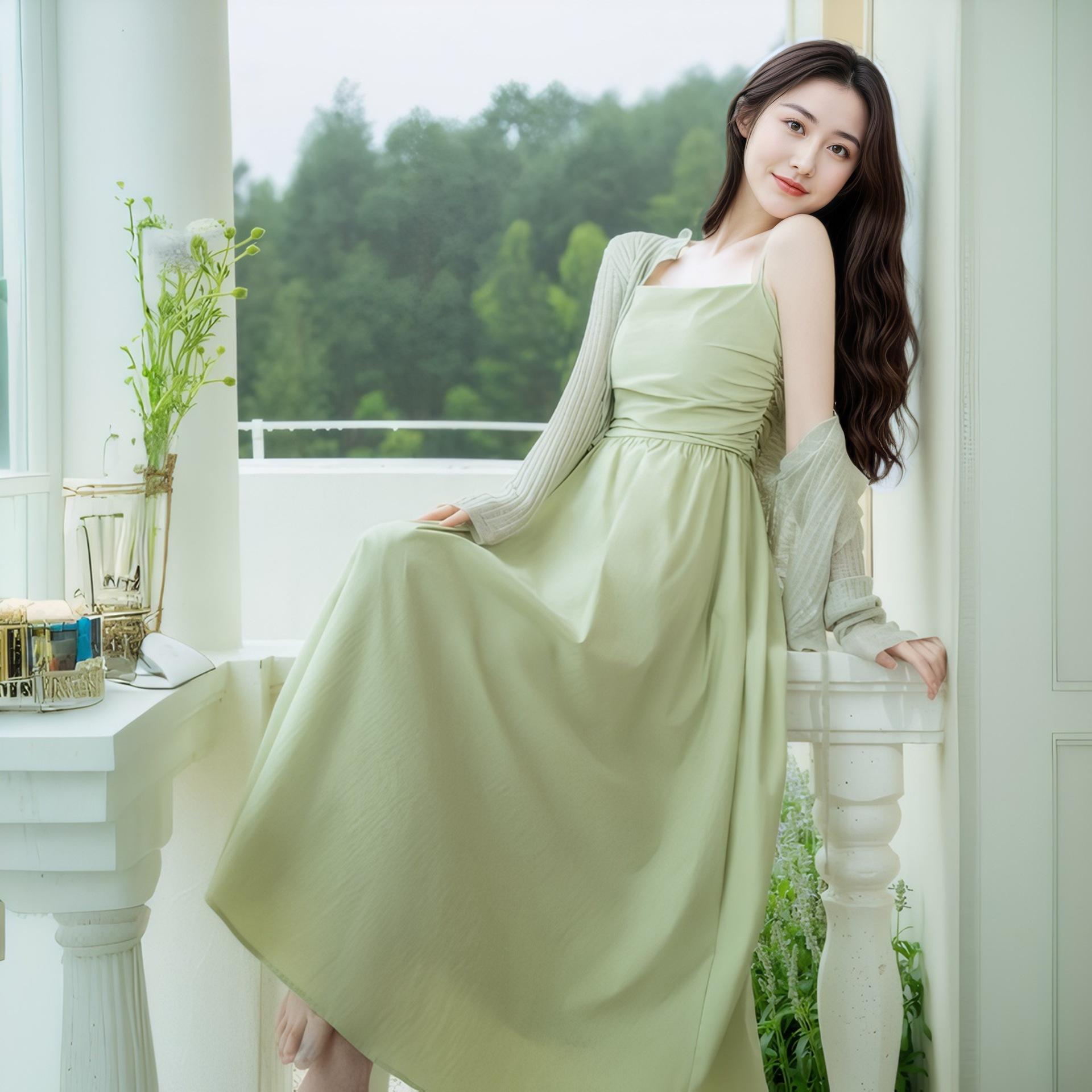 Verano 2025 Nuevo Conjunto de Dos Piezas Estilo Hong Kong Tirantes Cintura Ajustada Adelgazante Verde Falda Amplia Vacacional Más Cárdigan Protector Solar Mujer