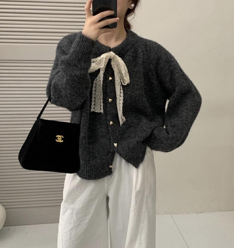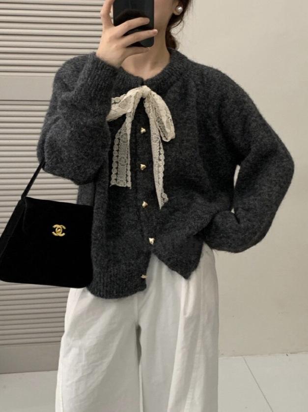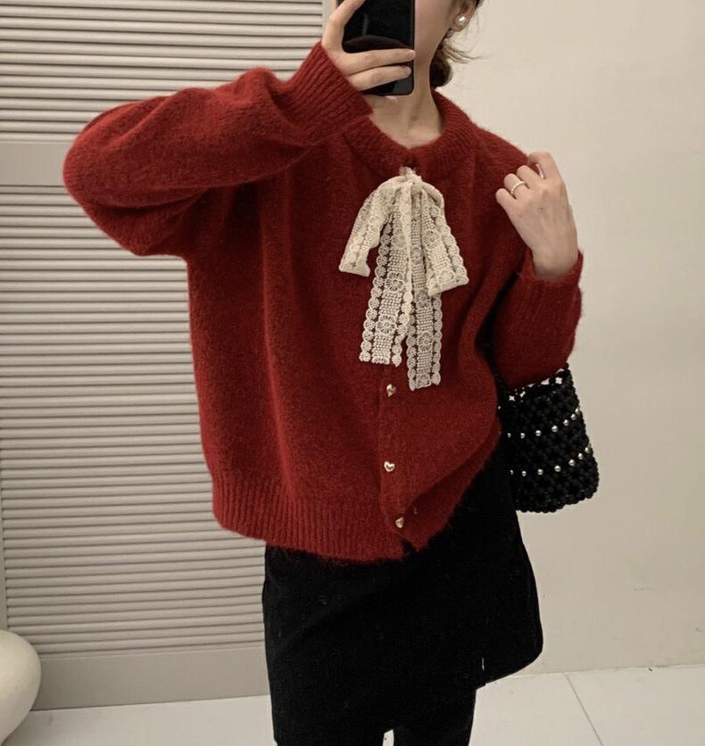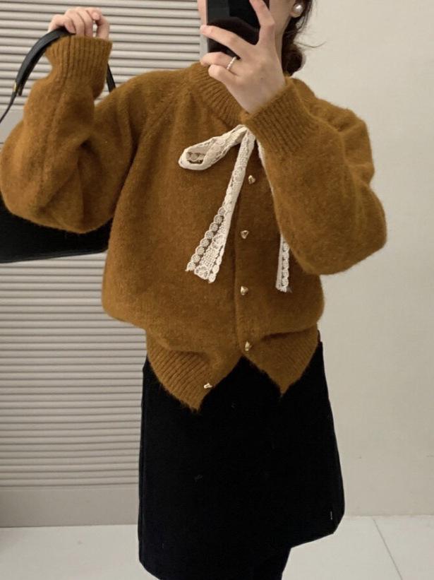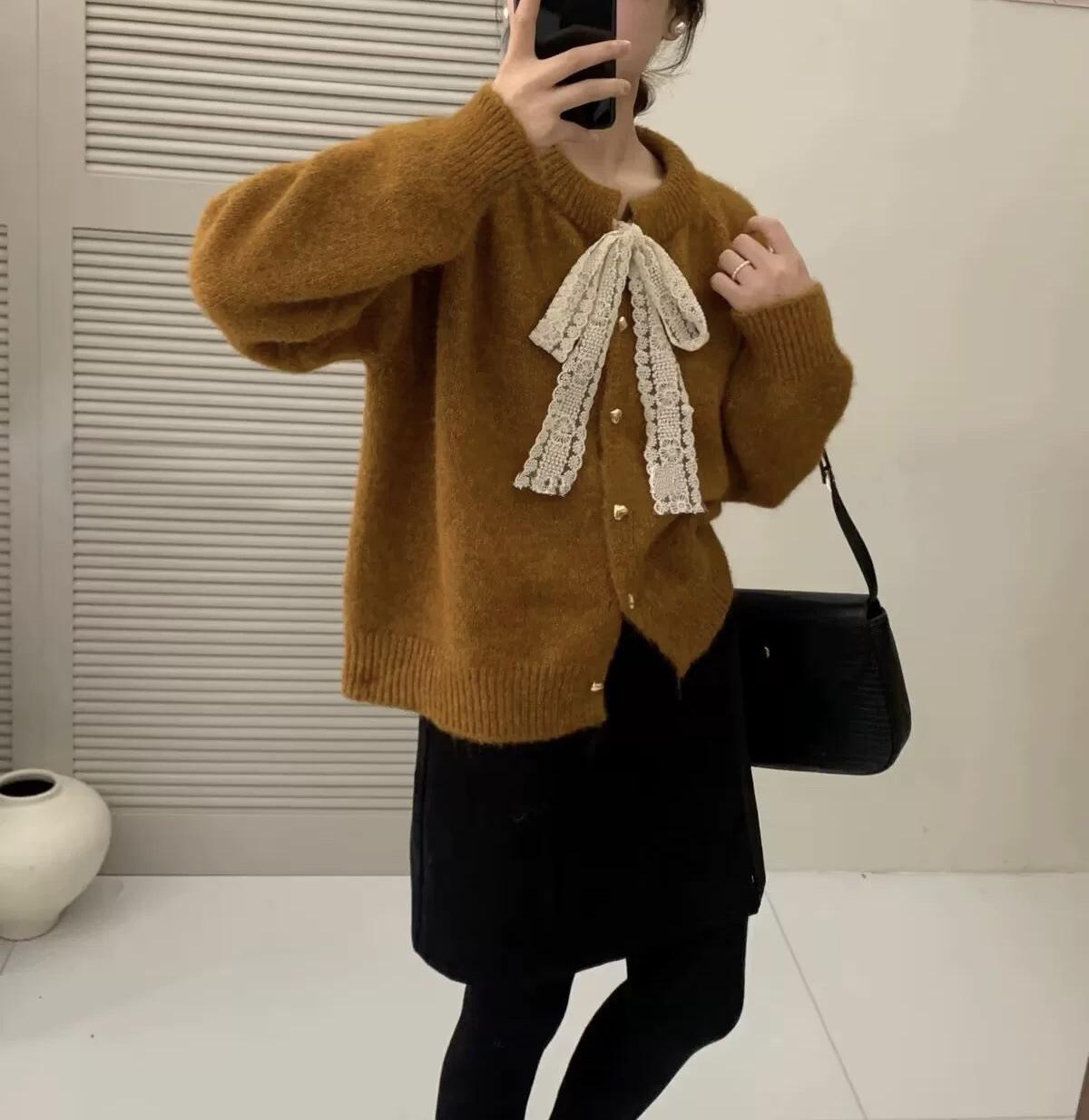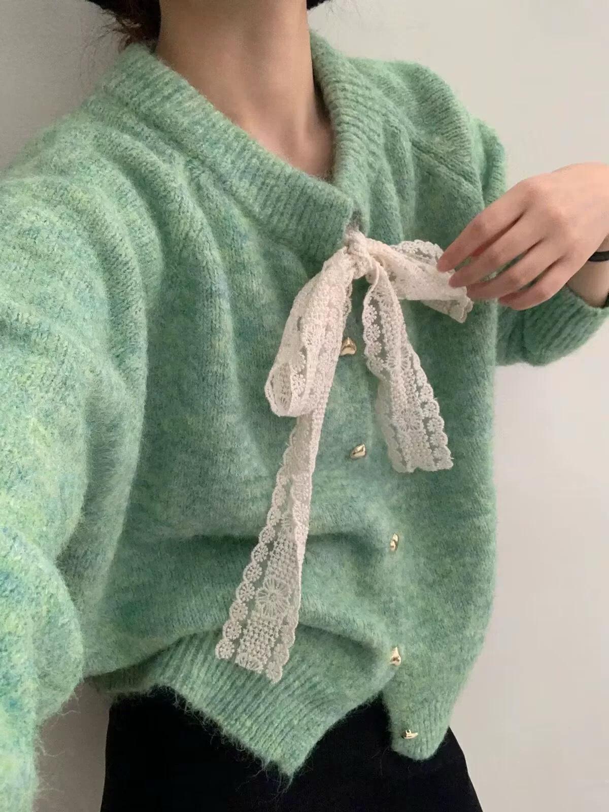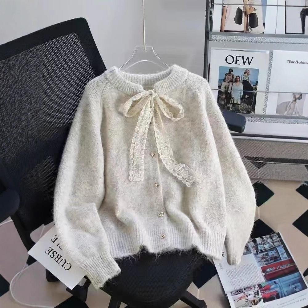 Suéter de Estilo Dulce Coreano Otoño Invierno Mujer Diseño Holgado Sentido Encaje Lazo Cuello Redondo Cárdigan Tejido Abrigo Top