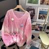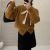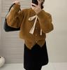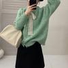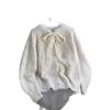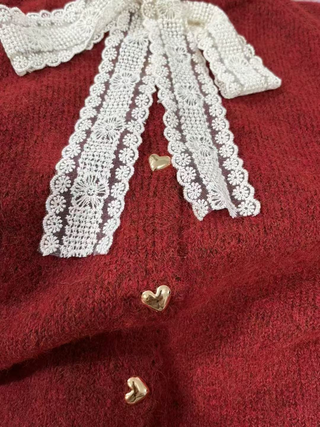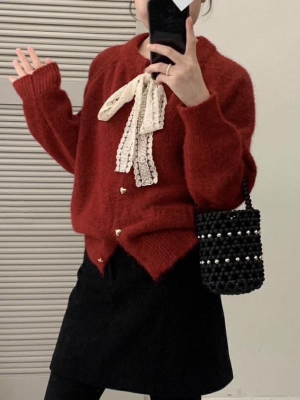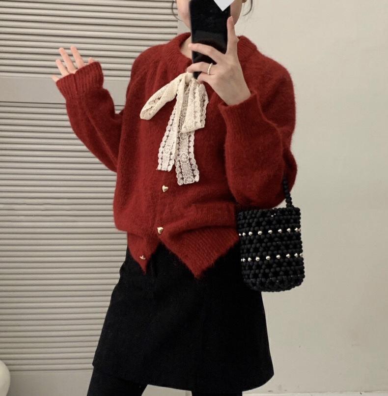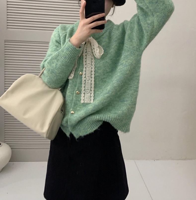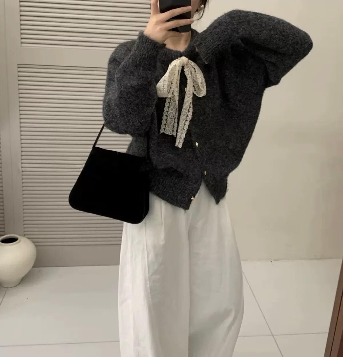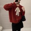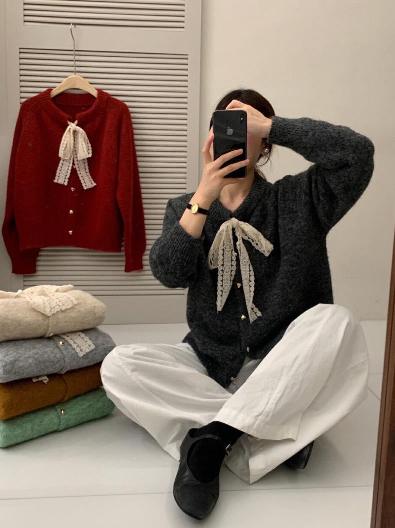 Suéter de Estilo Dulce Coreano Otoño Invierno Mujer Diseño Holgado Sentido Encaje Lazo Cuello Redondo Cárdigan Tejido Abrigo Top