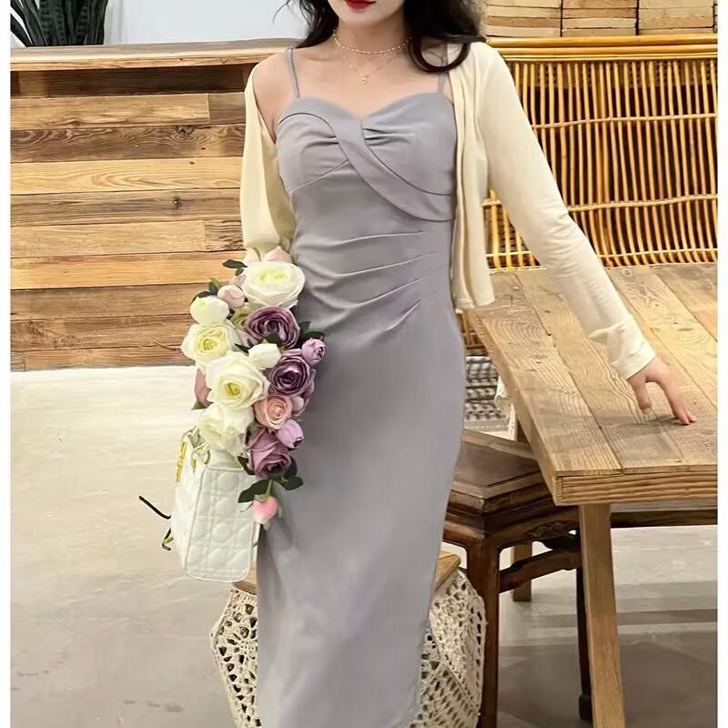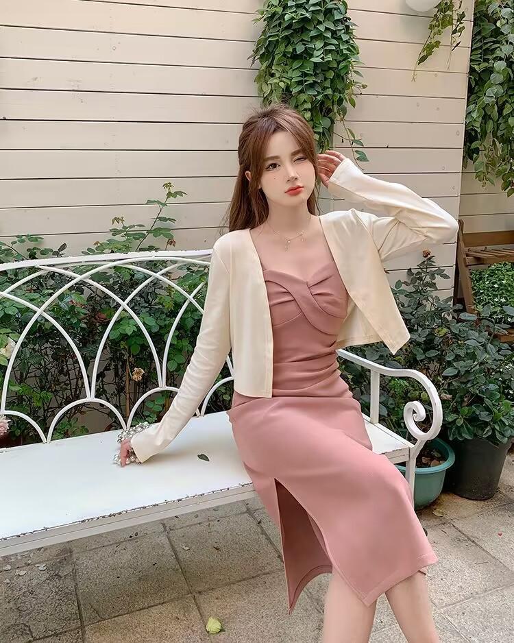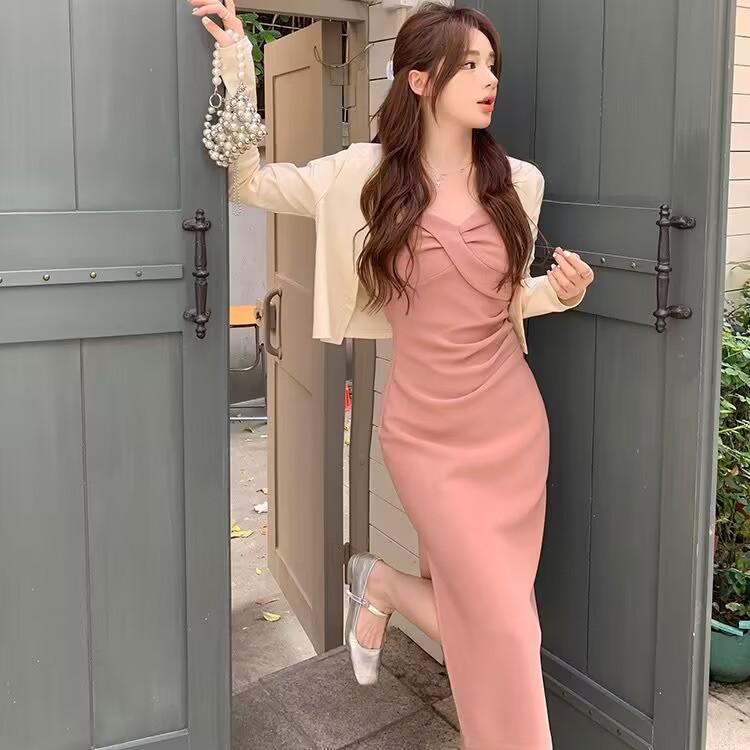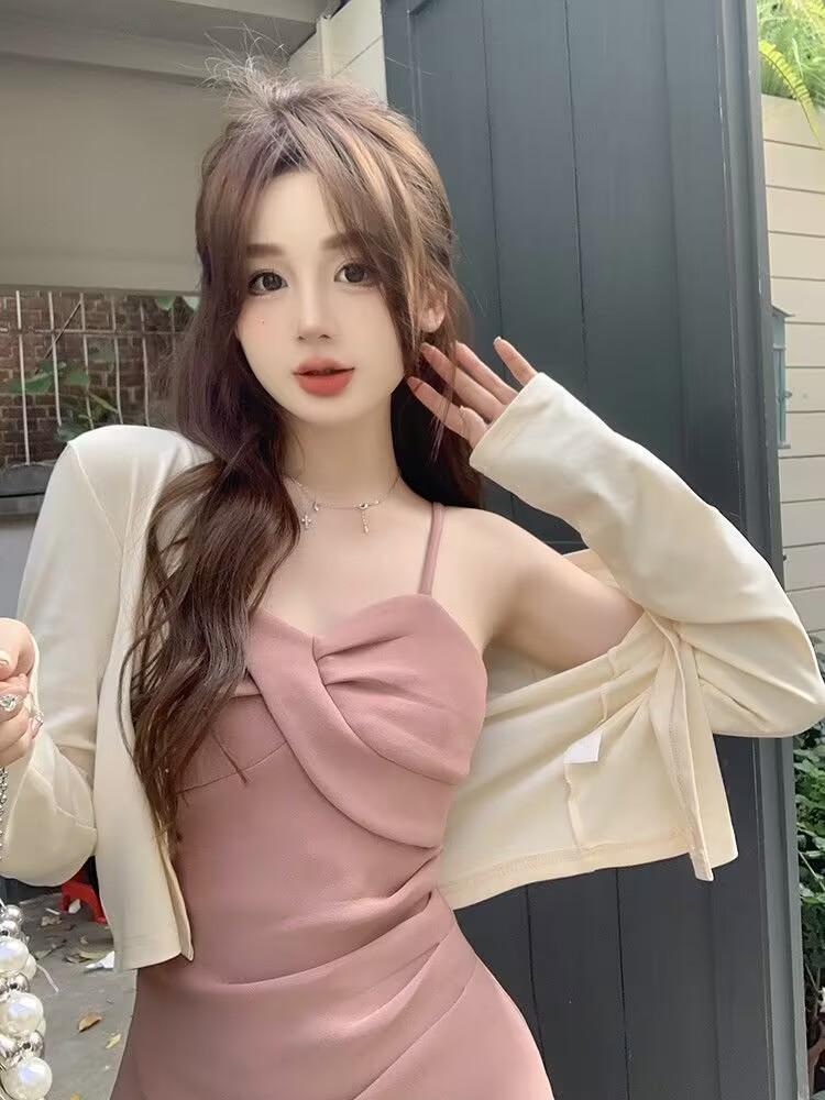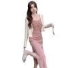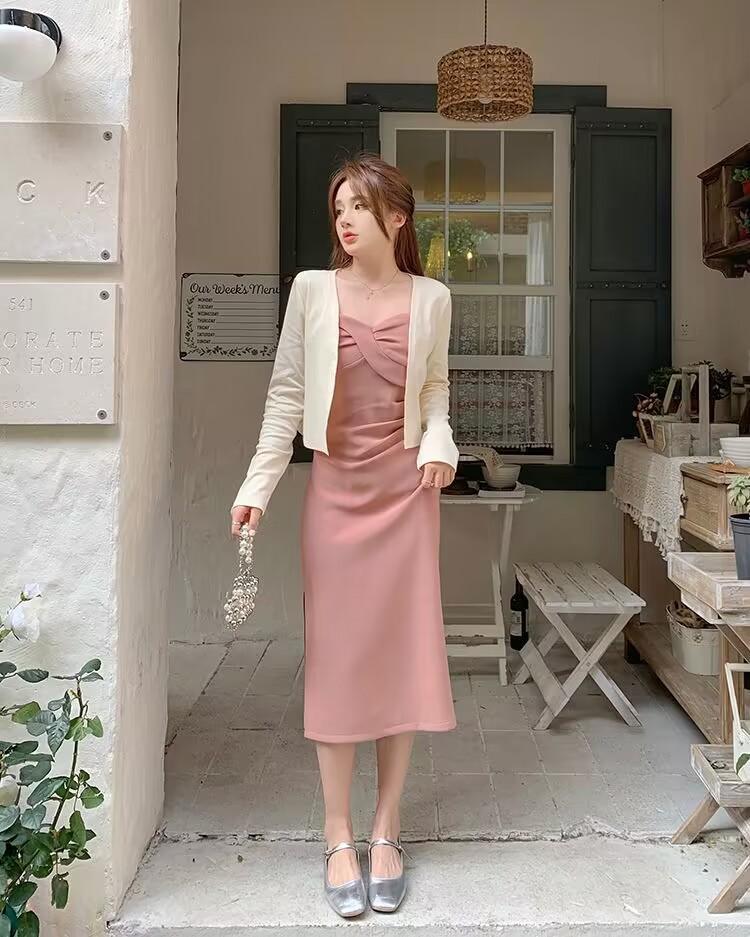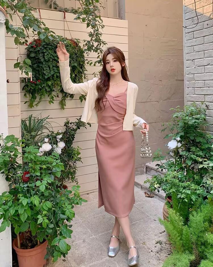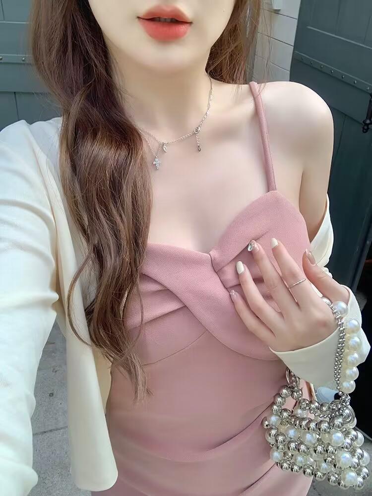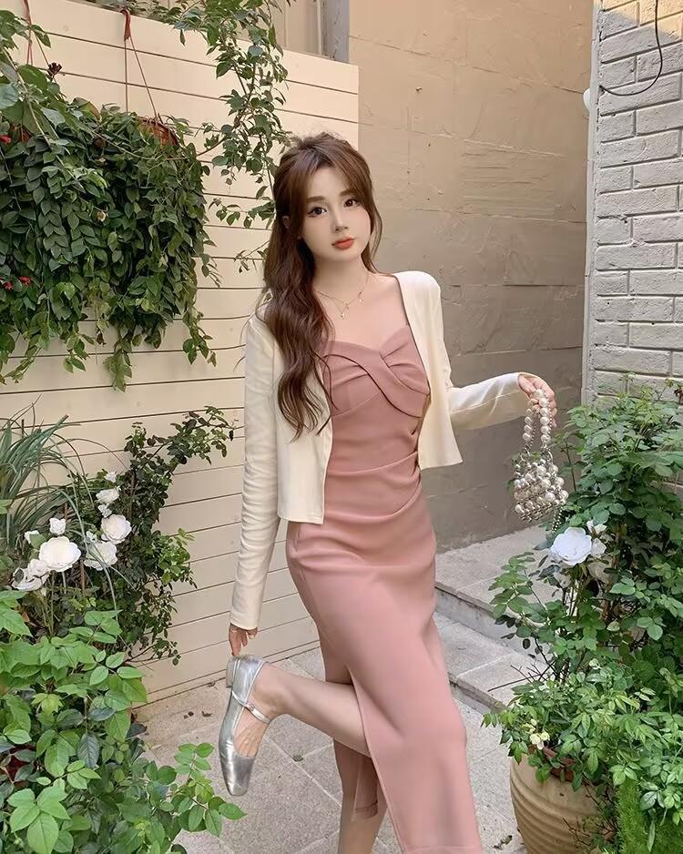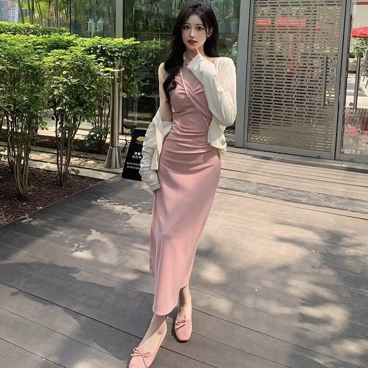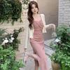 Cárdigan protector solar + falda larga elegante rosa ajustada a la cintura vestido de tirantes verano traje de dos piezas estilo francés mujer