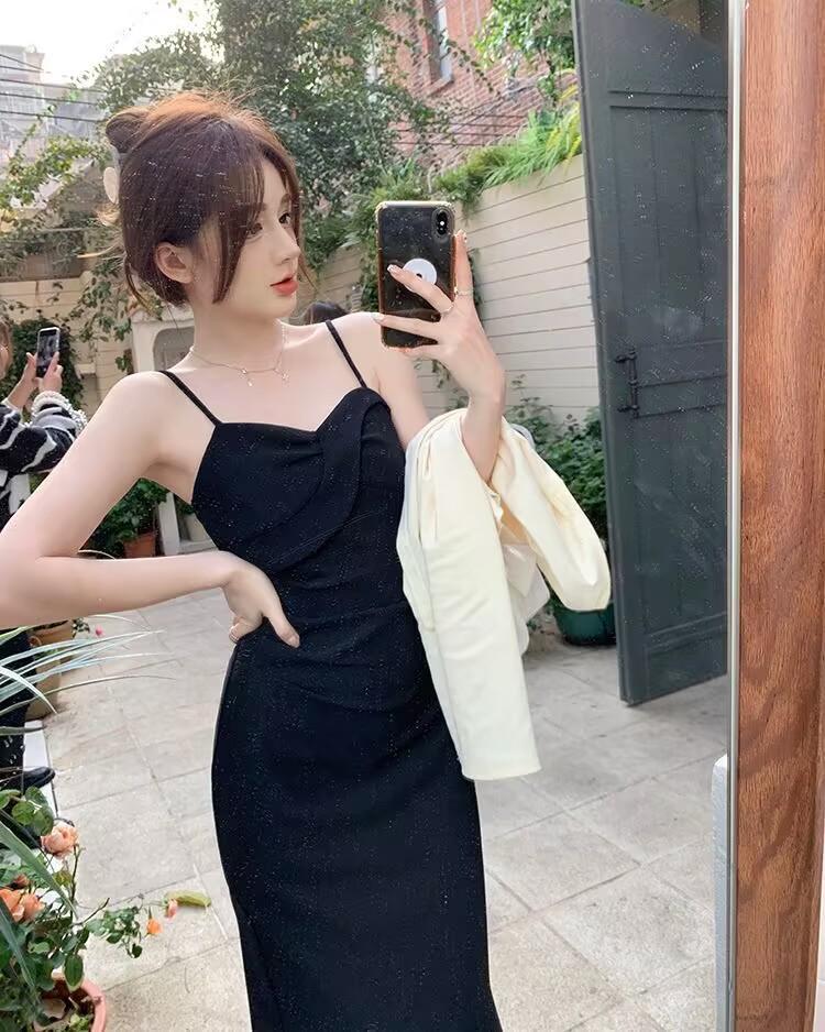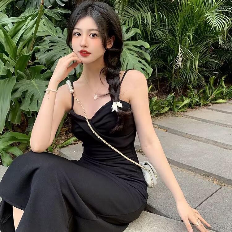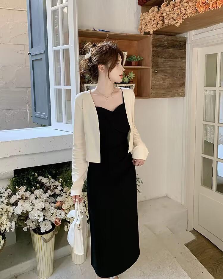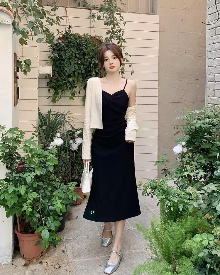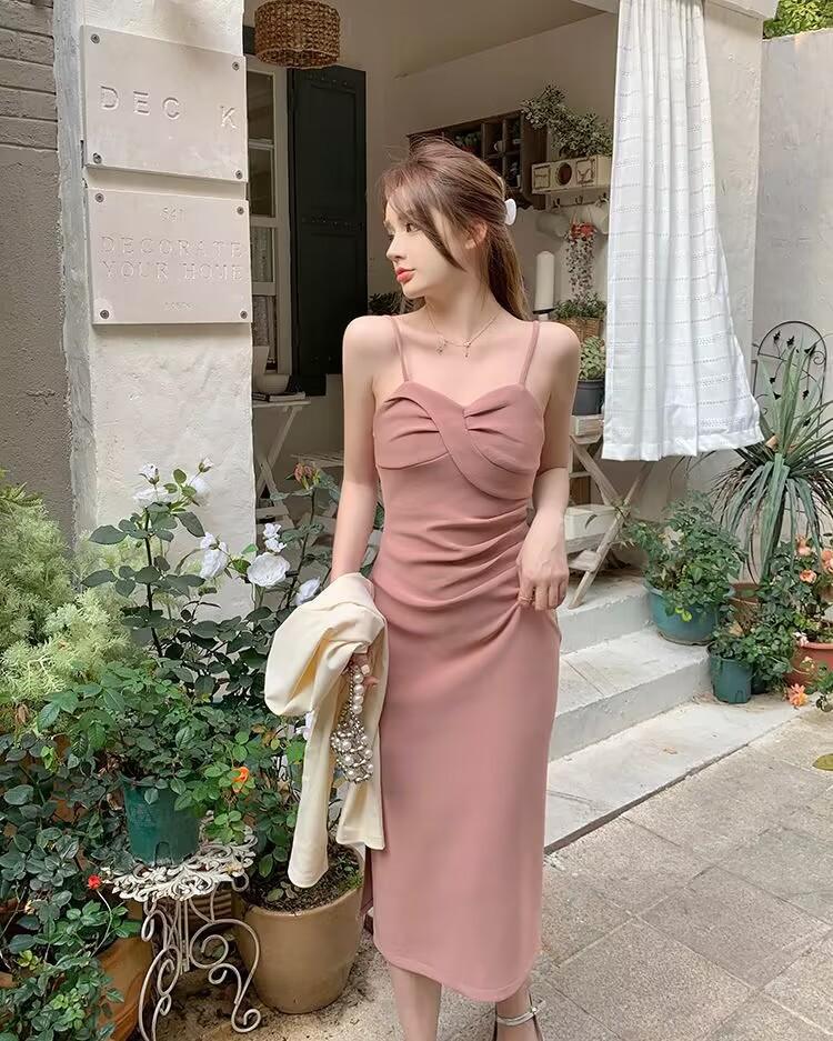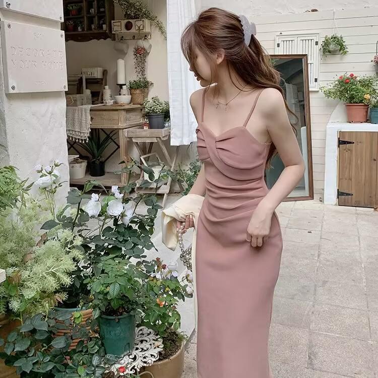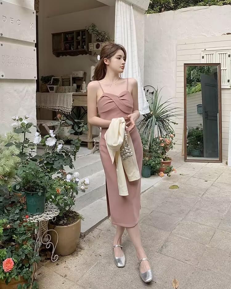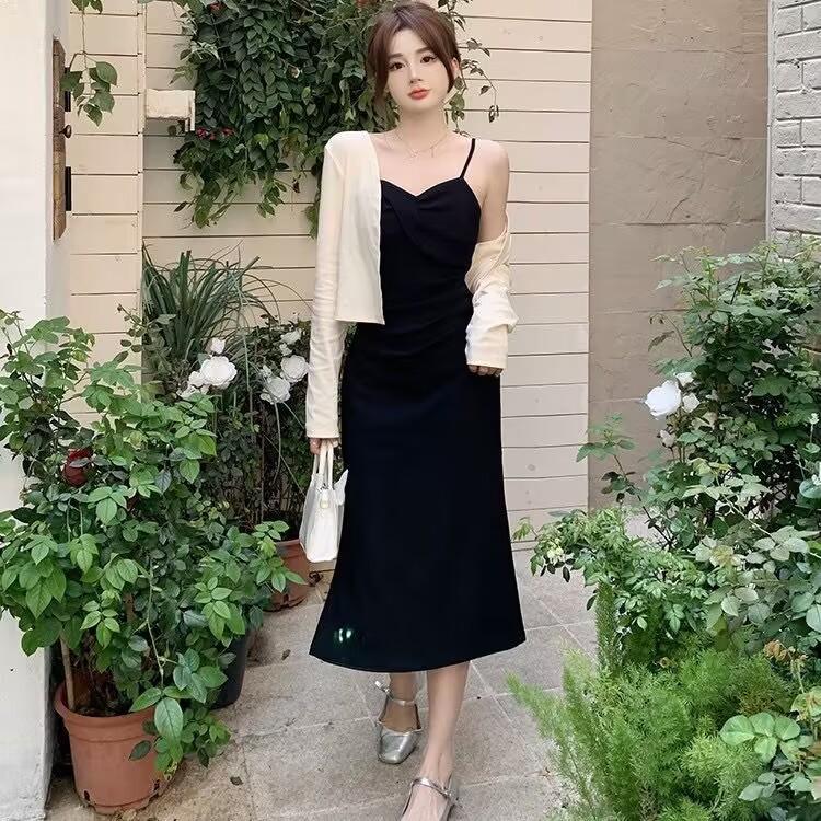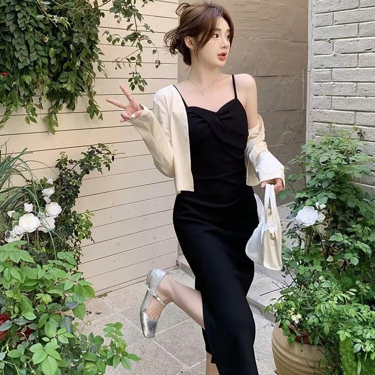 Cárdigan protector solar + falda larga elegante rosa ajustada a la cintura vestido de tirantes verano traje de dos piezas estilo francés mujer